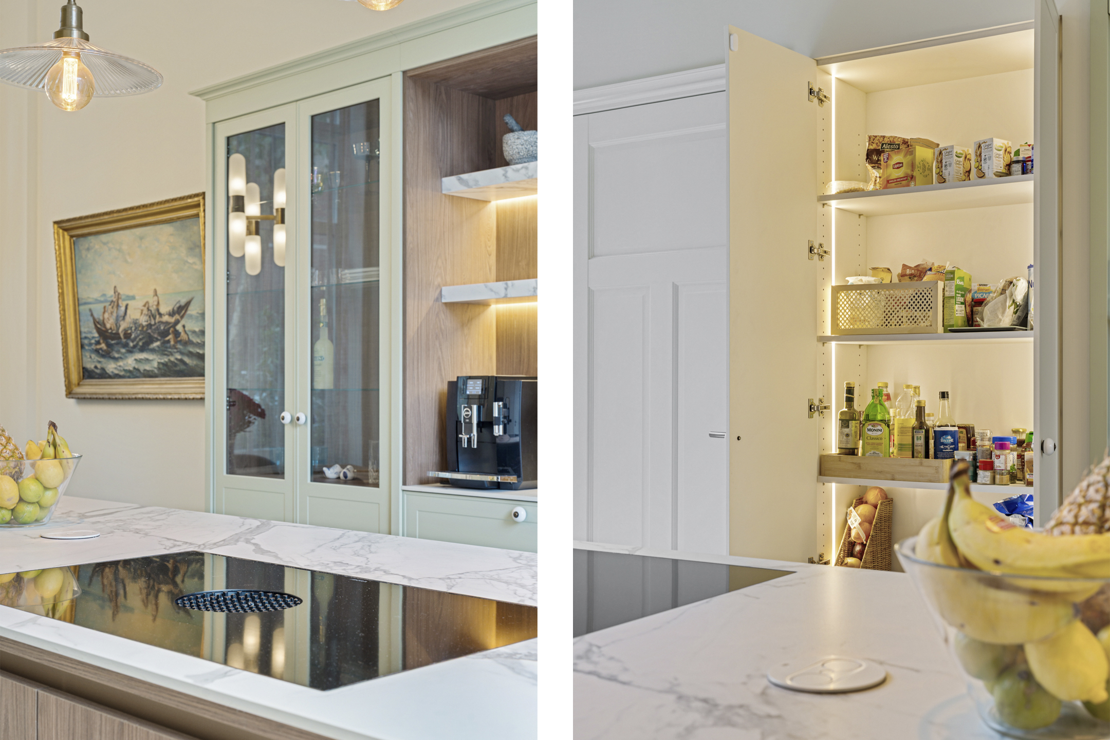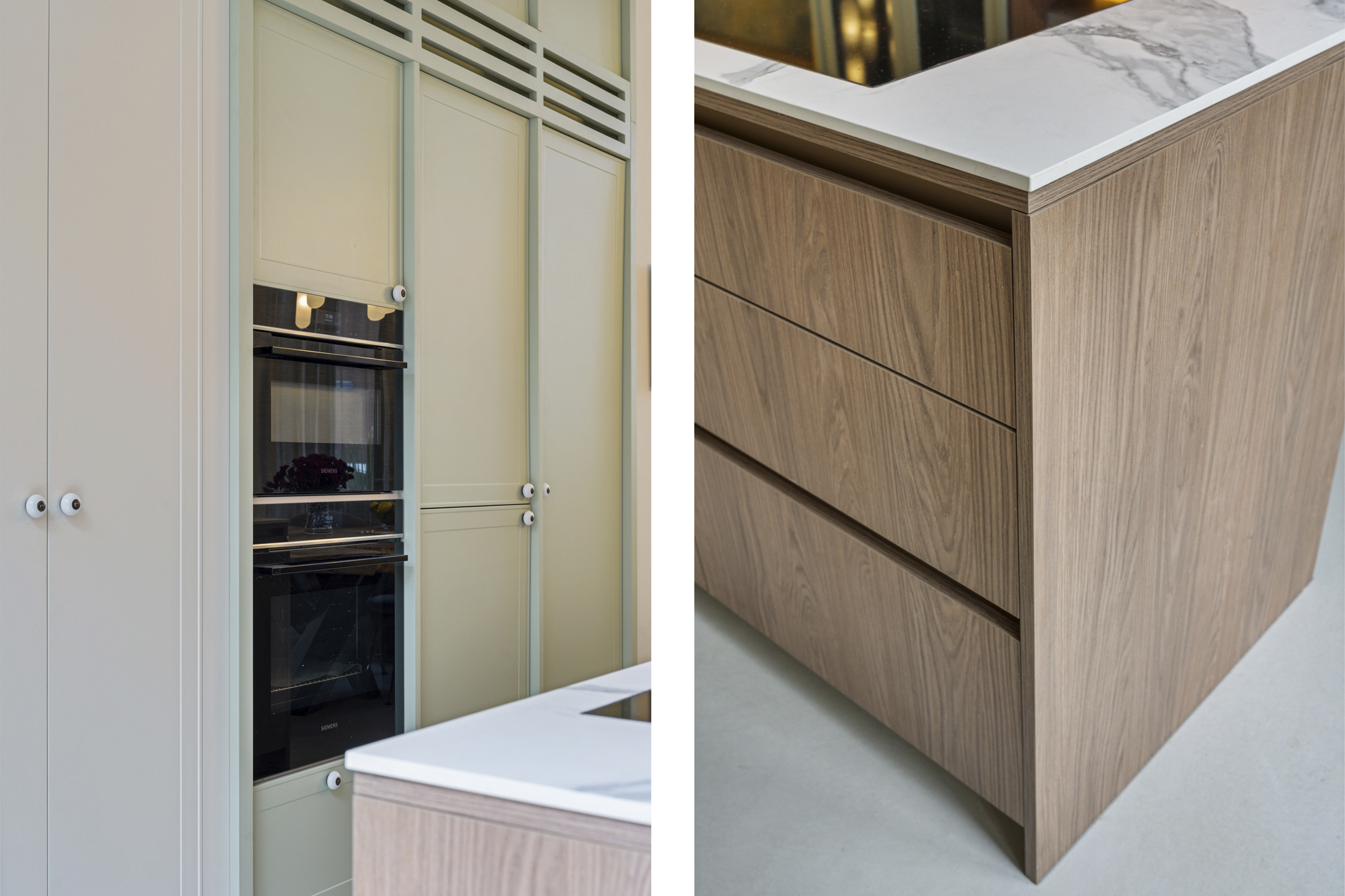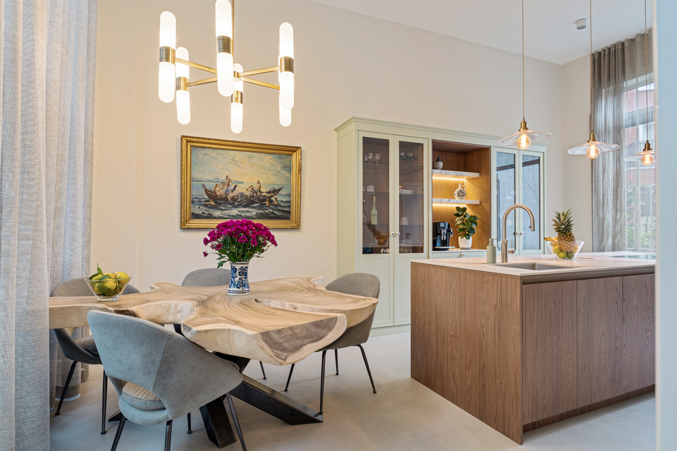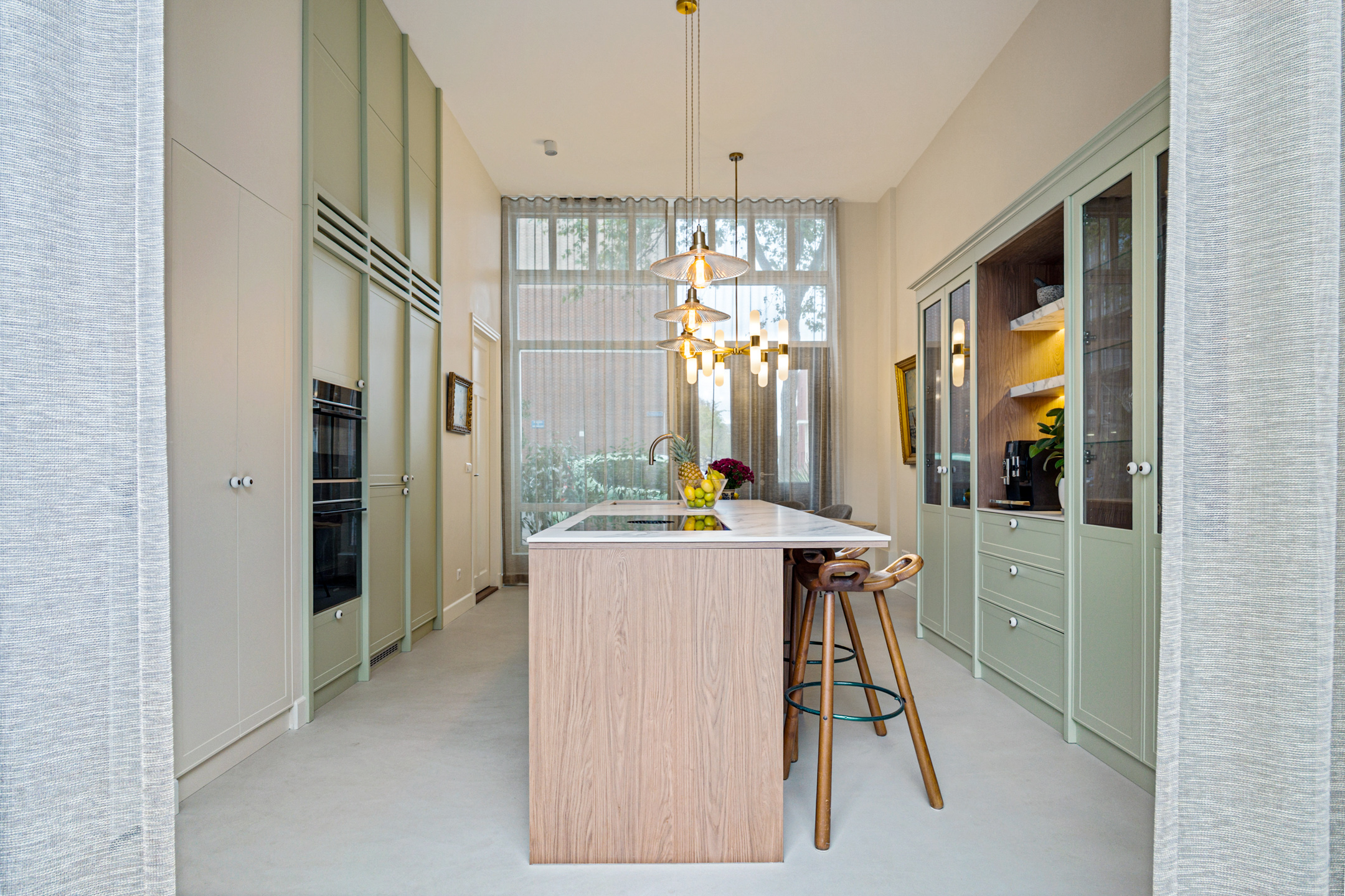 De luxe maatwerk keuken is het kloppende hart van deze verdieping, met o.a. een kookeiland (met Bora inductiekookplaat met interne afzuiging), Quooker, combi-stoomoven en volop kastruimte. Door een zitgedeelte aan het kookgedeelte is dit de ideale keuken om gezellig met gasten of gezelschap een heerlijk maaltijd te bereiden. Openslaande deuren verbinden de keuken met de privétuin, die grenst aan het pad naar de groene gezamenlijke binnentuin. Een heerlijke plek om gezellig samen te komen