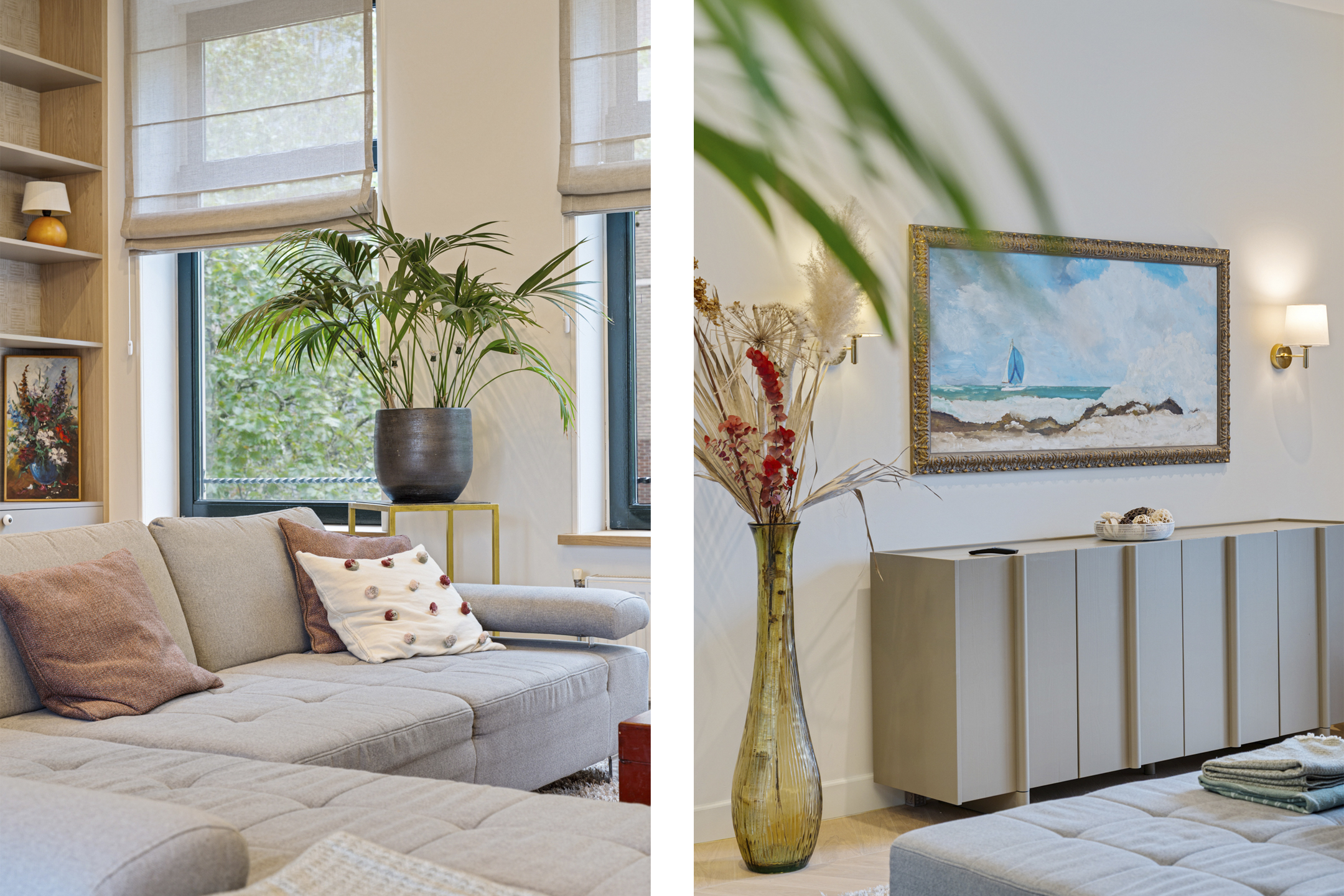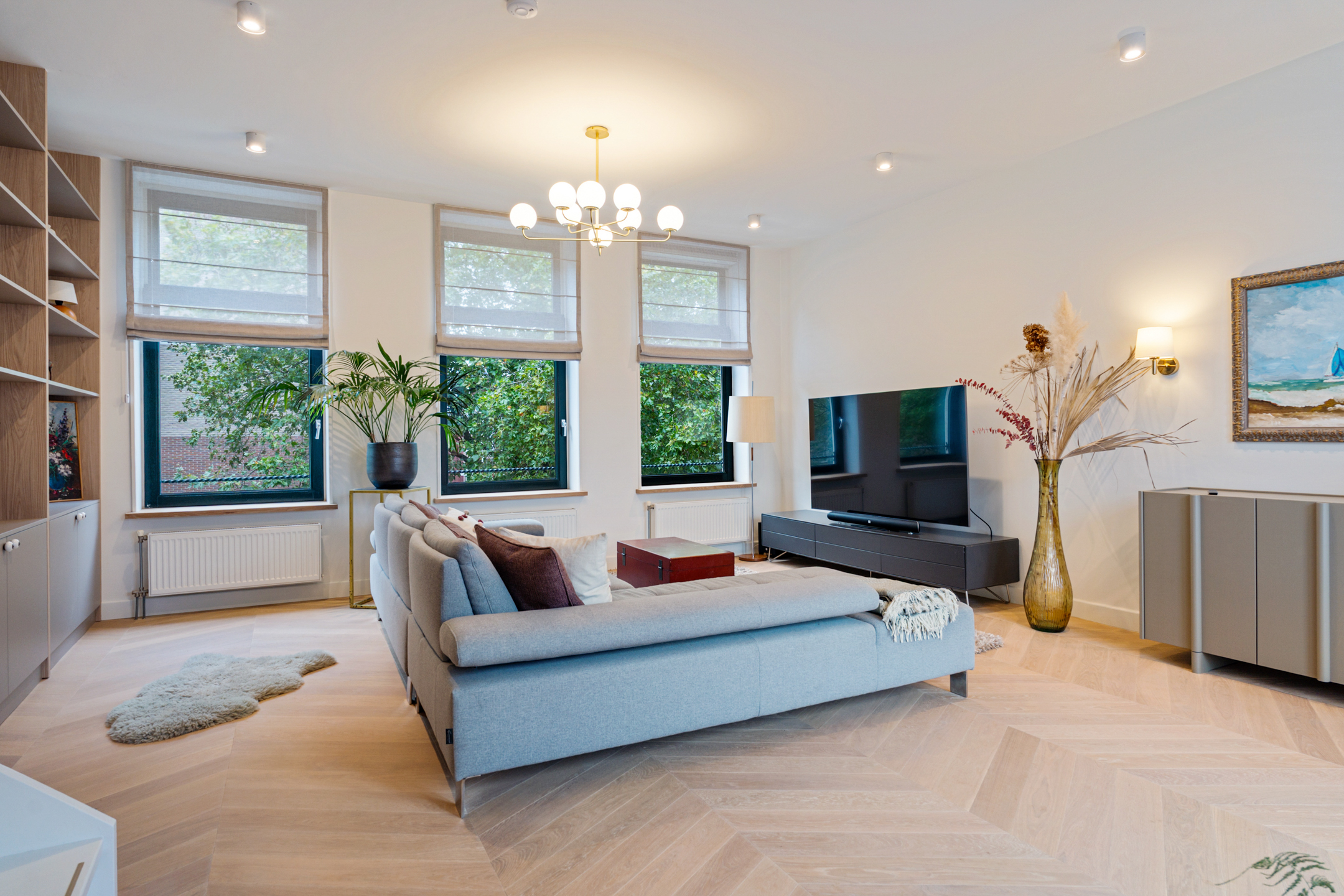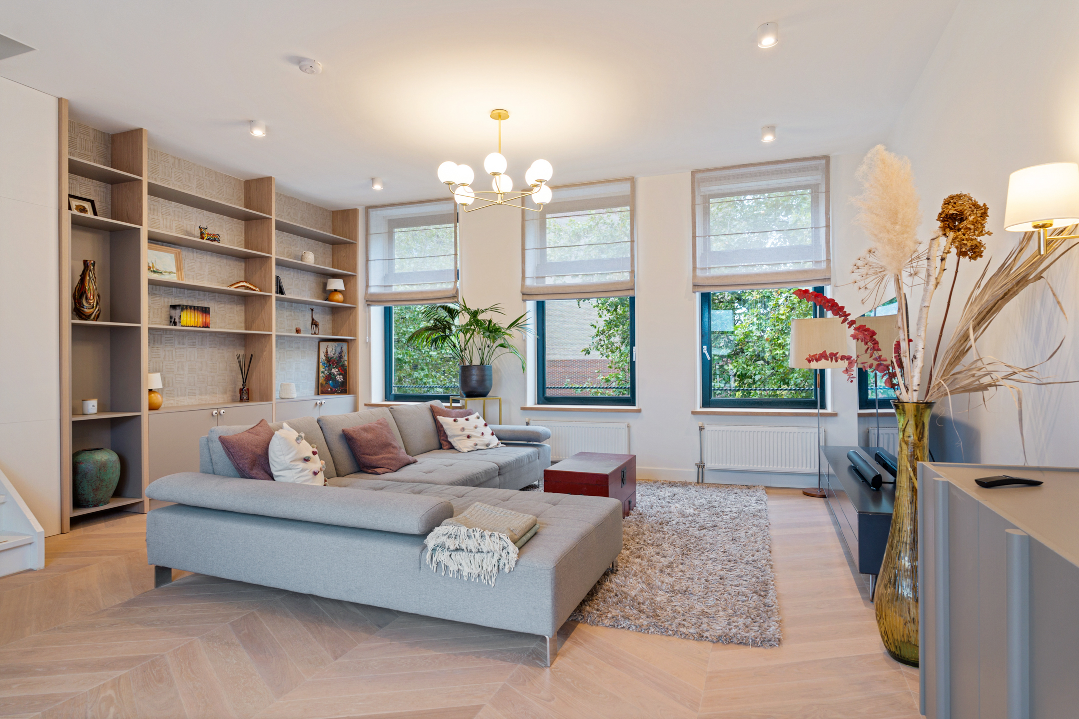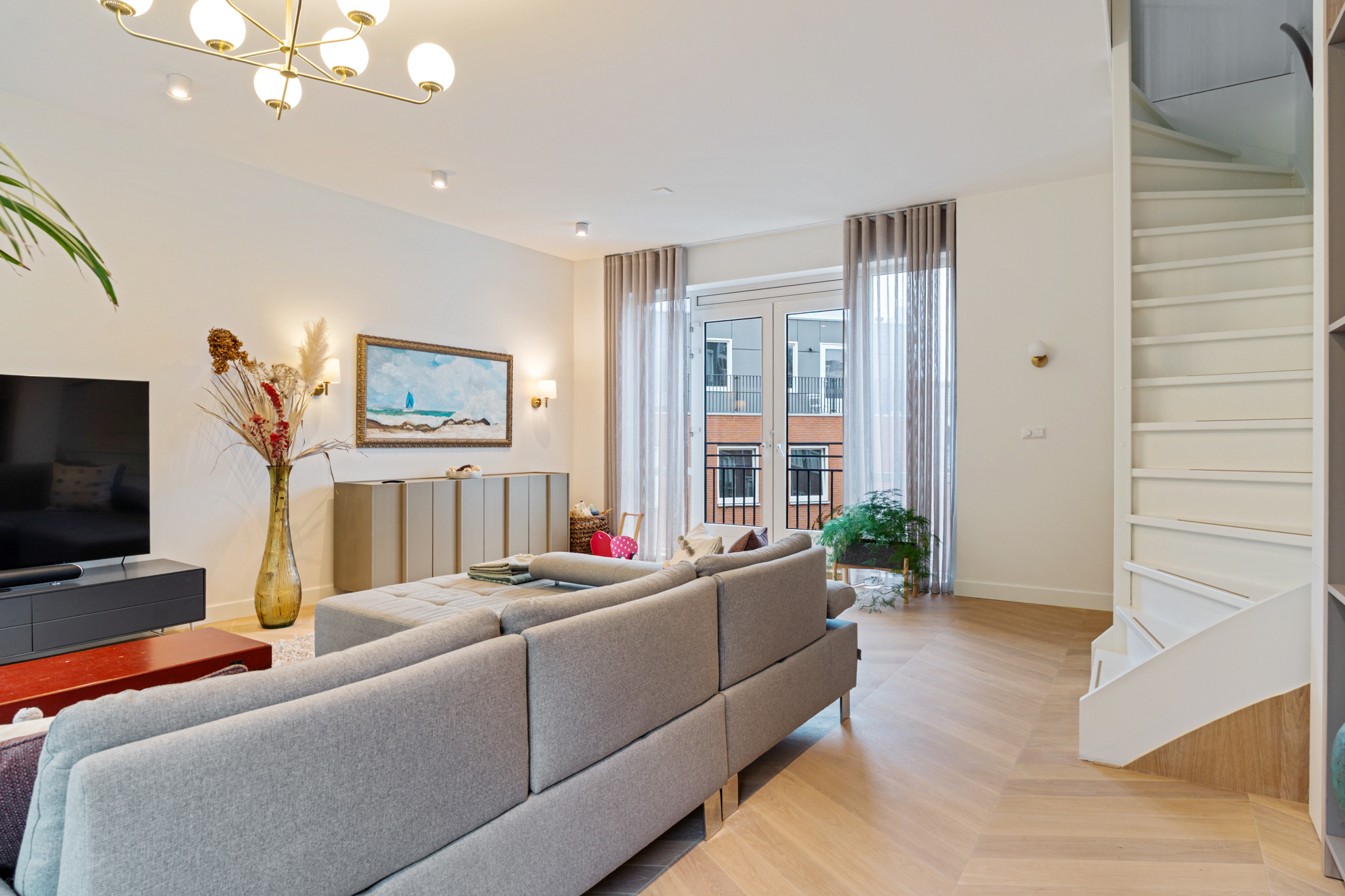 De volledige tweede verdieping is in gebruik als woonkamer. Dankzij de grote raampartijen aan voor- en achterzijde valt het licht naar binnen. De ruimte is strak en stijlvol afgewerkt met een Hongaarse punt eiken vloer, sfeervolle verlichting, maatwerk details en zachte tinten.