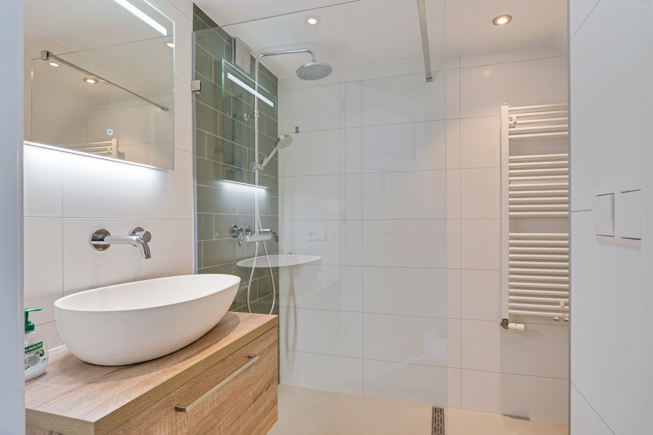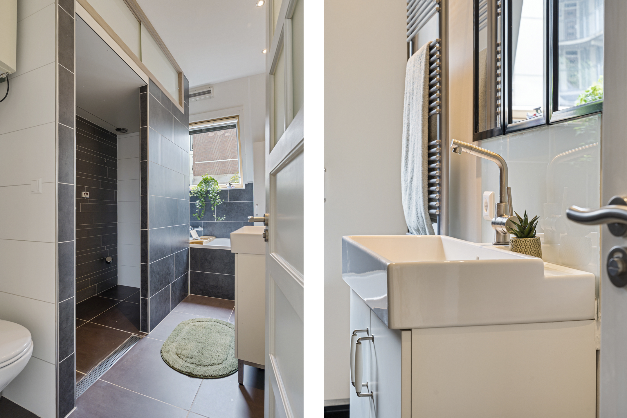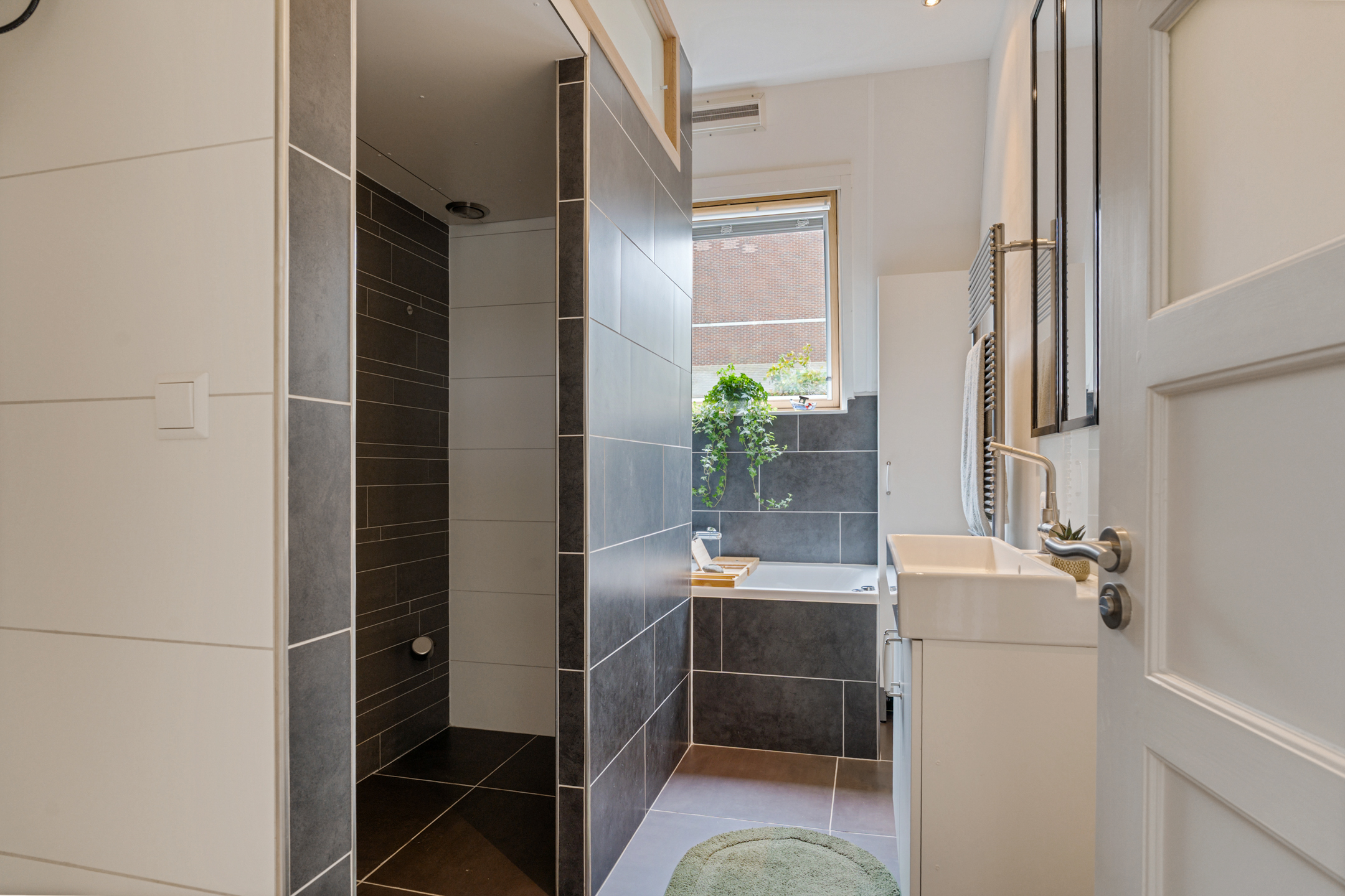 Op de begane grond is ook de eerste moderne badkamer te vinden. De badkamer is voorzien van een wandcloset, inloopdouche, extra kastruimte onder de trap en strak tegelwerk. Ideaal voor gasten of als extra comfort.