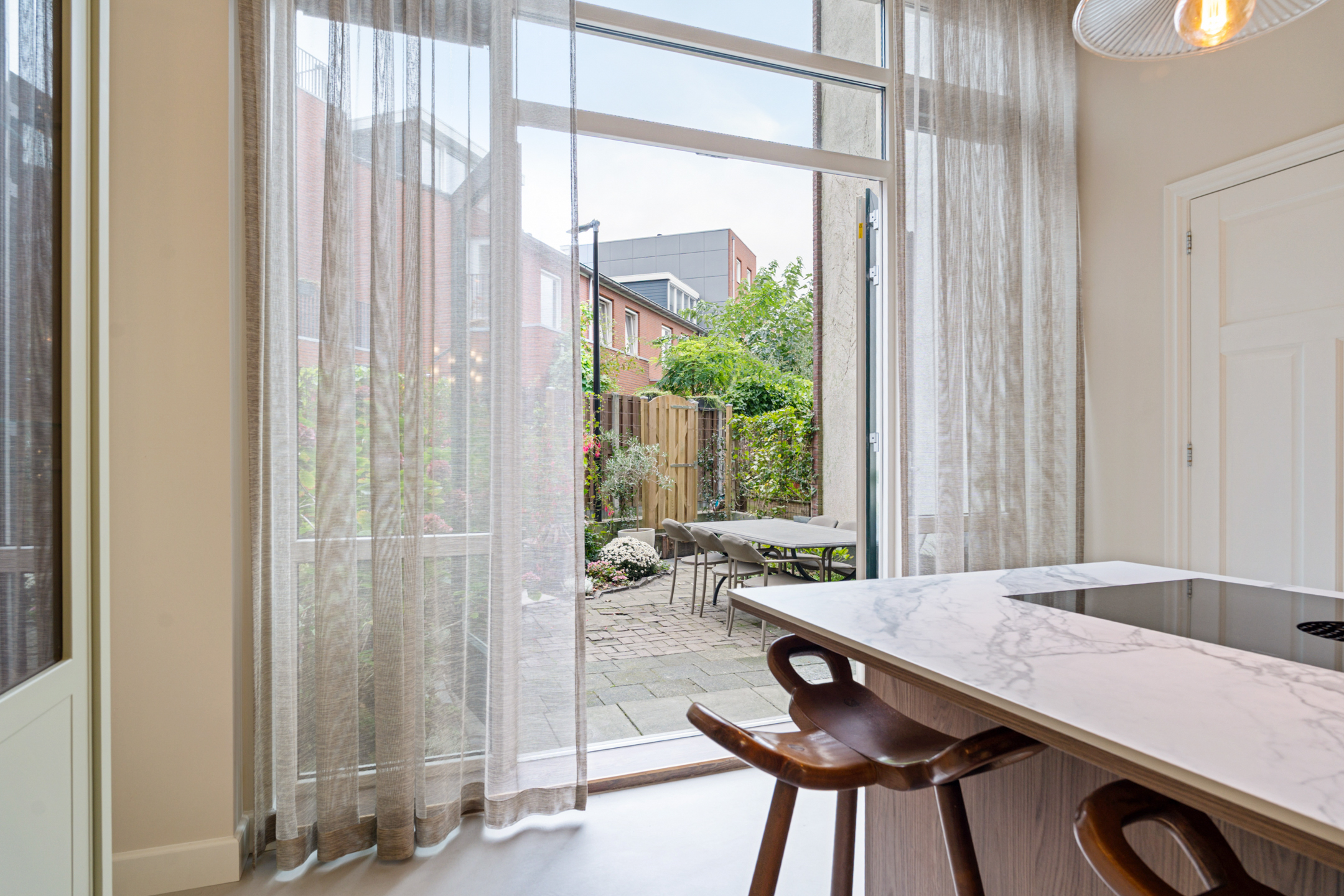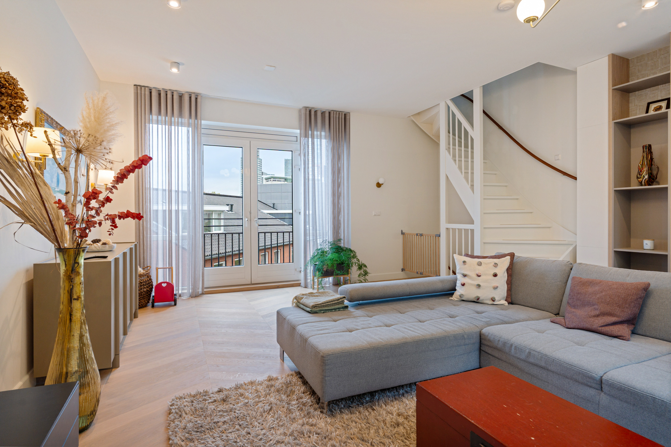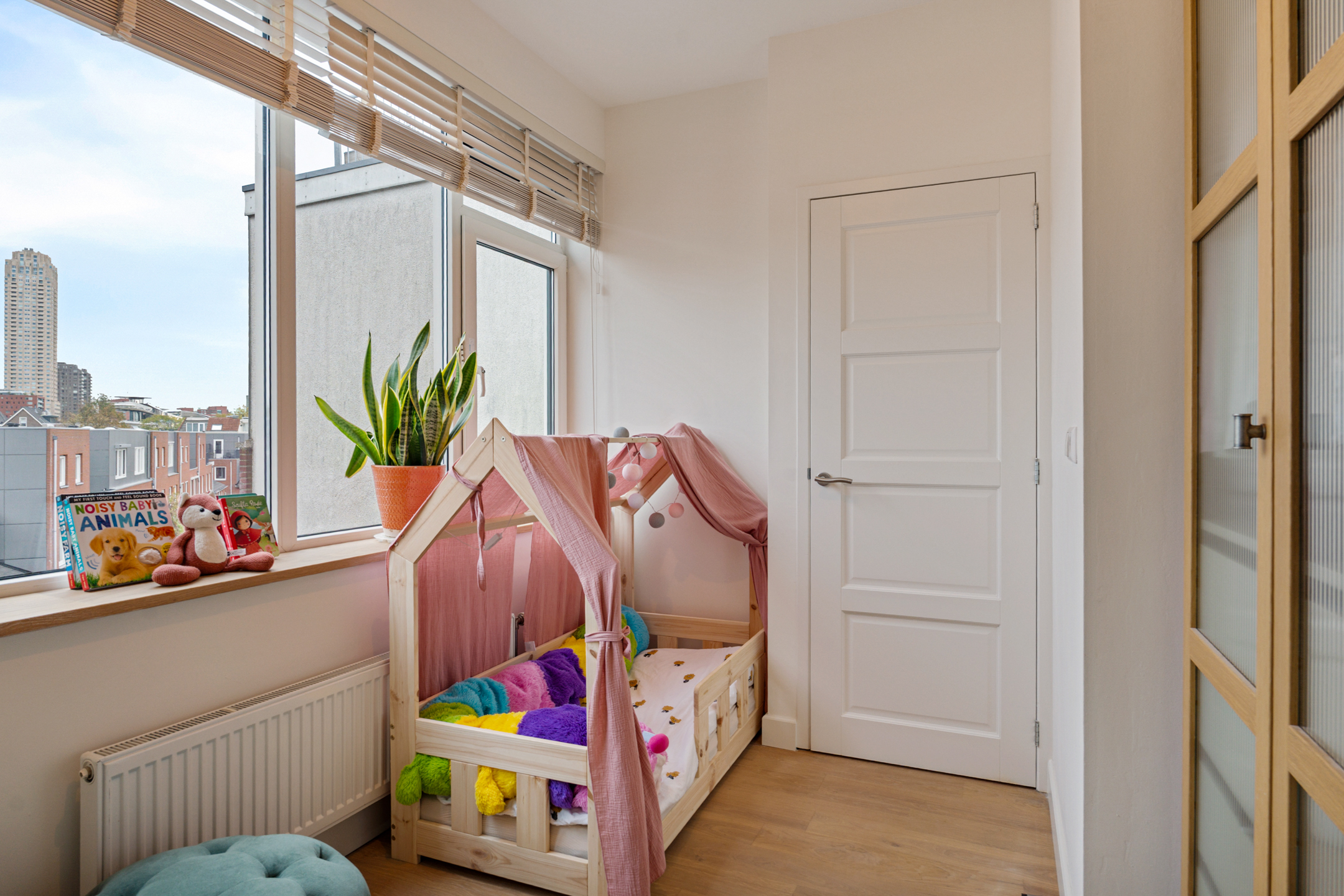 De keuze om de woonkamer op de tweede verdieping te plaatsen pakt geweldig uit. Zo kijk je vanuit de woonkamer al uit op de eerste Wolkenkrabber van de Wilhelminapier.