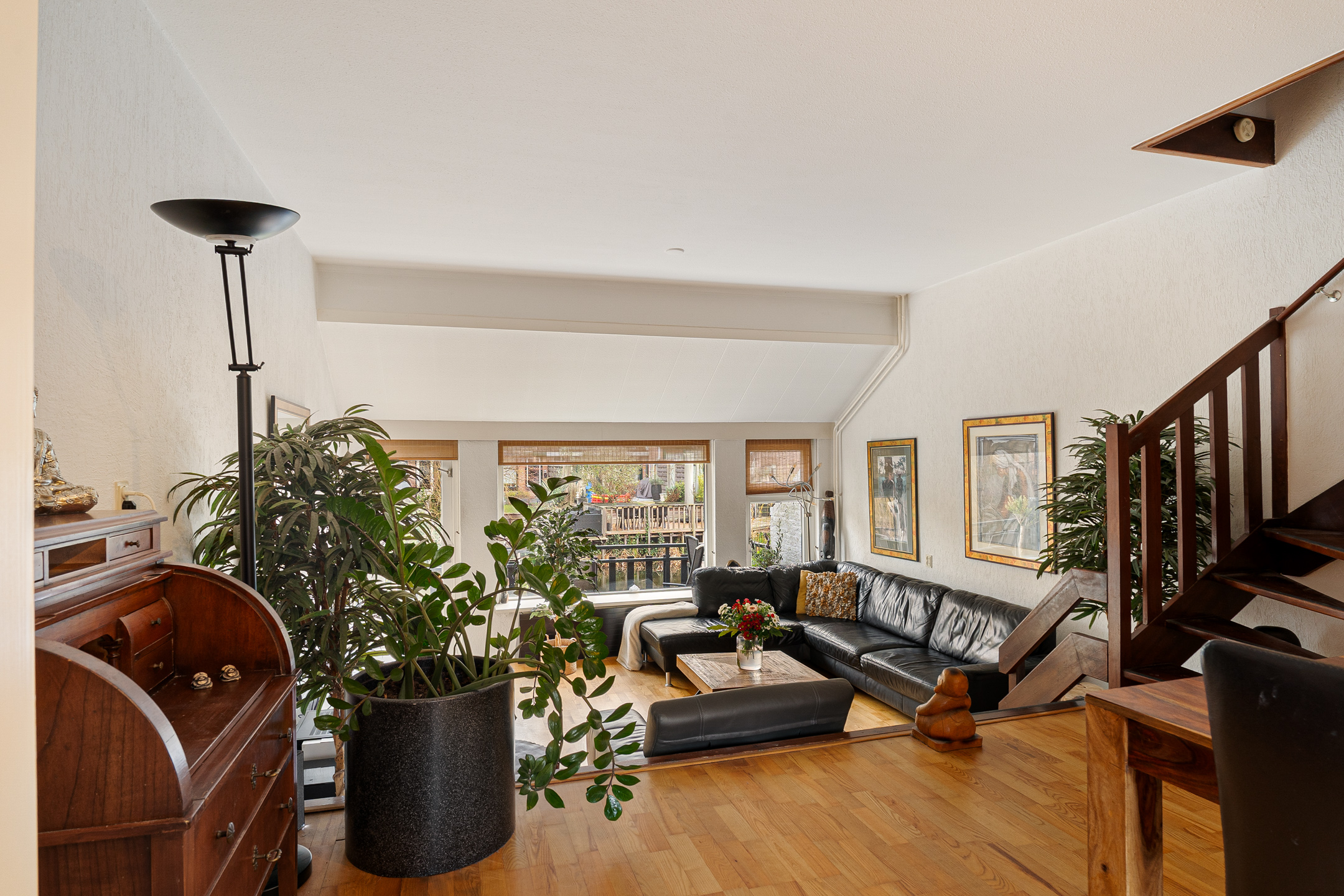 De woonkamer is royaal en licht, met een oppervlakte van circa 36 m². Aan de achterzijde zorgt de extra hoge plafondhoogte voor een ruimtelijk en open gevoel. De houten parketvloer geeft de ruimte een warme en stijlvolle uitstraling.
