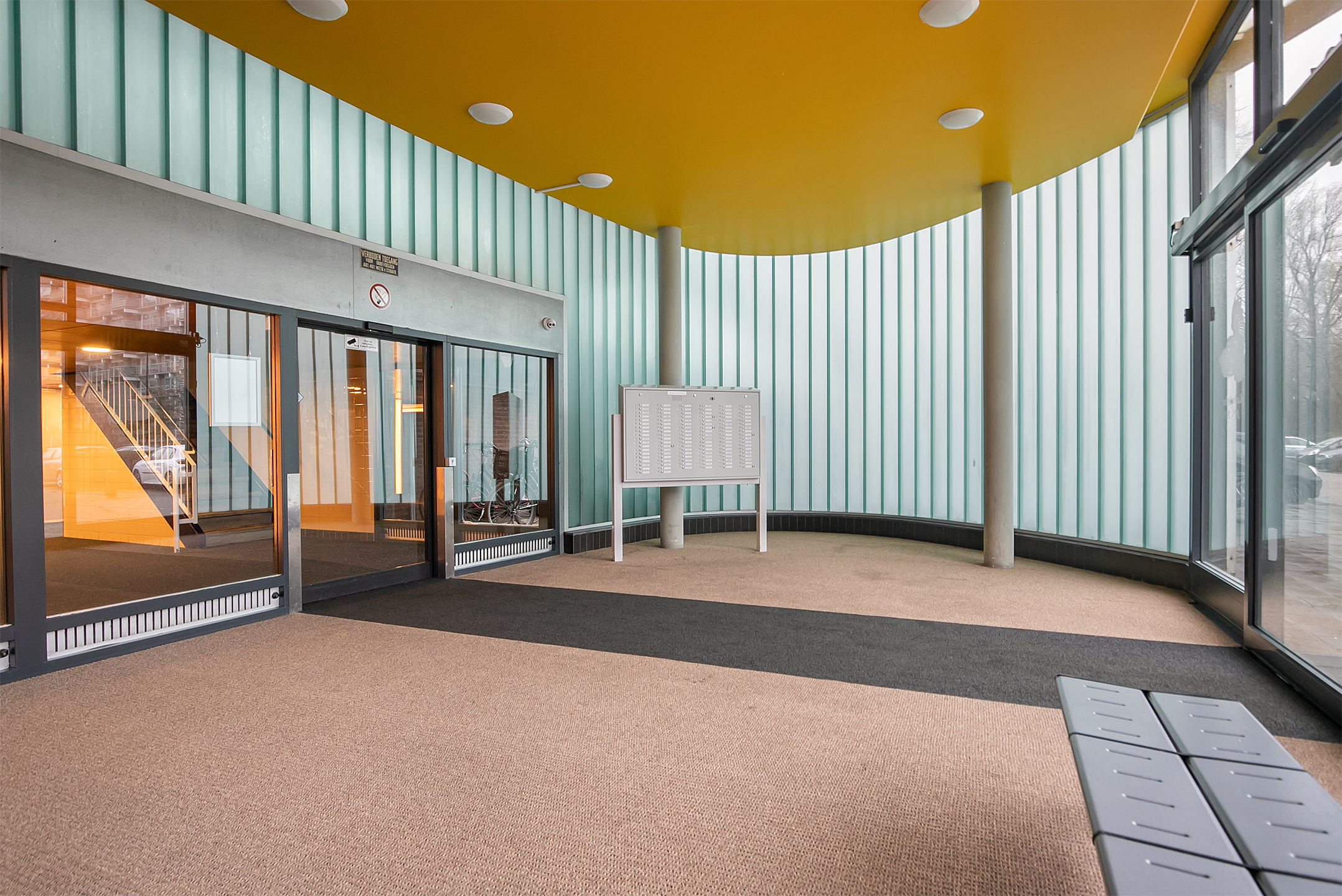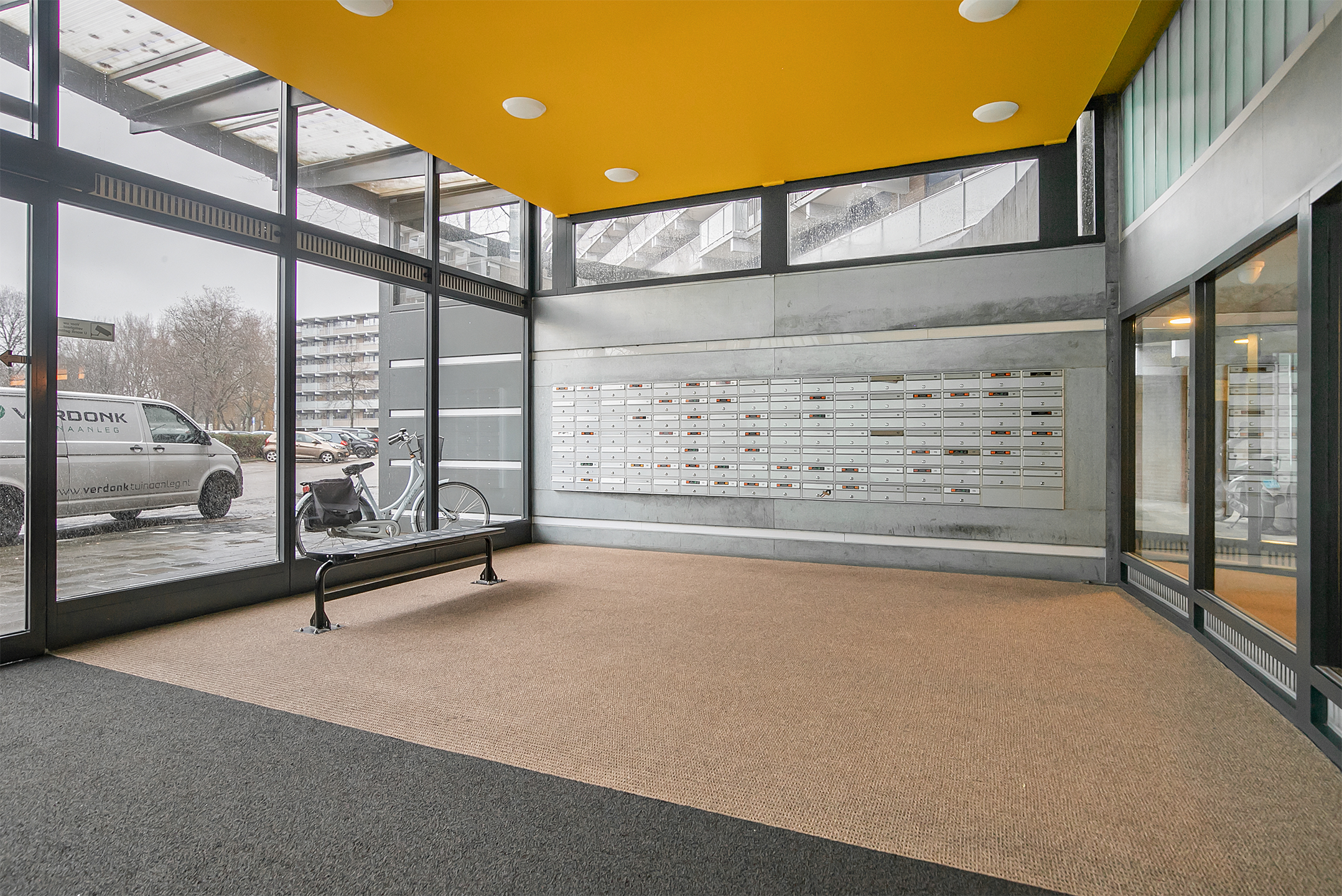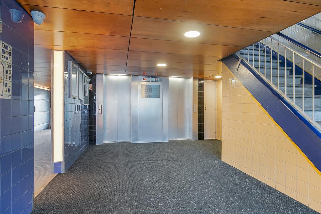 De centrale entree op de begane grond is afgesloten en voorzien van brievenbussen, een bellentableau met videofoon en toegang tot zowel het trappenhuis als de lift. De entree is netjes onderhouden en geeft een verzorgde eerste indruk.