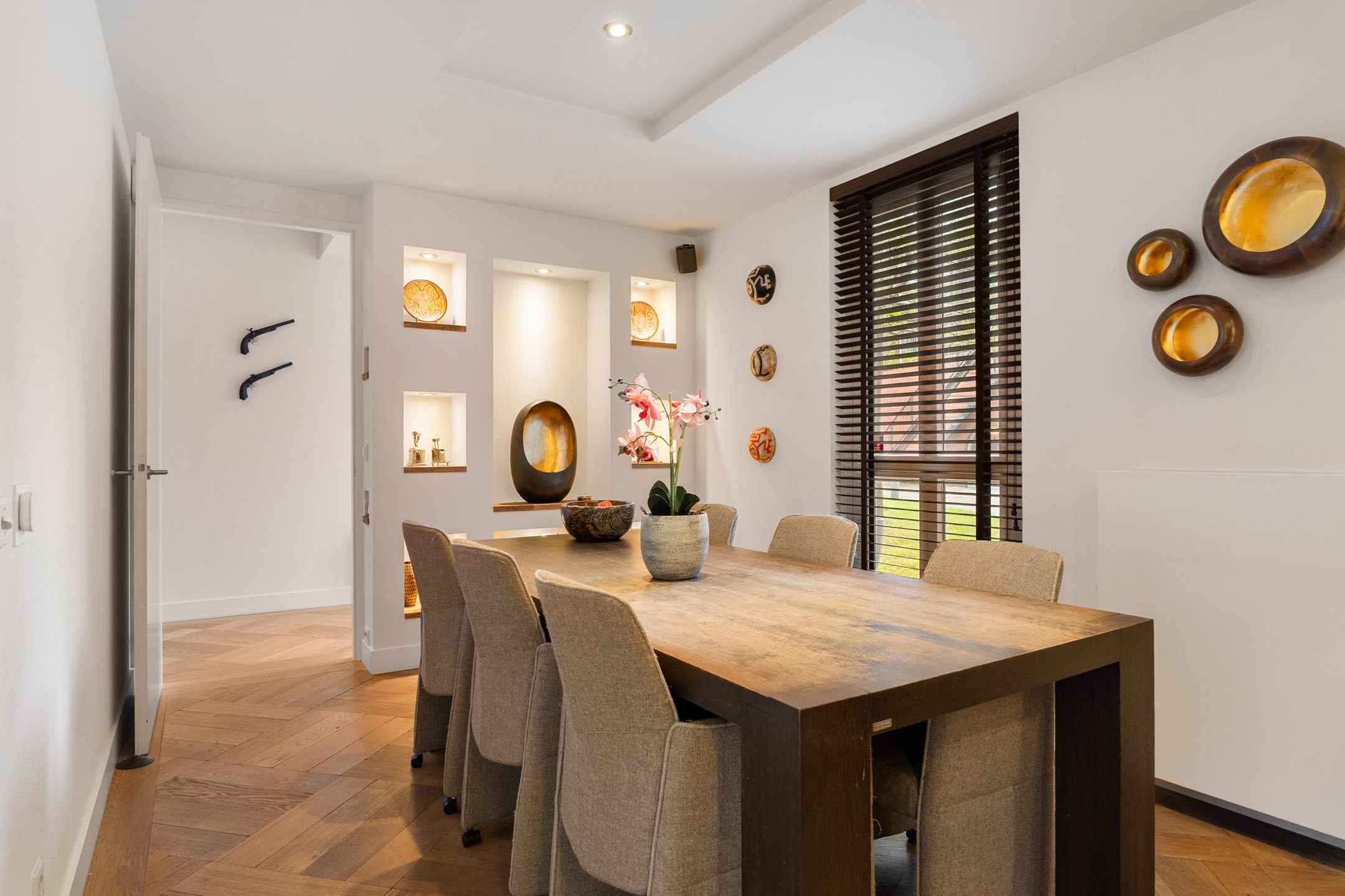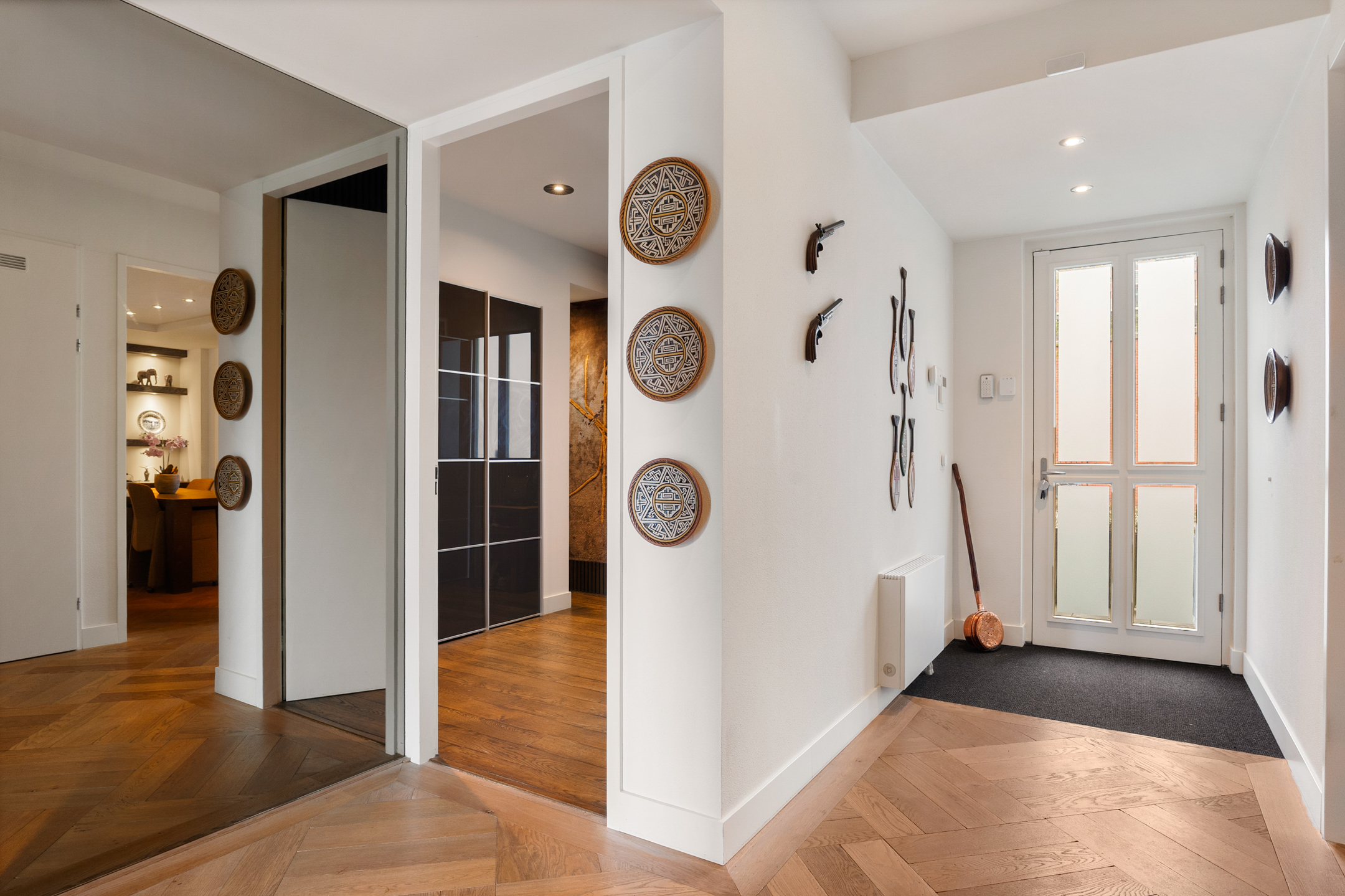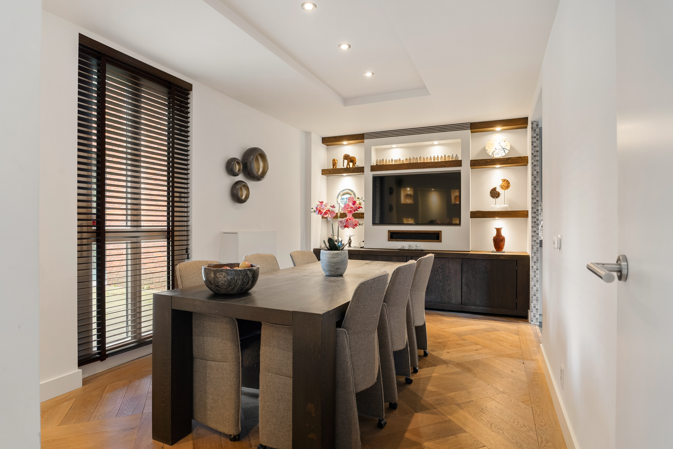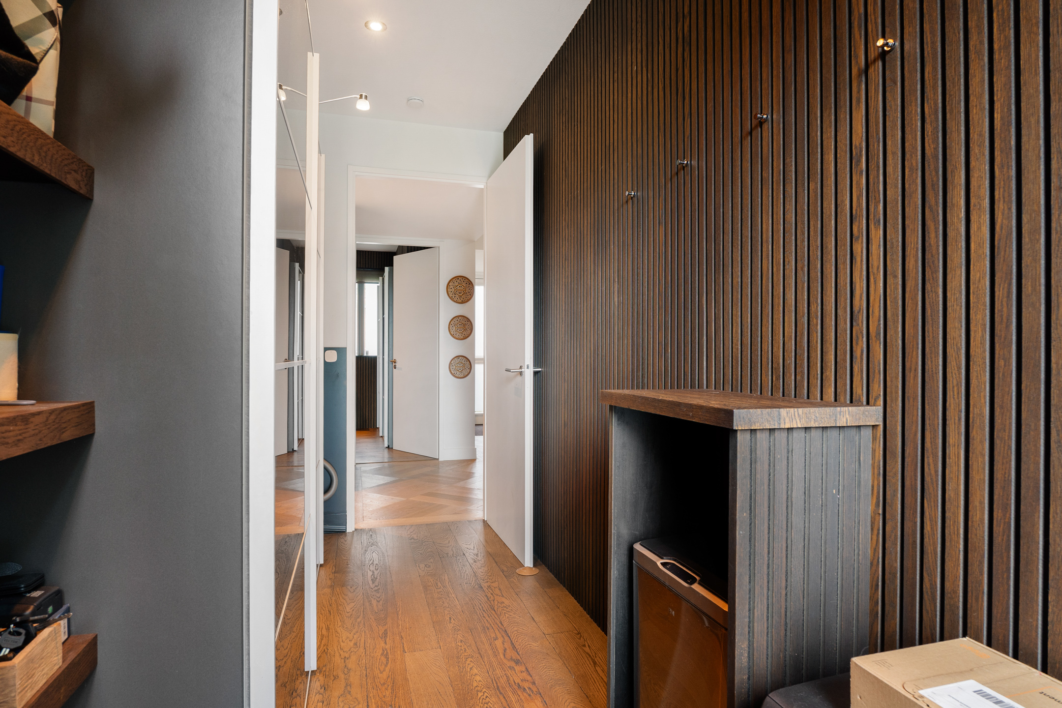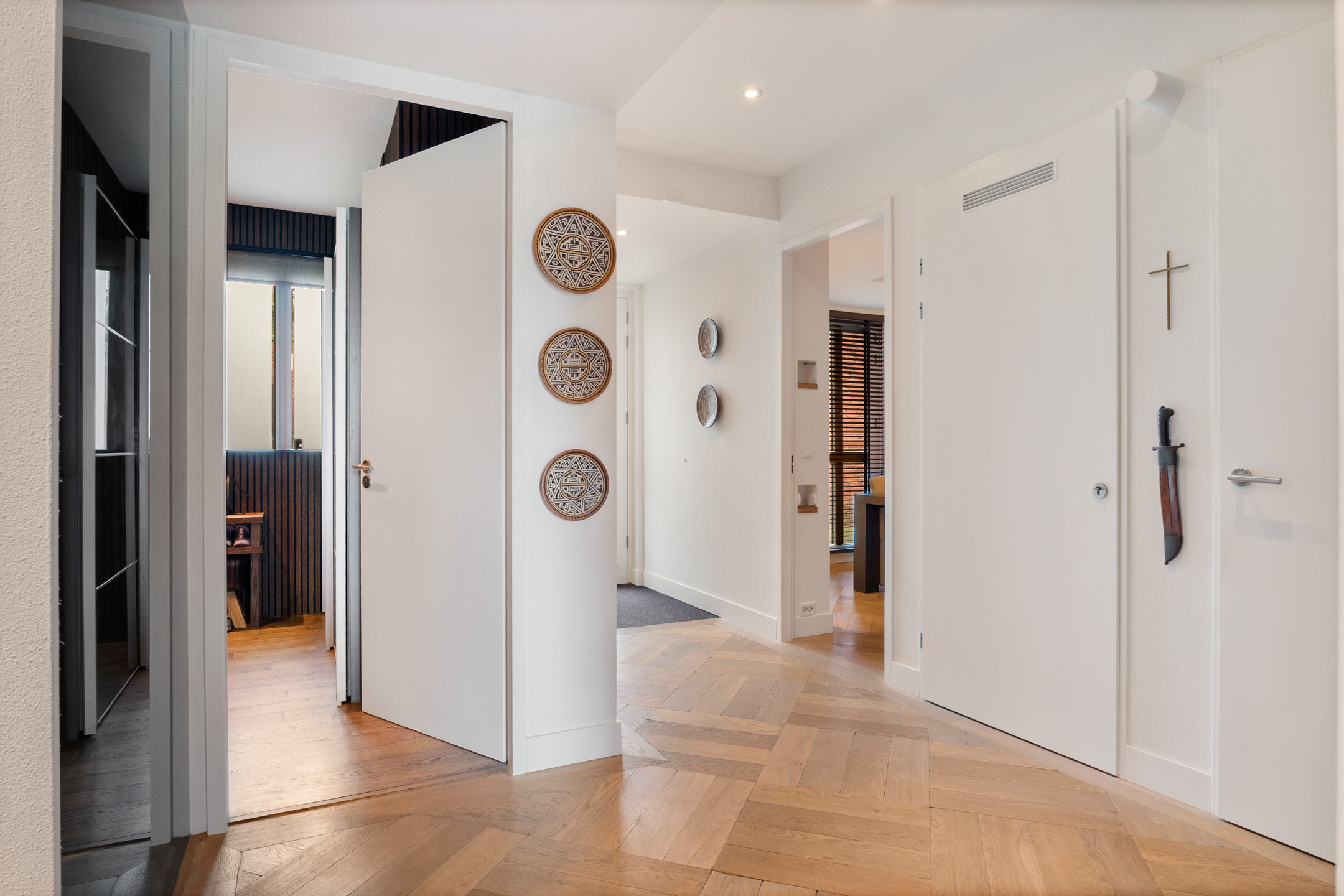 Bij binnenkomst in het appartement valt meteen de royale hal op. Hier vind je het toilet met fonteintje, een praktische berg-/provisiekast met wasmachineaansluiting en de meterkast. Aan de voorzijde ligt de eetkamer, die in open verbinding staat met de luxe keuken.