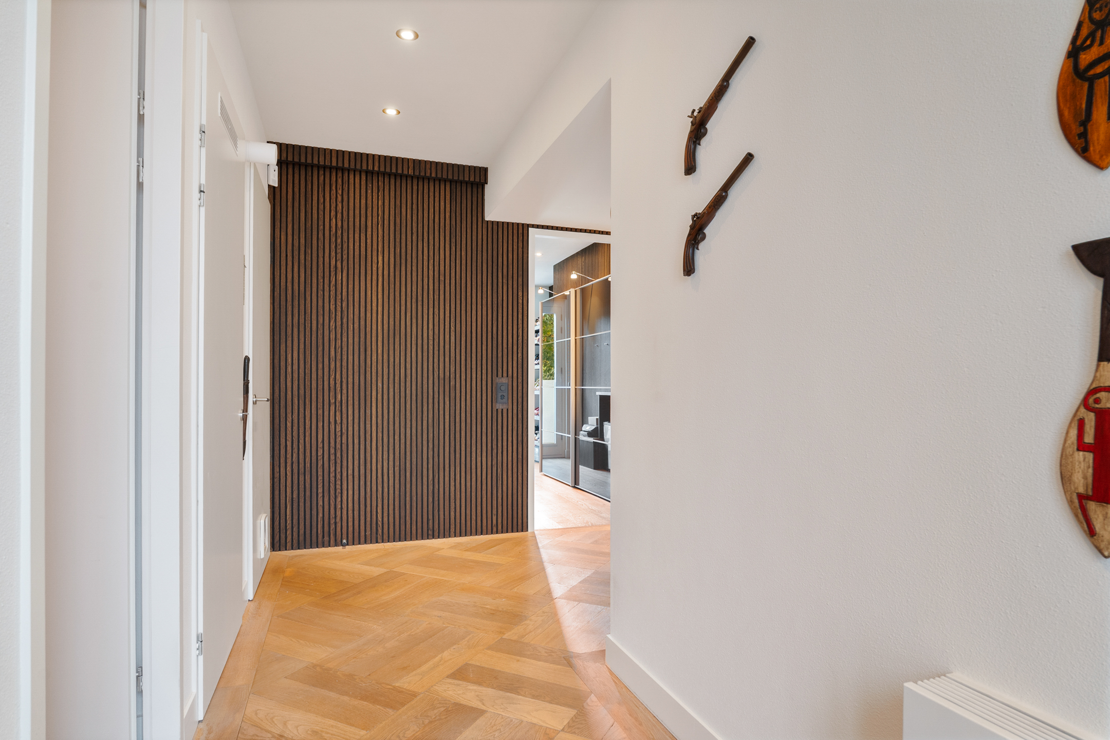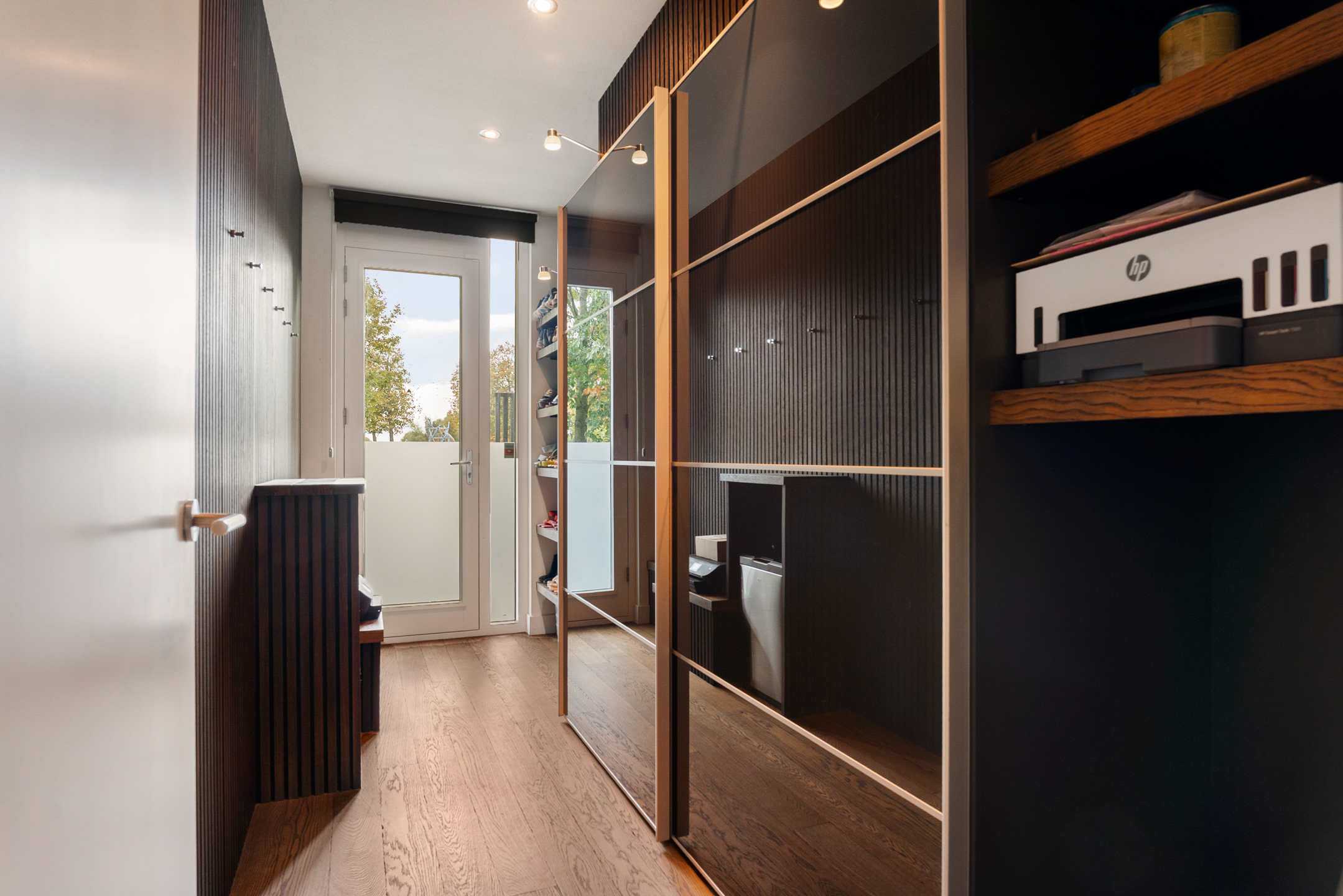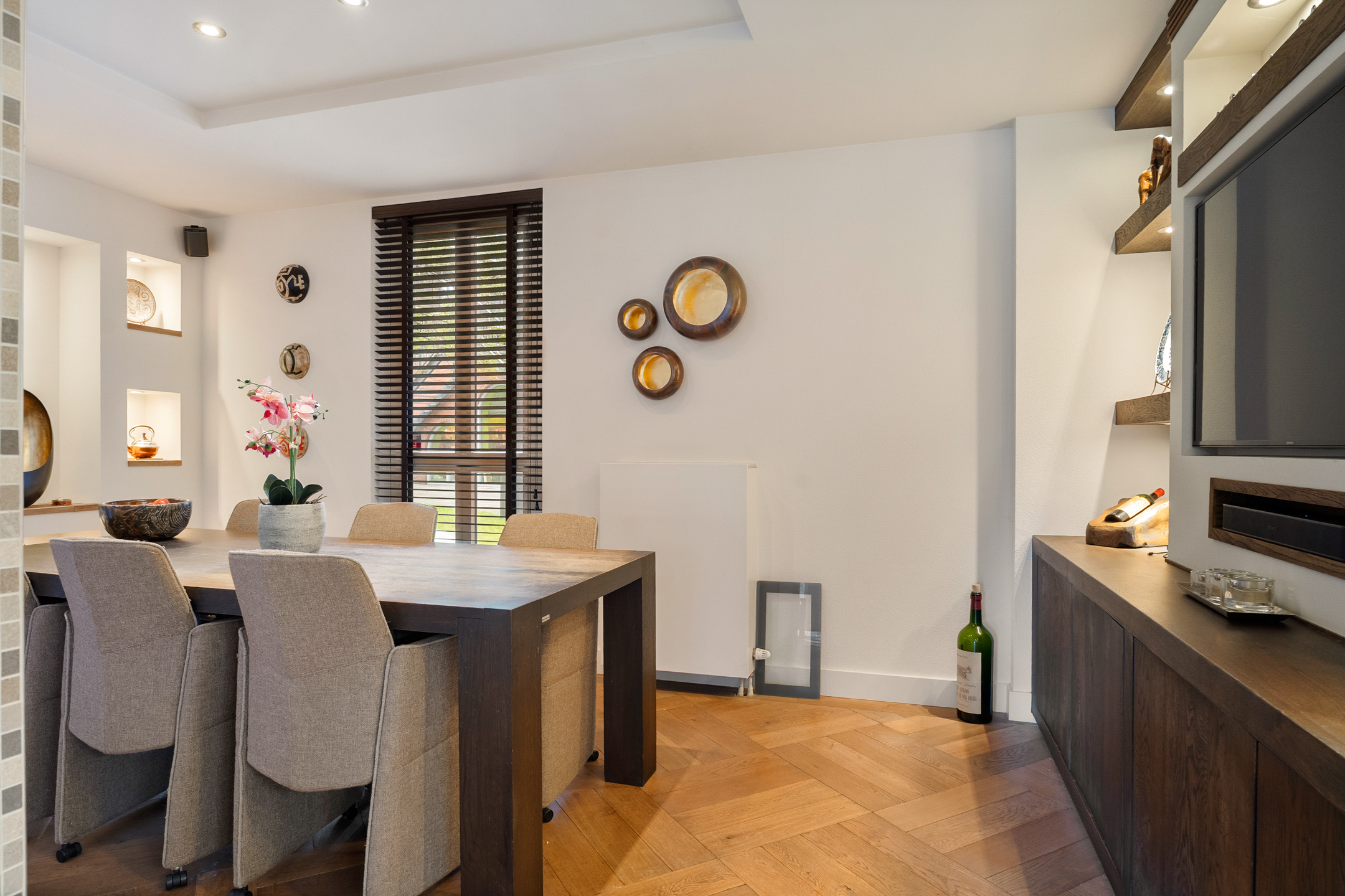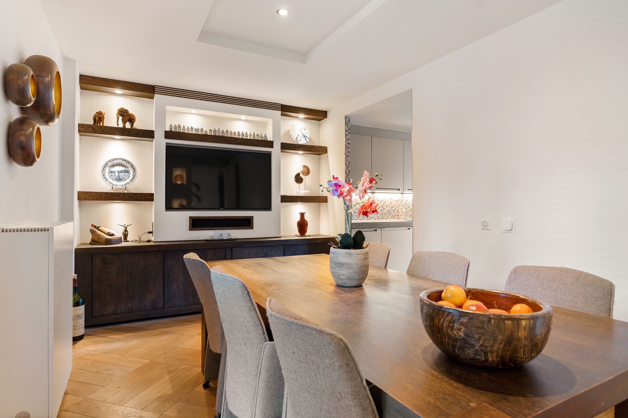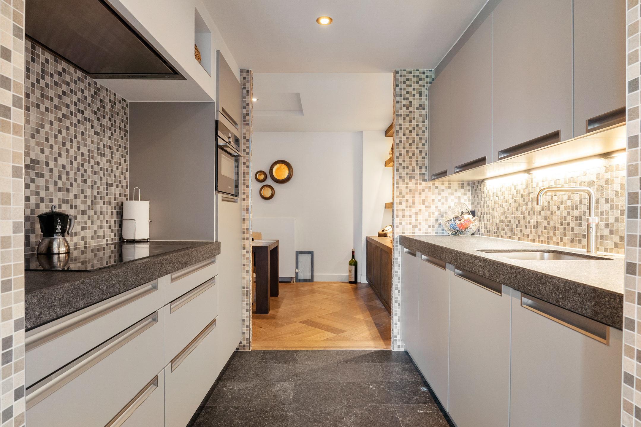 Bij binnenkomst in het appartement valt meteen de royale hal op. Hier vind je het toilet met fonteintje, een praktische berg-/provisiekast met wasmachineaansluiting en de meterkast. Aan de voorzijde ligt de eetkamer, die in open verbinding staat met de luxe keuken.