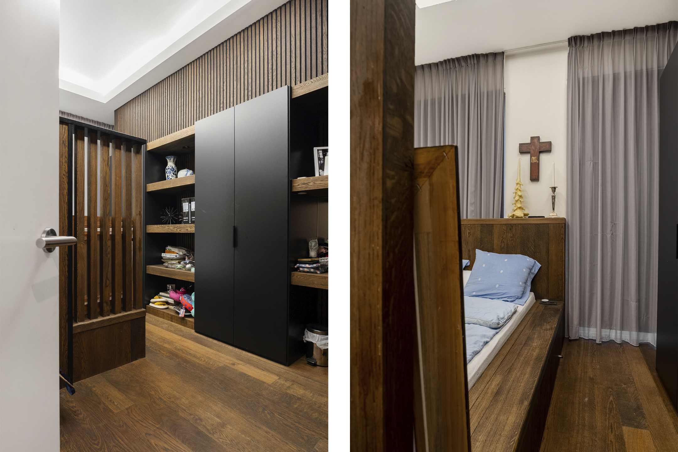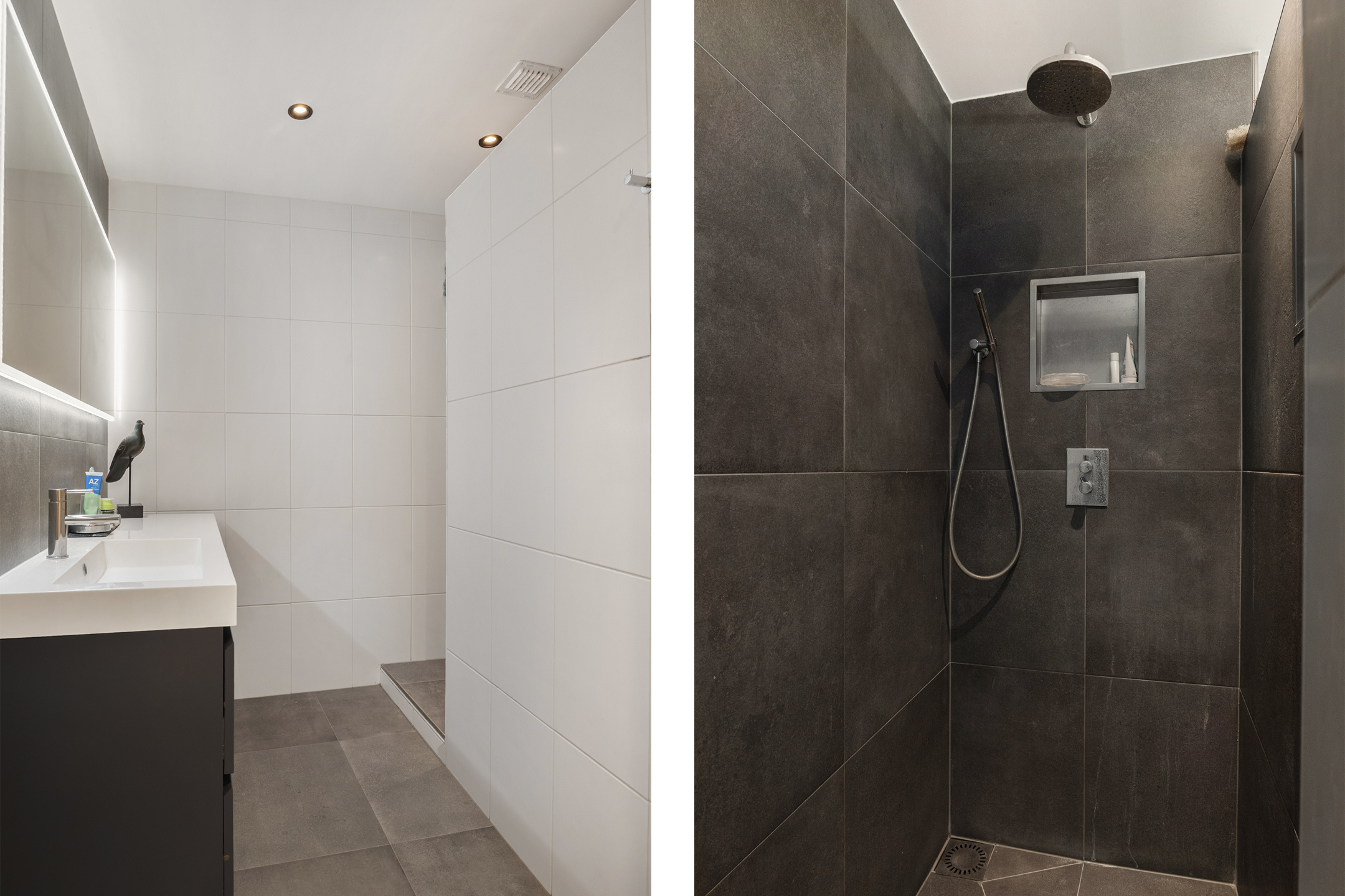 Aan de achterzijde bevinden zich twee slaapkamers met toegang tot het terras. De derde slaapkamer ligt aan de voorzijde van de woning en is eveneens ruim en licht. De badkamer is compleet uitgevoerd met een ligbad, aparte douche en een wastafelmeubel.