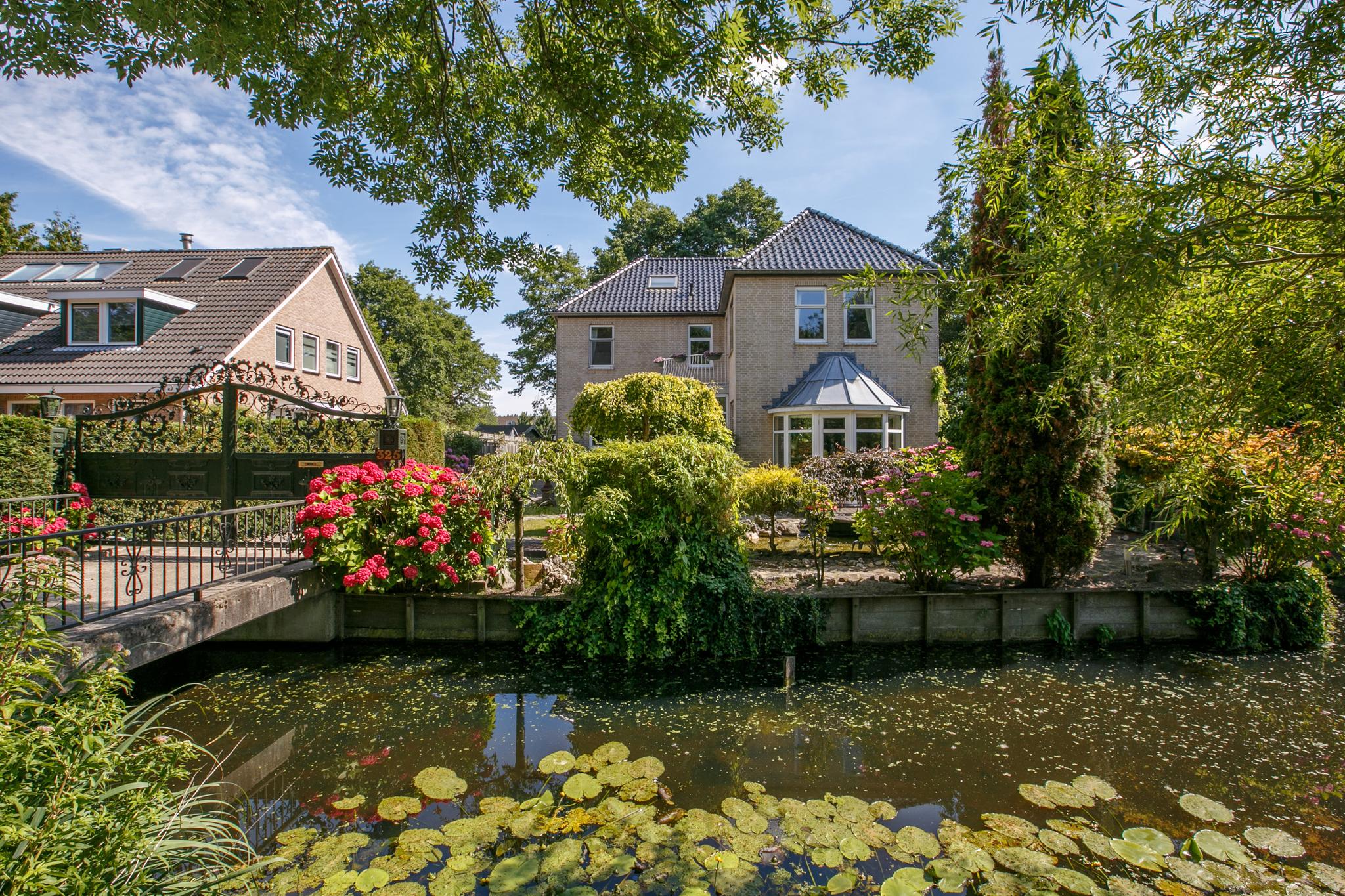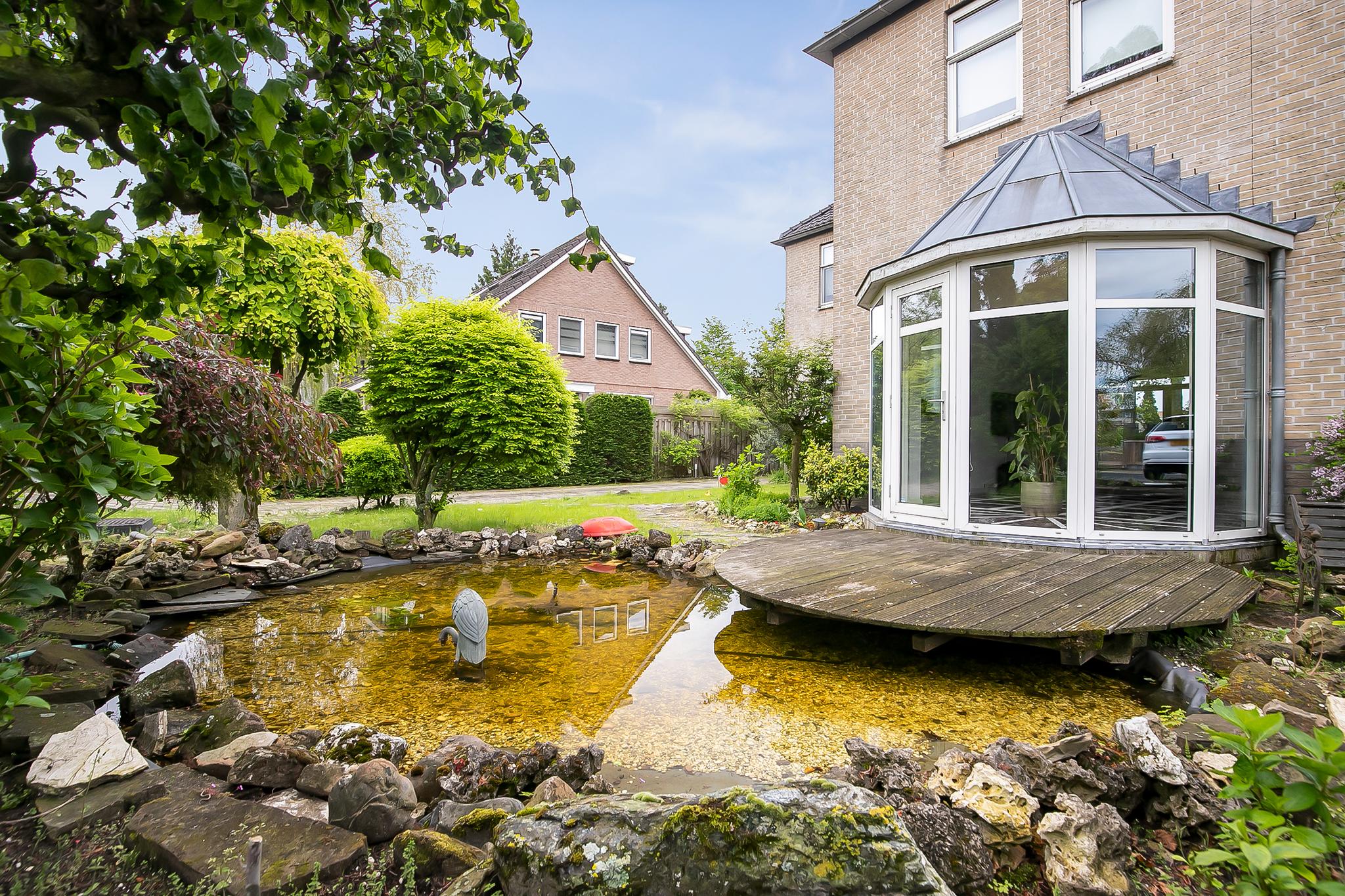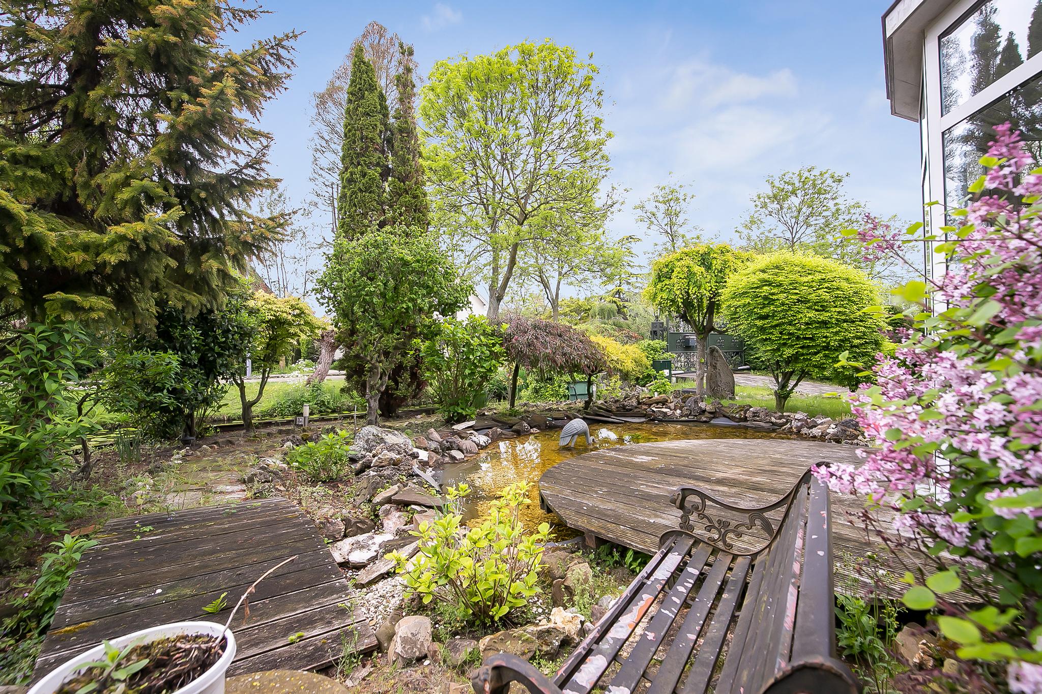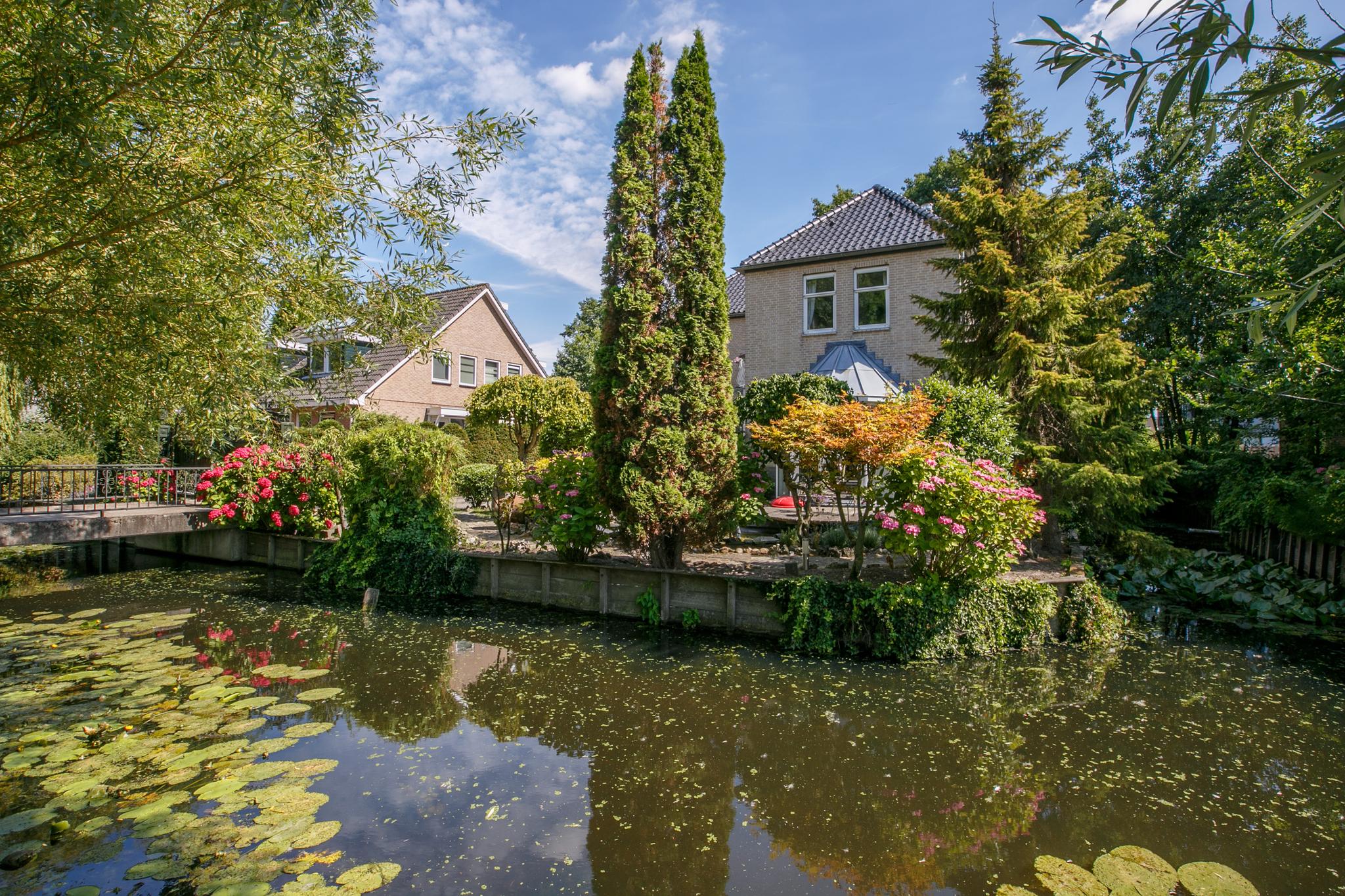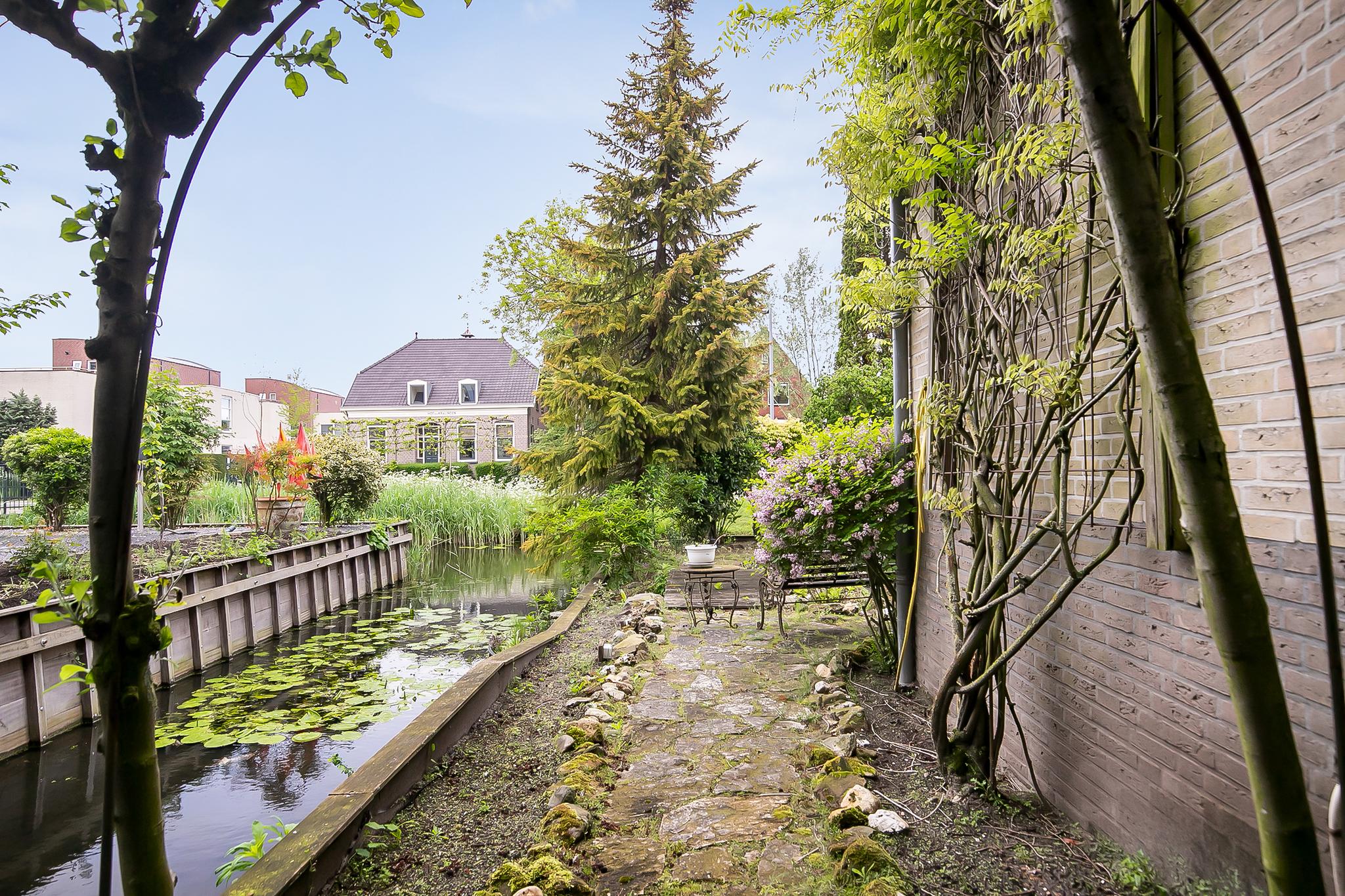 De tuin heeft een vijver en is aan twee zijdes omringd door water.