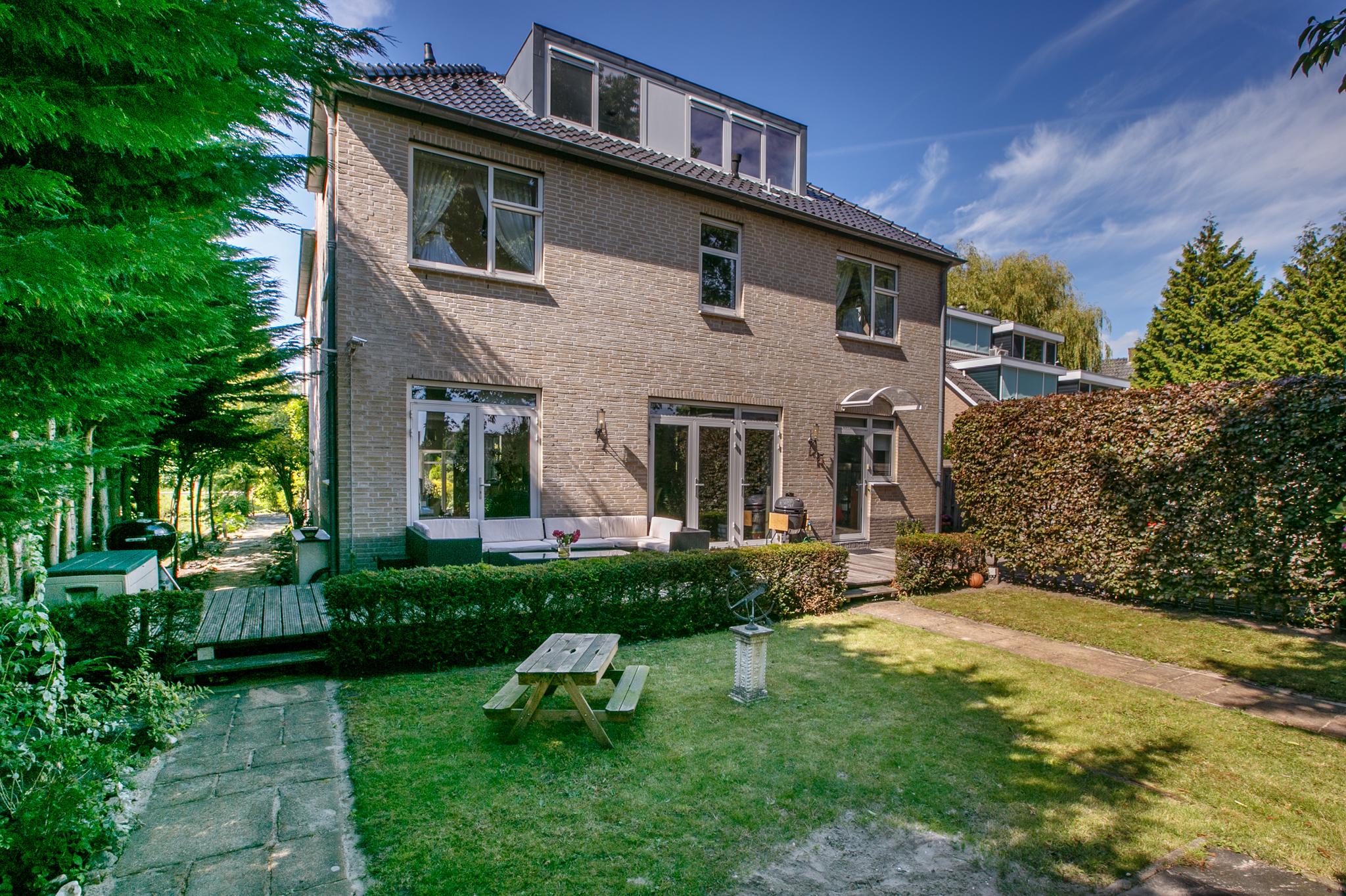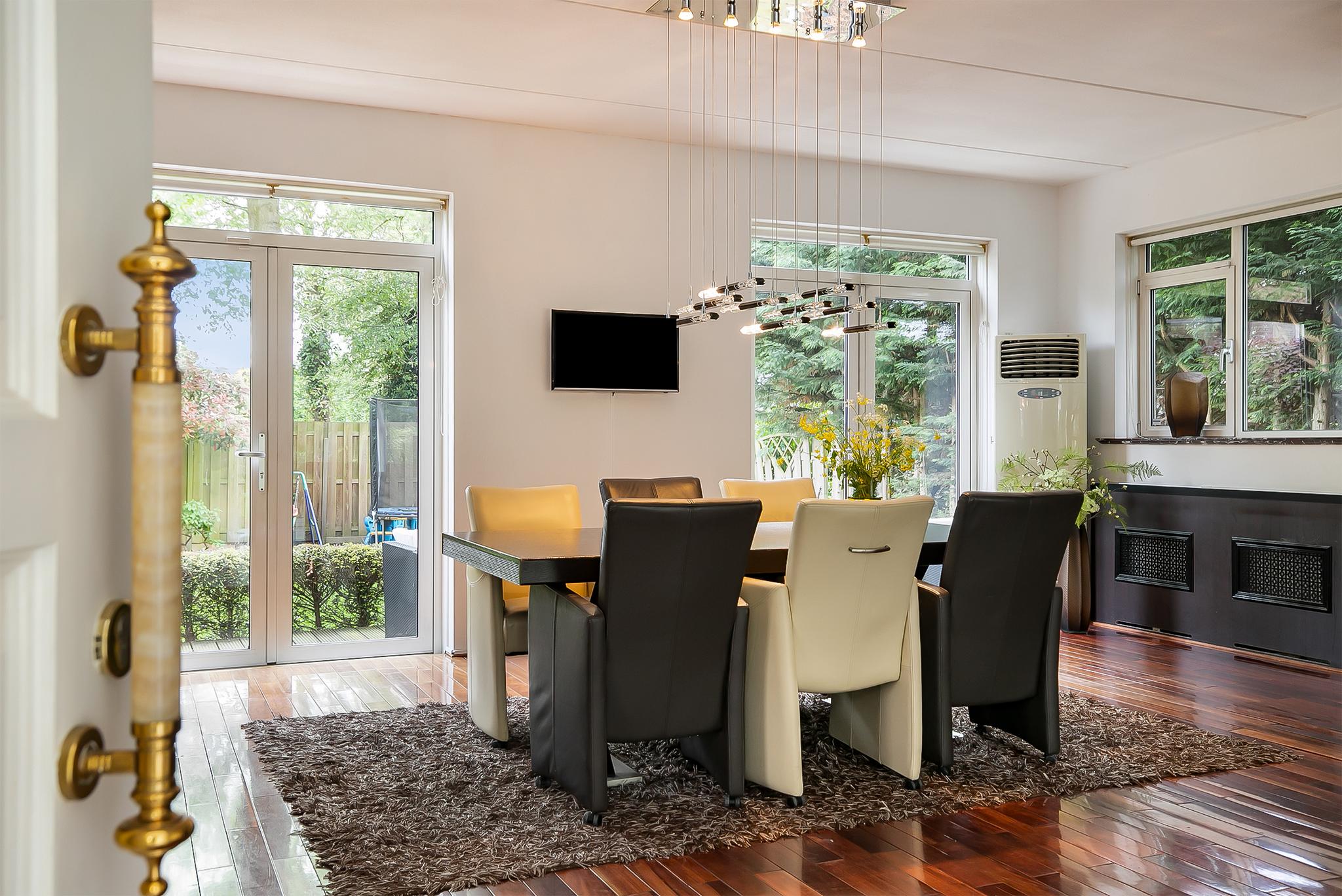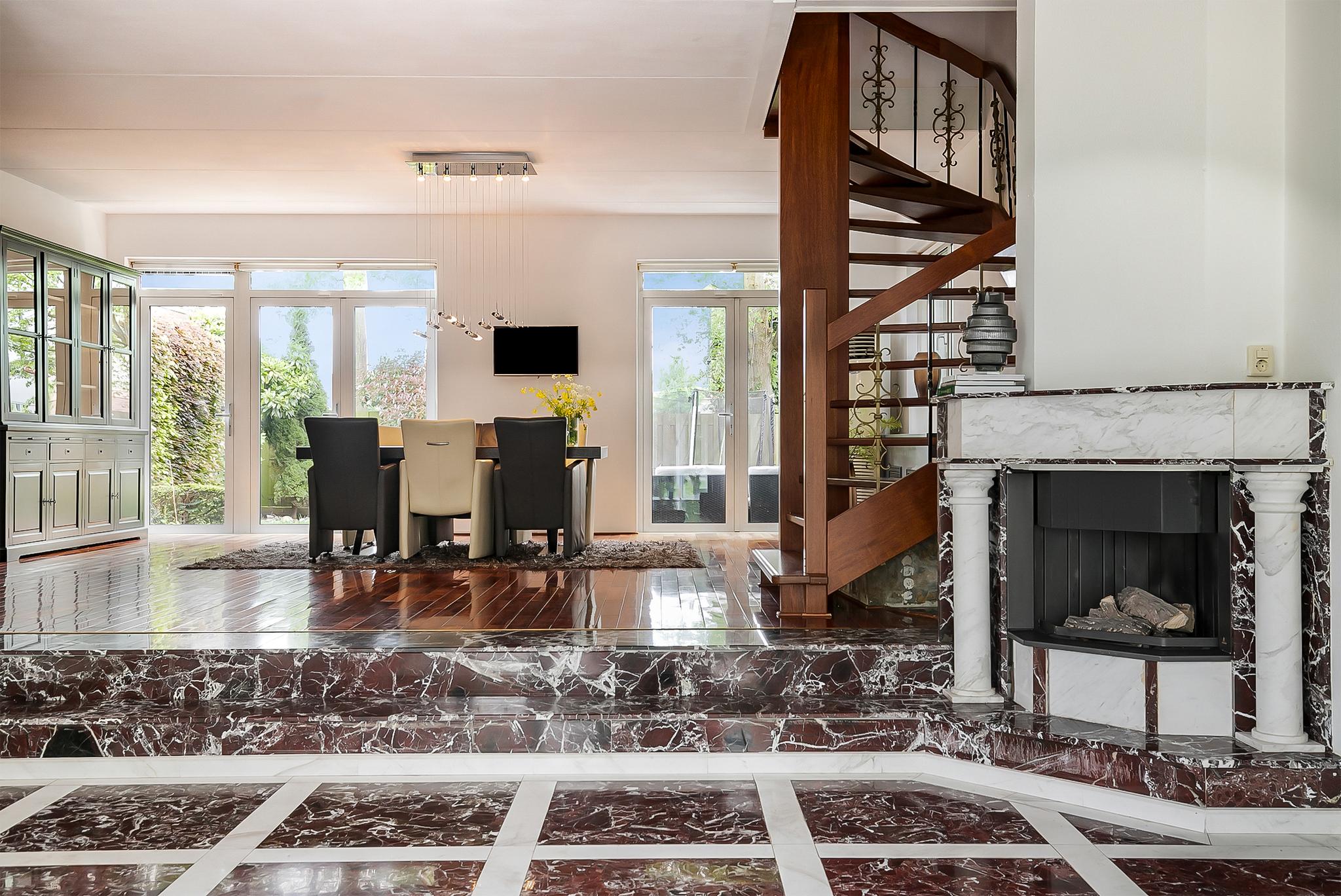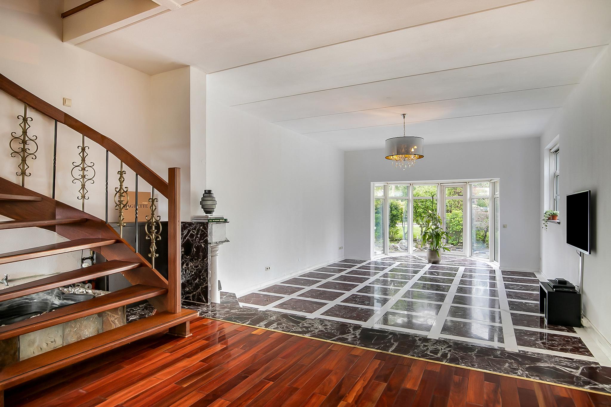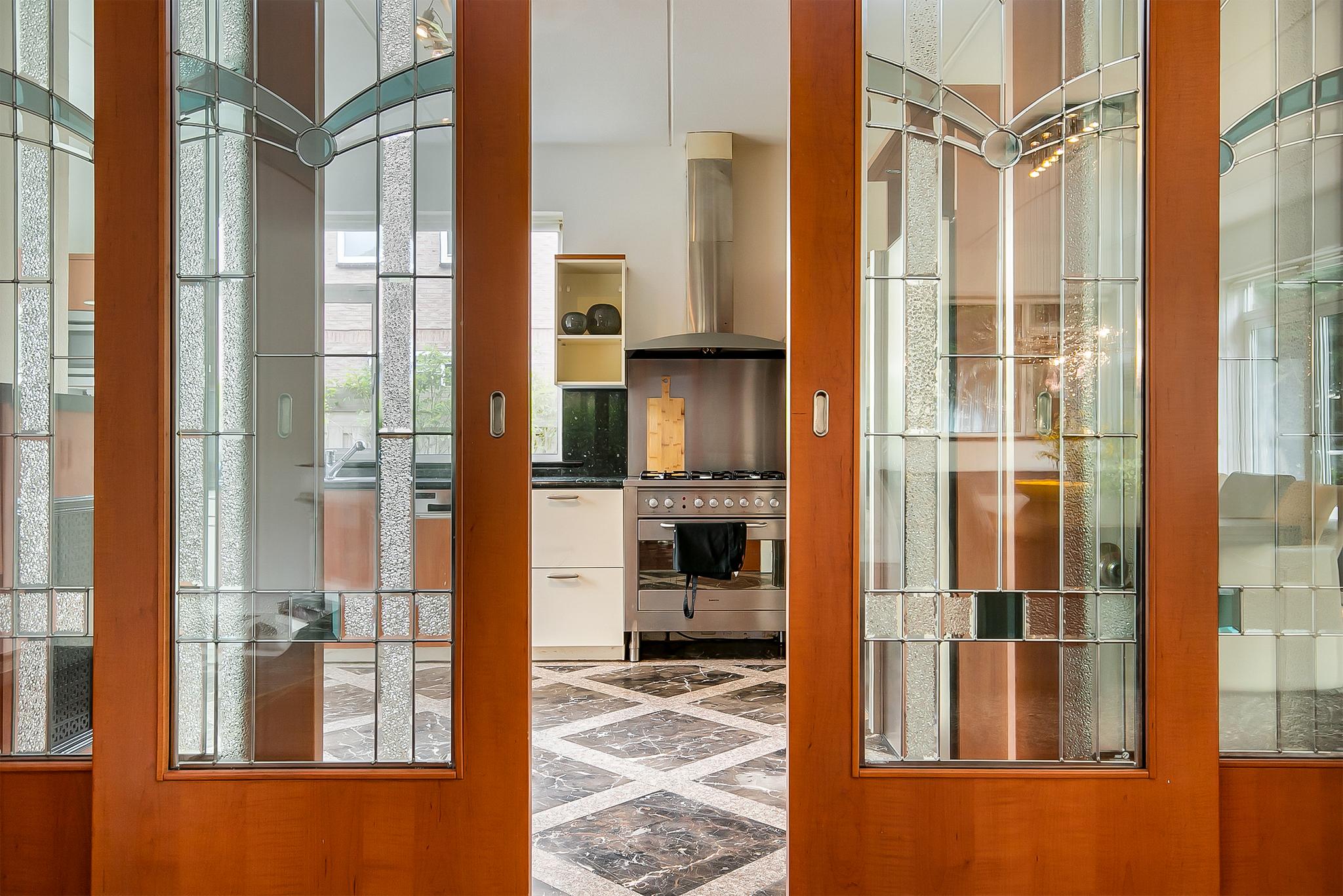 Ruime hal met ingebouwde garderobe en toegang tot toilet met fonteintje. Royale lichte woonkamer met openslaande deuren naar de tuin en woonkeuken. Woonkeuken met natuurstenen aanrechtblad heeft een vijf pits gasfornuis met gasoven rvs gootsteen, vaatwasser, Amerikaanse ijskast, en rvs afzuigkap. Aangrenzend aan de keuken ligt de bijkeuken met toegang tot de tuin. Vanuit de woonkamer heeft men toegang naar de eerste verdieping door middel van een fraaie vormgegeven eikenhouten trap.