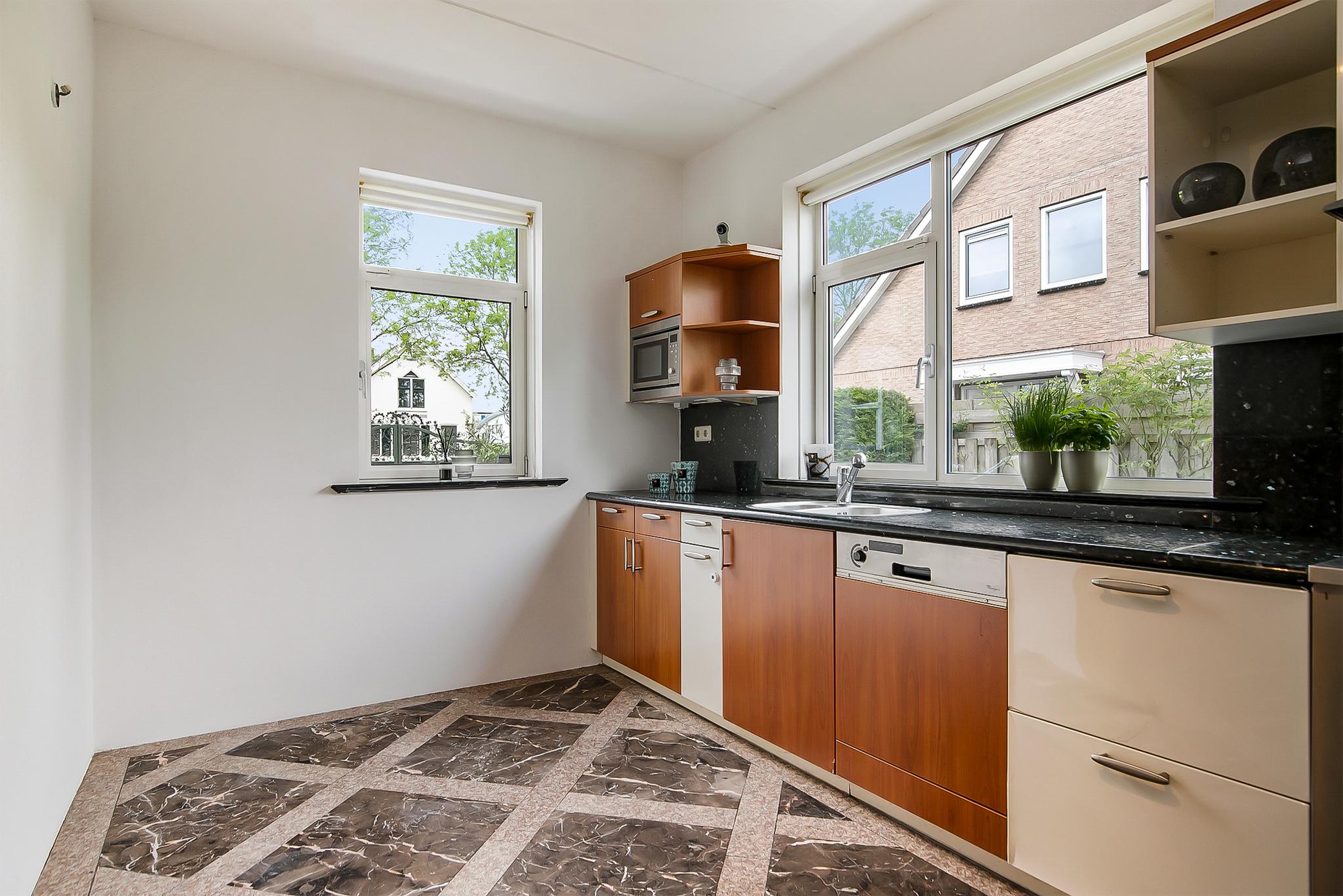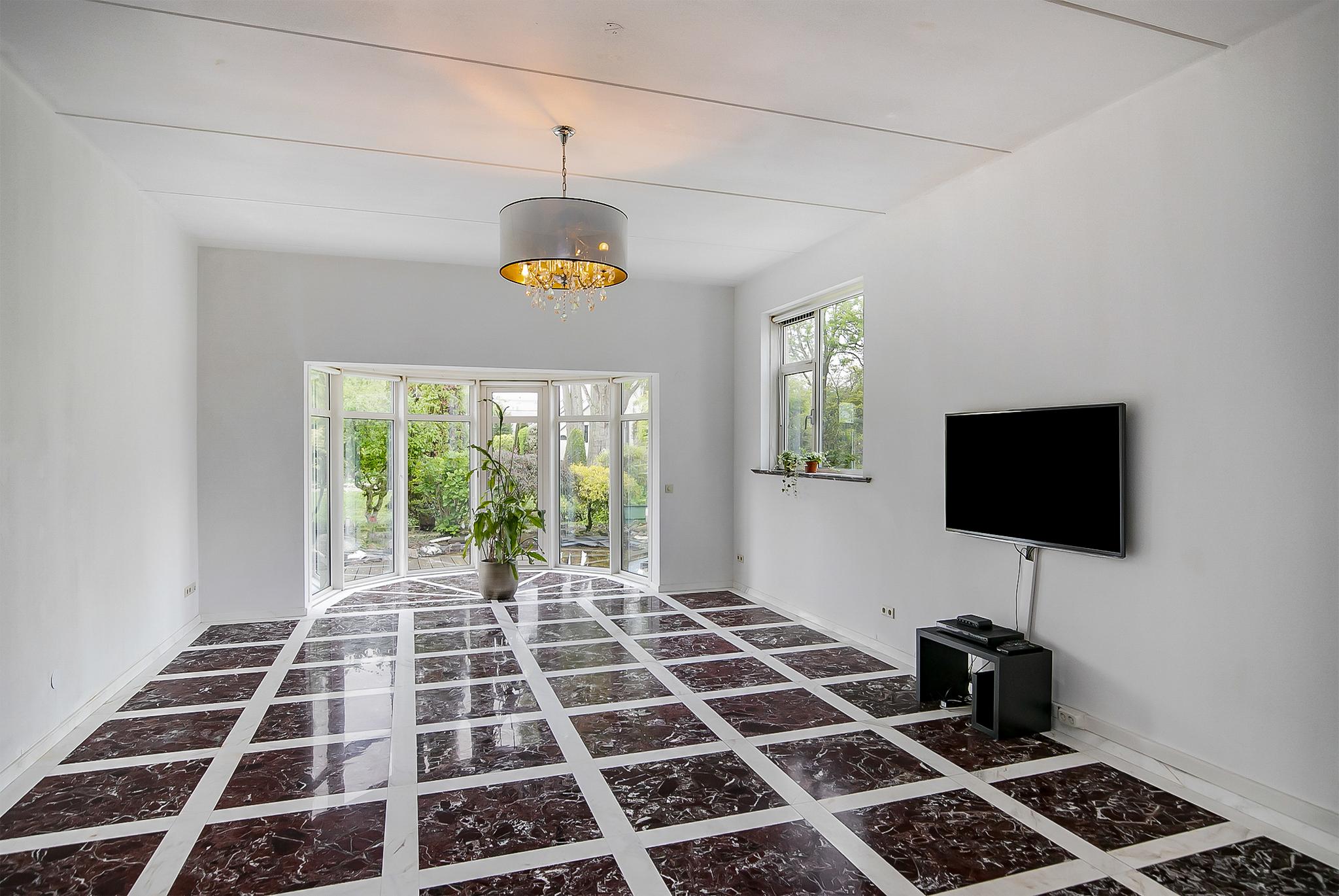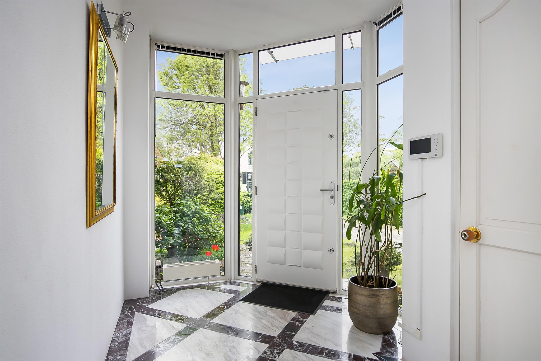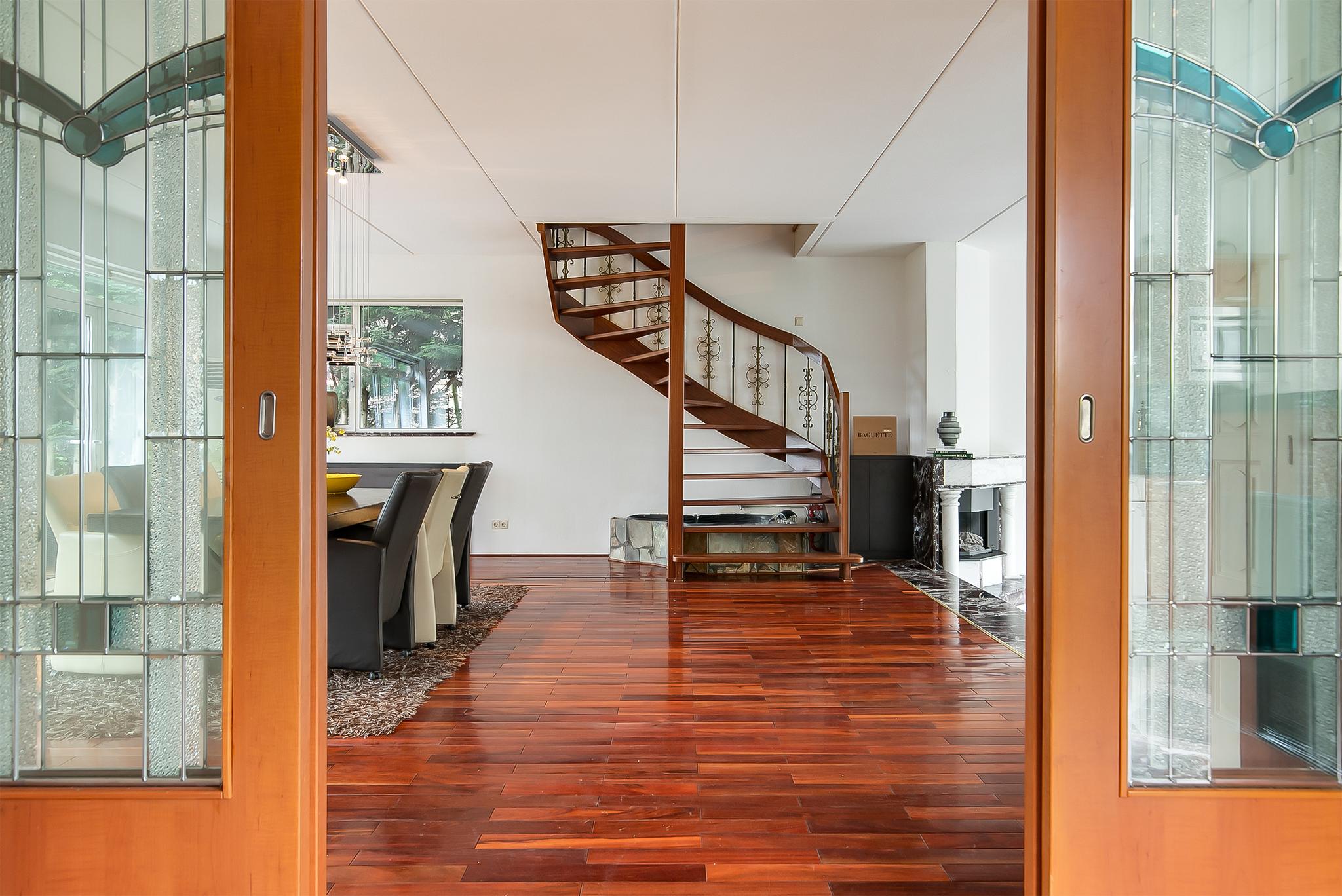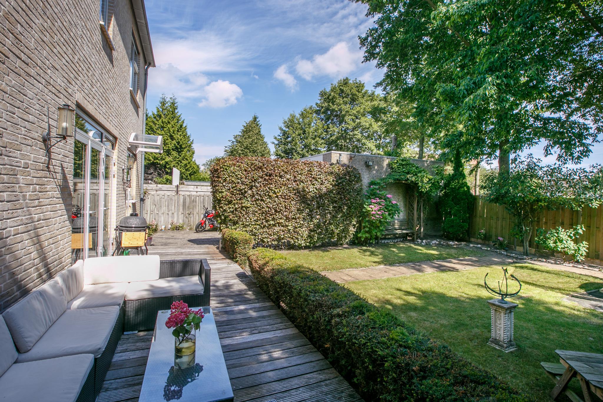 Ruime hal met ingebouwde garderobe en toegang tot toilet met fonteintje. Royale lichte woonkamer met openslaande deuren naar de tuin en woonkeuken. Woonkeuken met natuurstenen aanrechtblad heeft een vijf pits gasfornuis met gasoven rvs gootsteen, vaatwasser, Amerikaanse ijskast, en rvs afzuigkap. Aangrenzend aan de keuken ligt de bijkeuken met toegang tot de tuin. Vanuit de woonkamer heeft men toegang naar de eerste verdieping door middel van een fraaie vormgegeven eikenhouten trap.