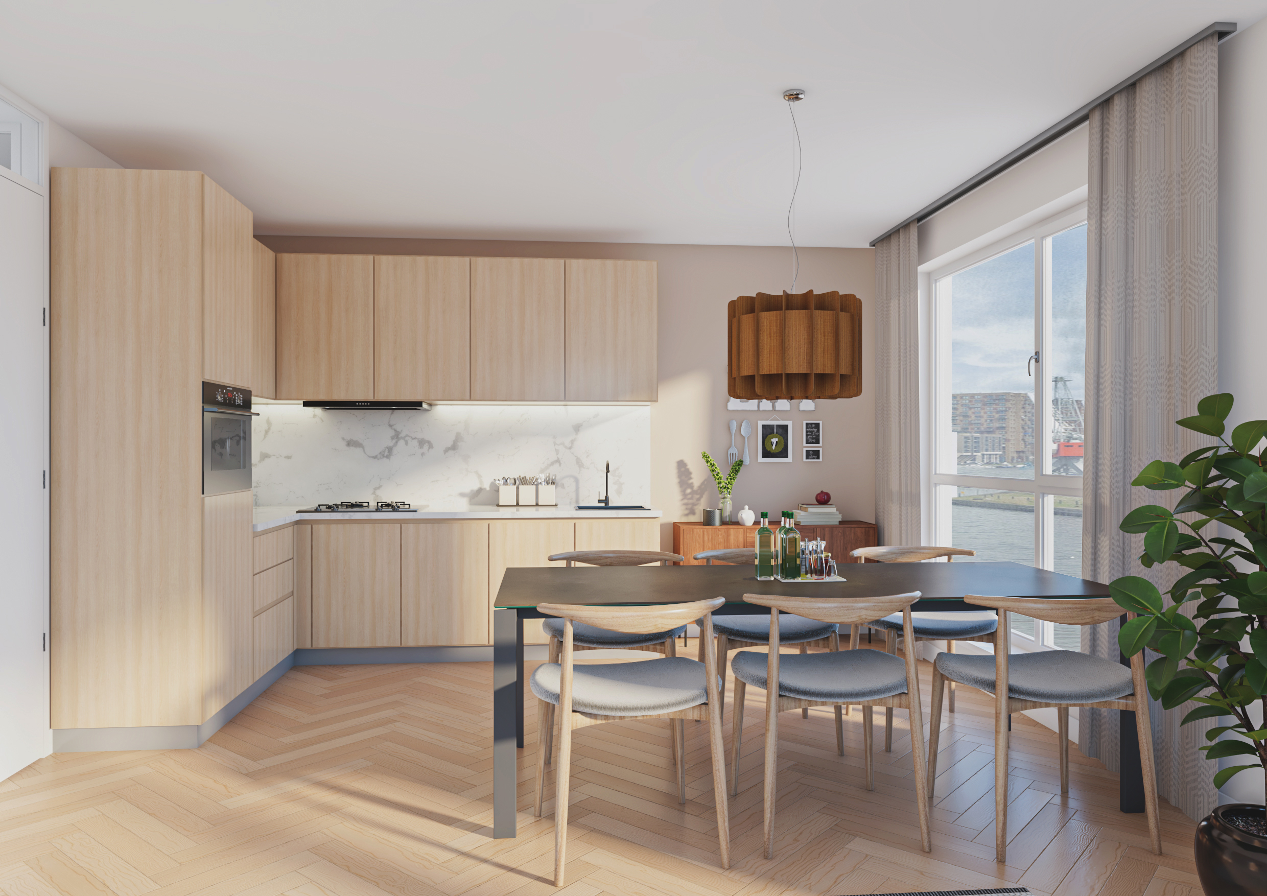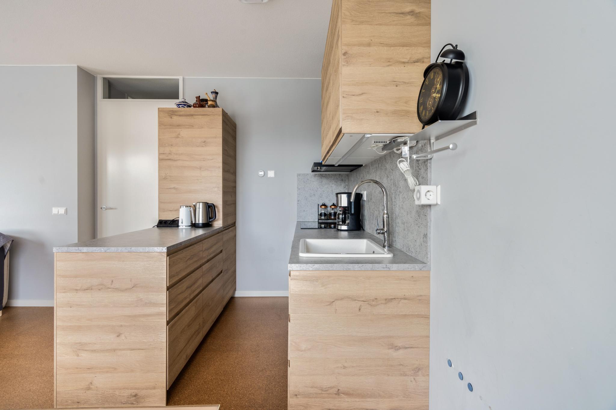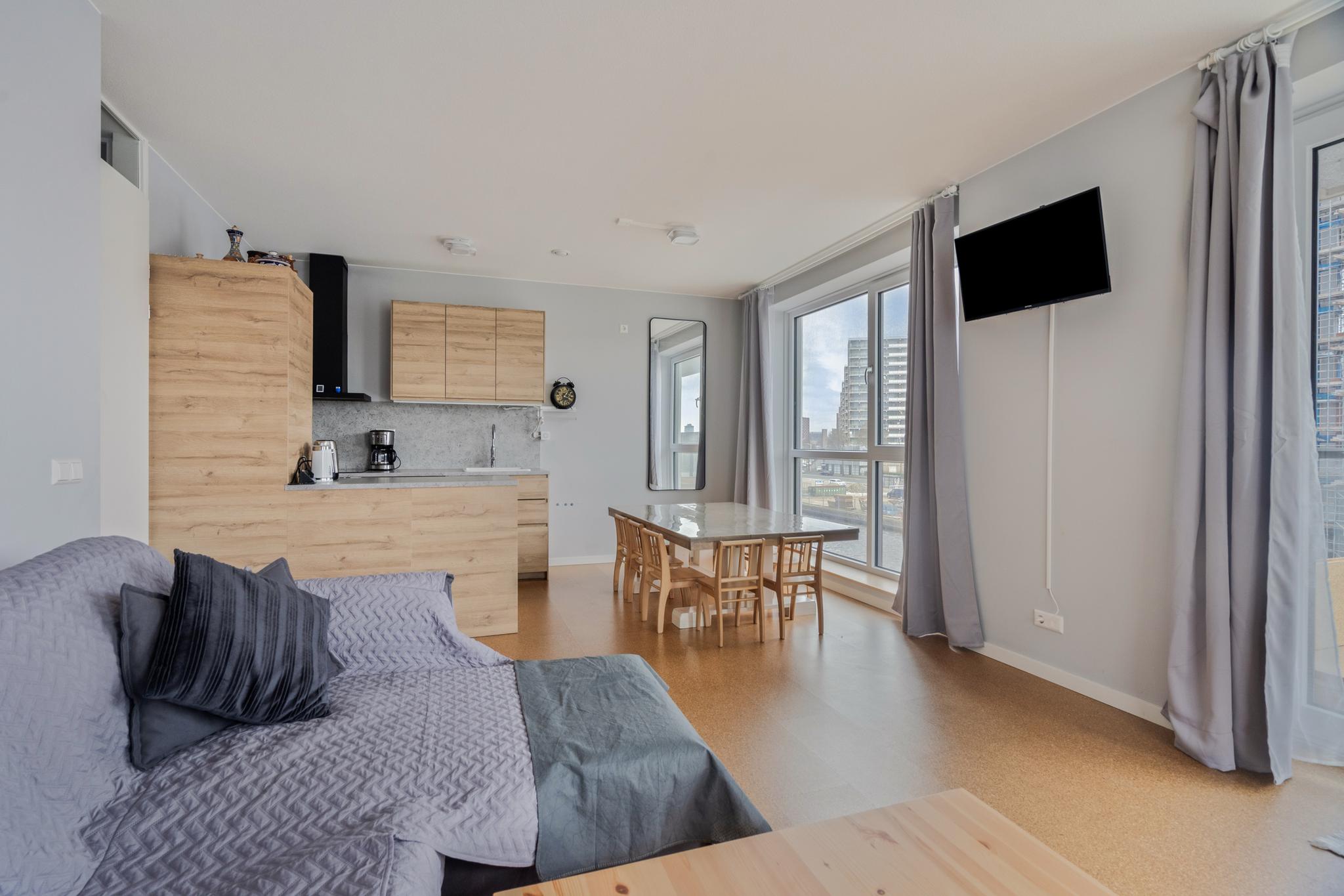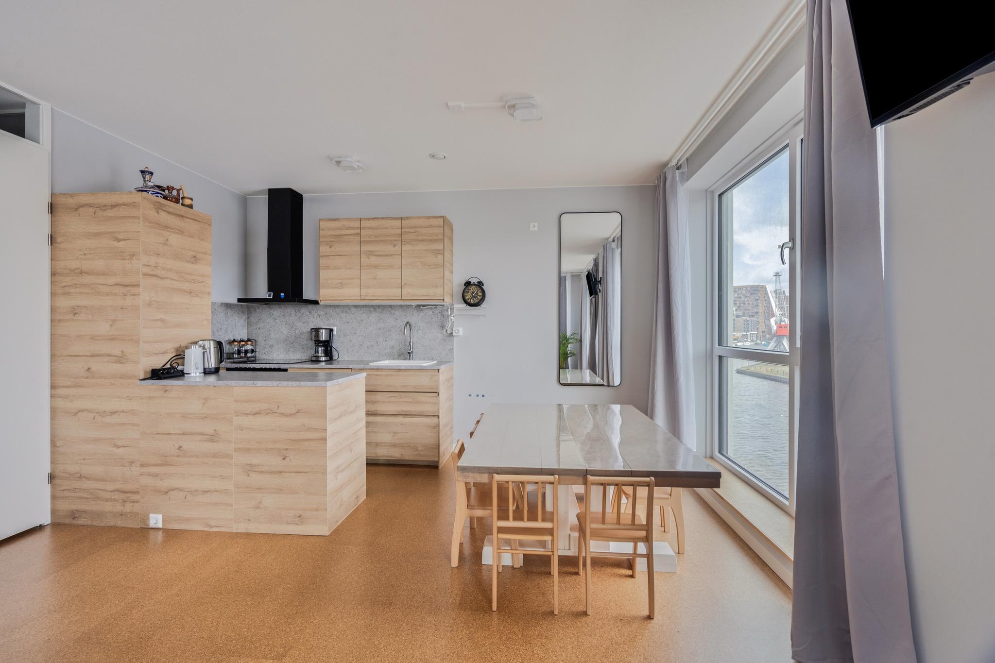 Aan het eind van de hal is de ruime en licht woonkamer gelegen, met een weids uitzicht over de haven. De moderne open keuken is strak afgewerkt en voorzien van de benodigde inbouwapparatuur, zoals een combimagnetron, een inductiekookplaat en een afzuiginstallatie. In de woning is ook een inpandige berging aanwezig. De berging biedt plaats aan de vloerverwarming unit, een was- en droogaansluiting een WTW en daarnaast ook nog voldoende bergruimte.