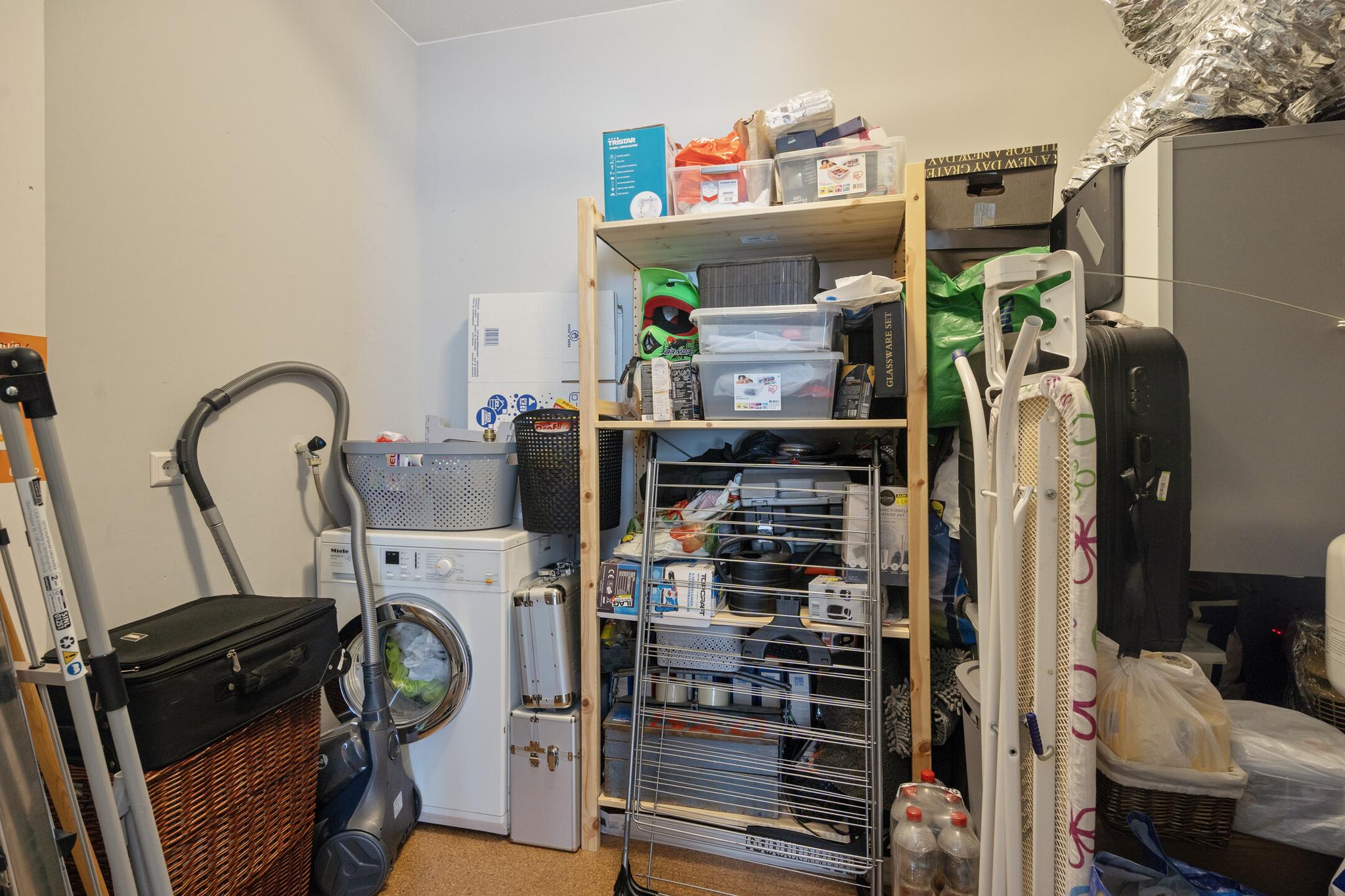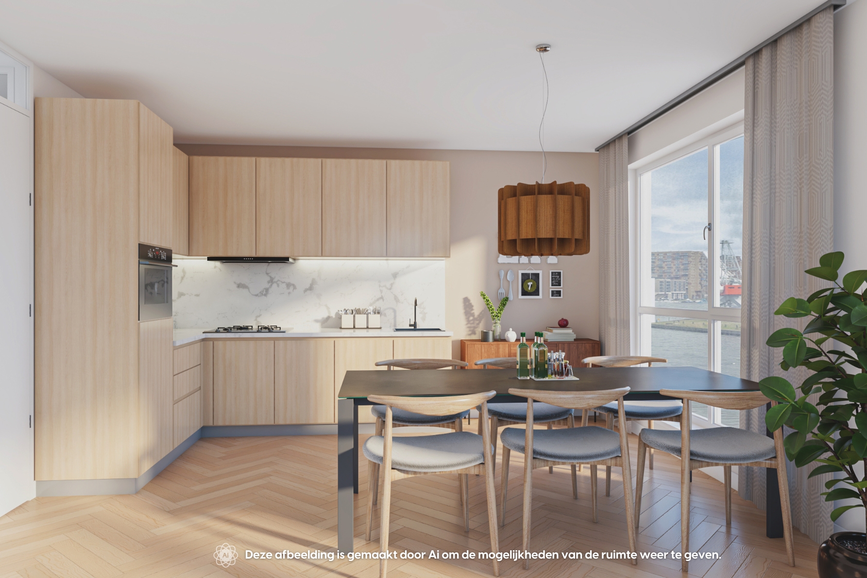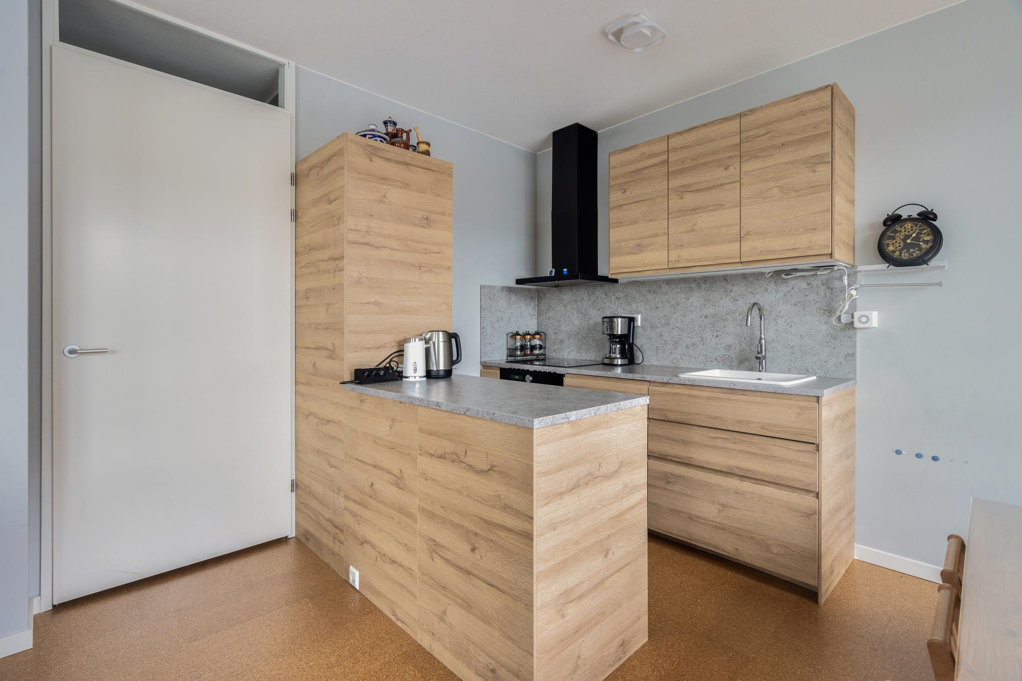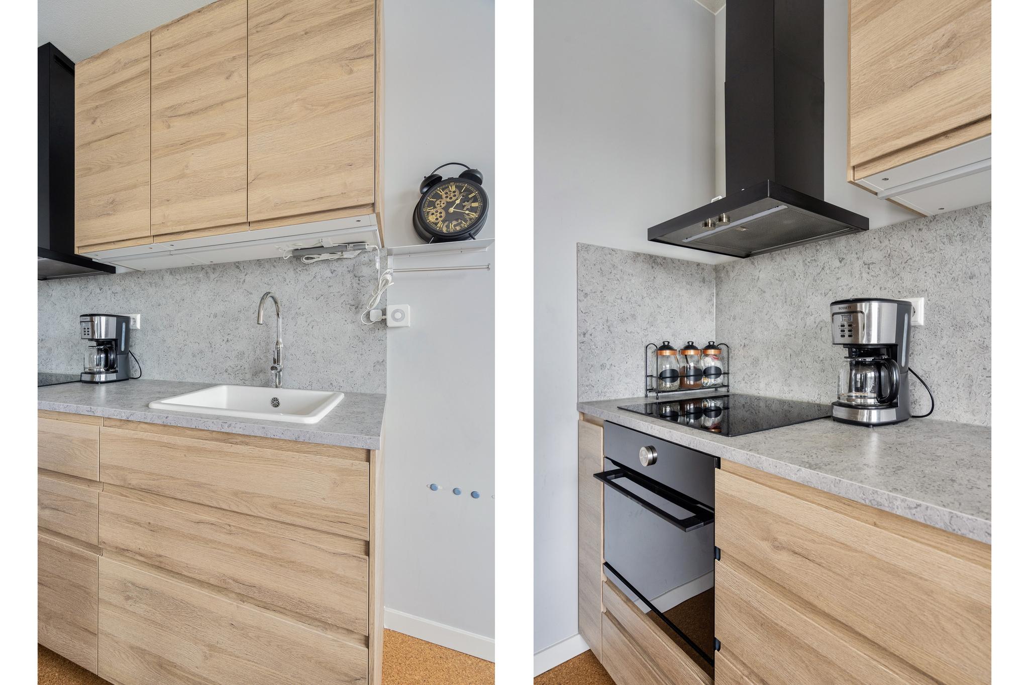 Aan het eind van de hal is de ruime en licht woonkamer gelegen, met een weids uitzicht over de haven. De moderne open keuken is strak afgewerkt en voorzien van de benodigde inbouwapparatuur, zoals een combimagnetron, een inductiekookplaat en een afzuiginstallatie. In de woning is ook een inpandige berging aanwezig. De berging biedt plaats aan de vloerverwarming unit, een was- en droogaansluiting een WTW en daarnaast ook nog voldoende bergruimte.
