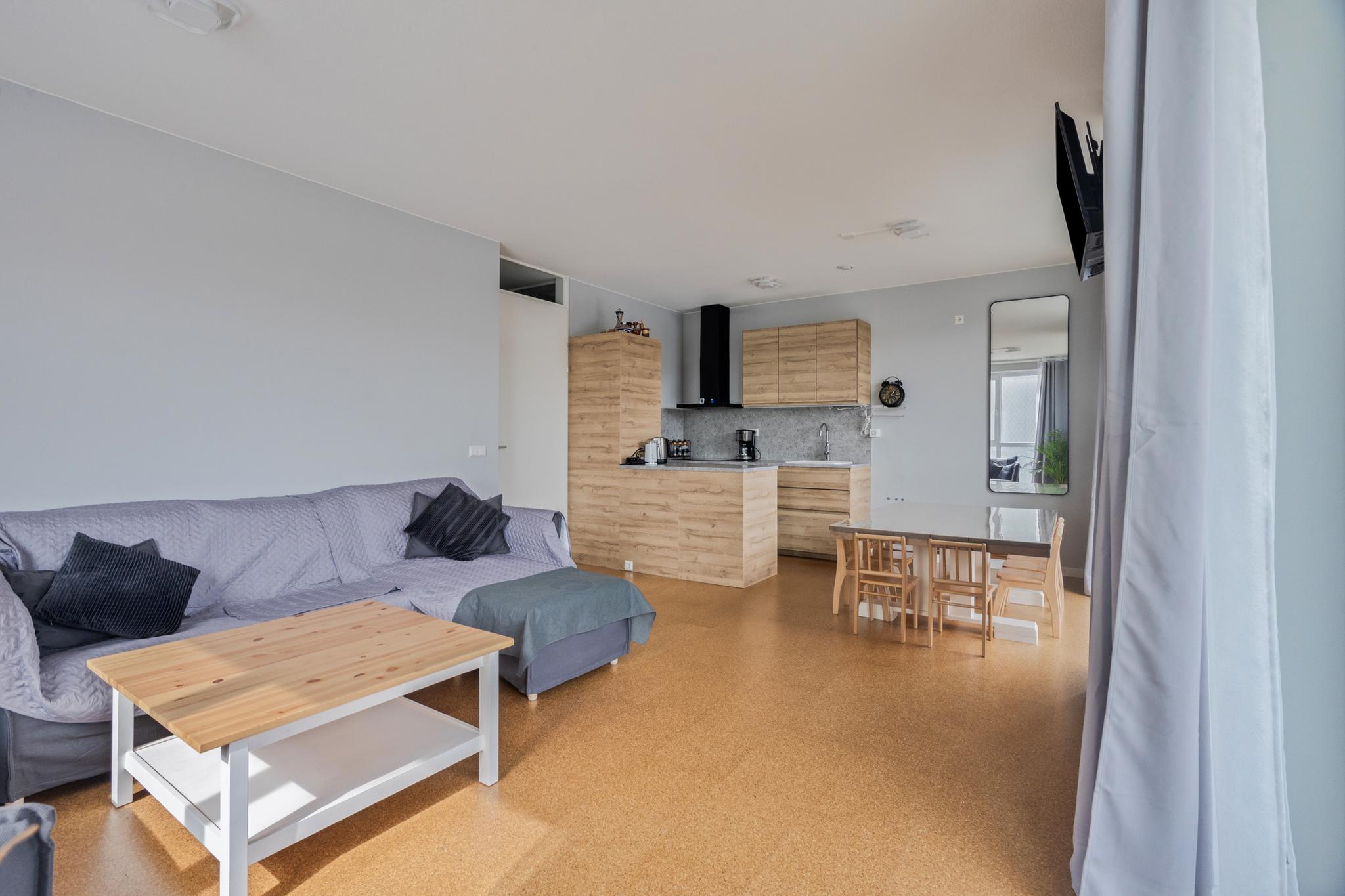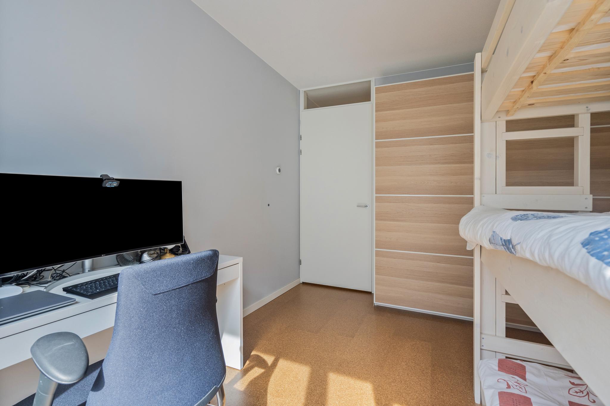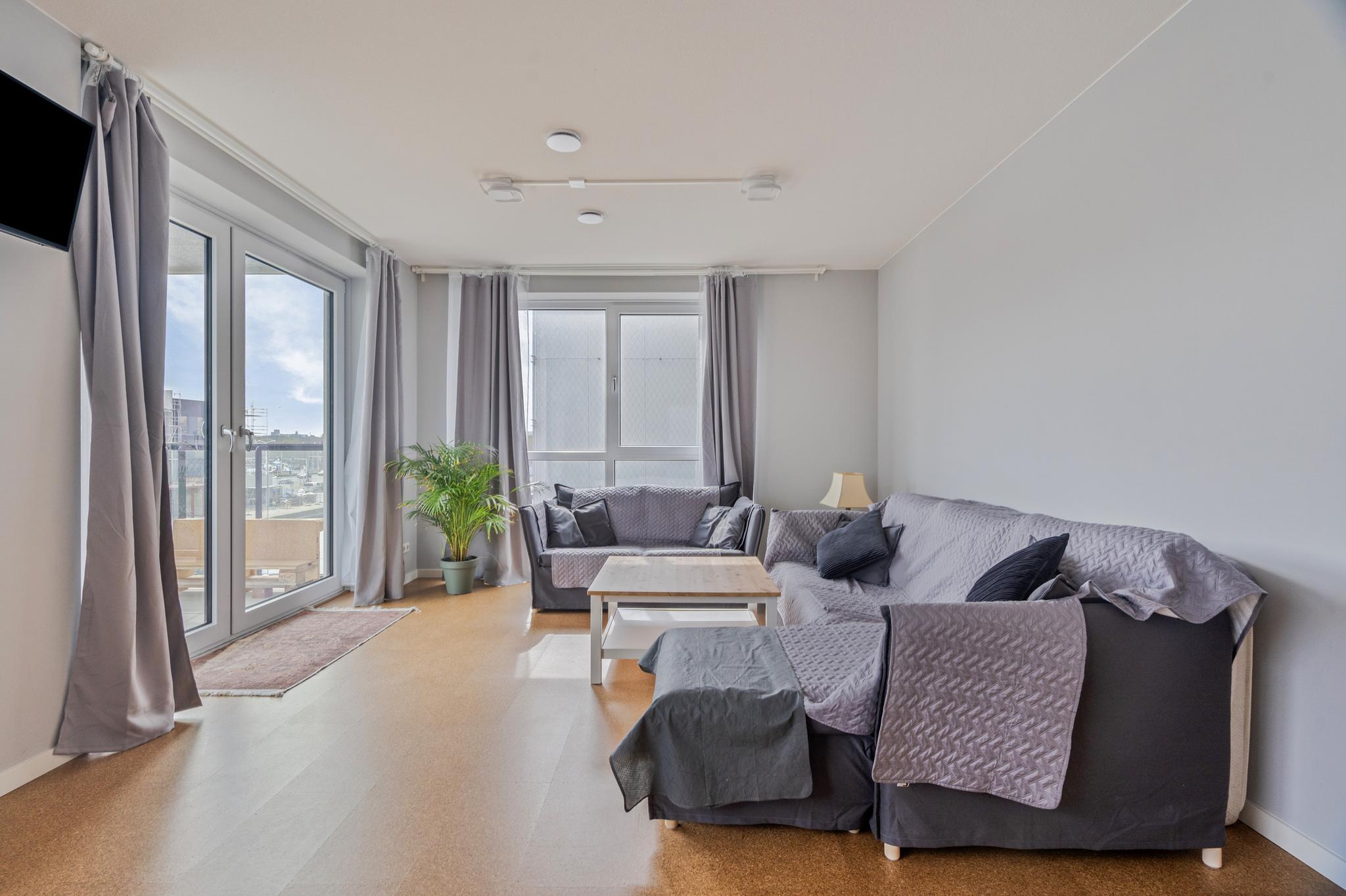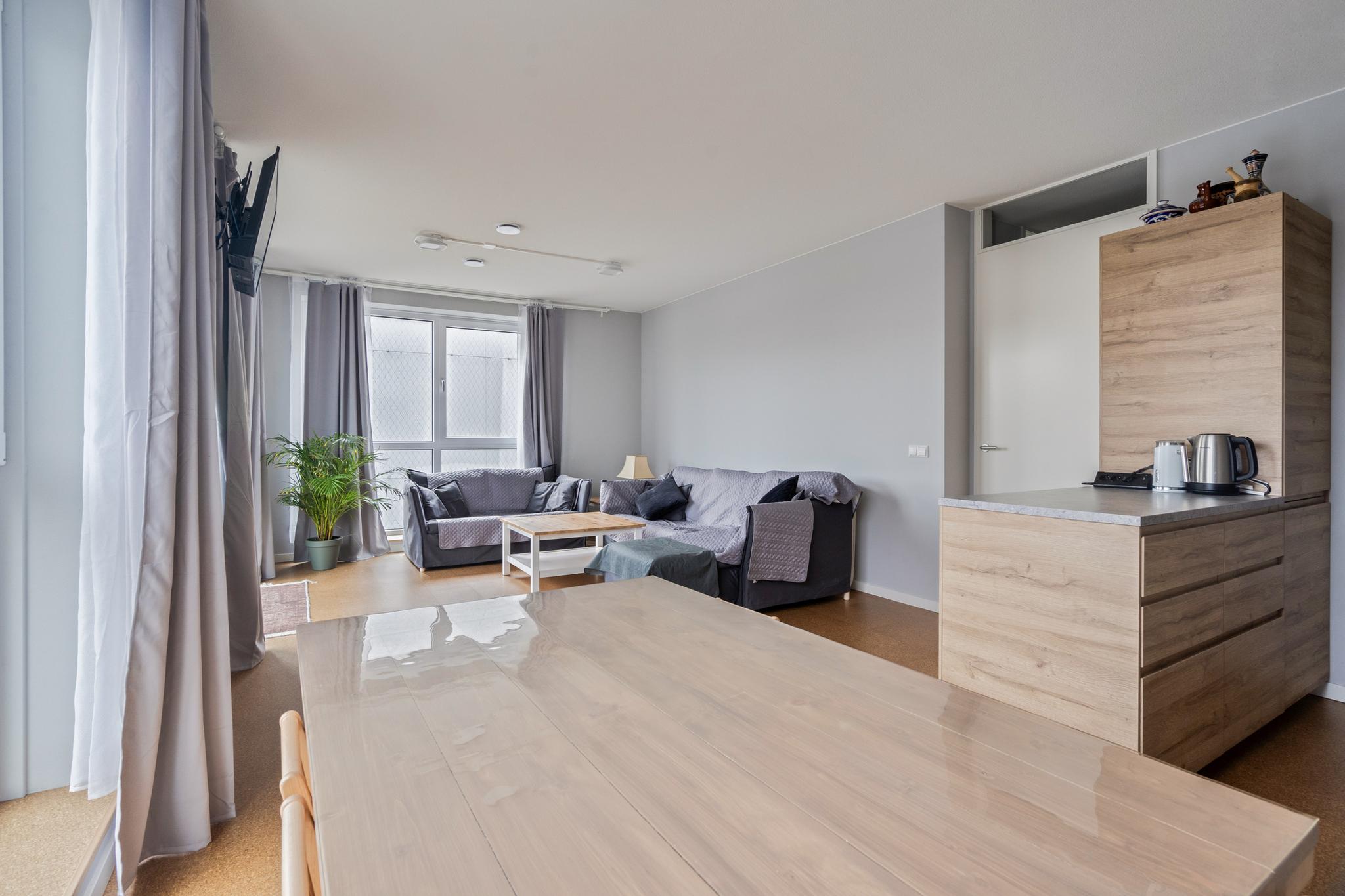 Aan het eind van de hal is de ruime en licht woonkamer gelegen, met een weids uitzicht over de haven. De moderne open keuken is strak afgewerkt en voorzien van de benodigde inbouwapparatuur, zoals een combimagnetron, een inductiekookplaat en een afzuiginstallatie. In de woning is ook een inpandige berging aanwezig. De berging biedt plaats aan de vloerverwarming unit, een was- en droogaansluiting een WTW en daarnaast ook nog voldoende bergruimte.