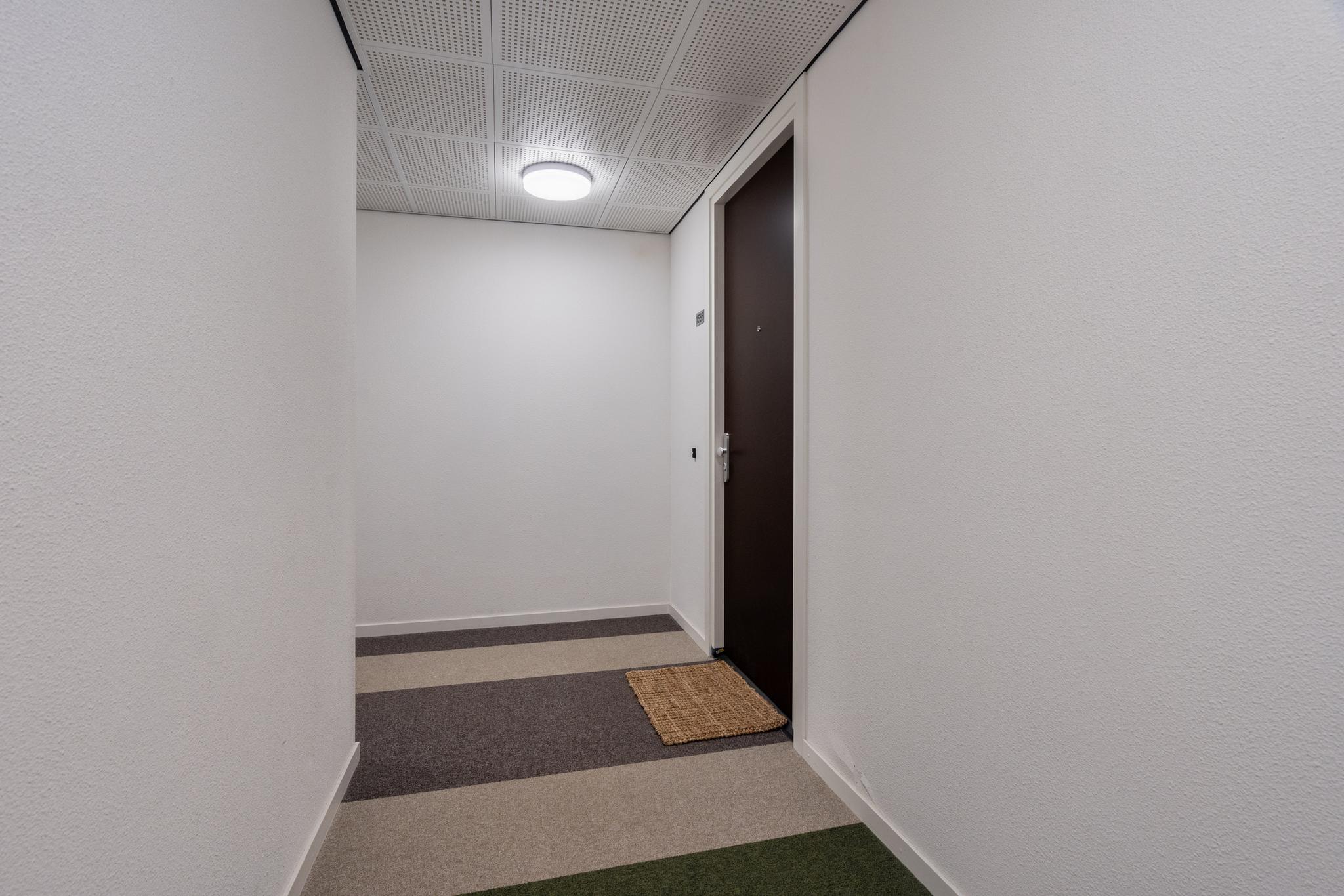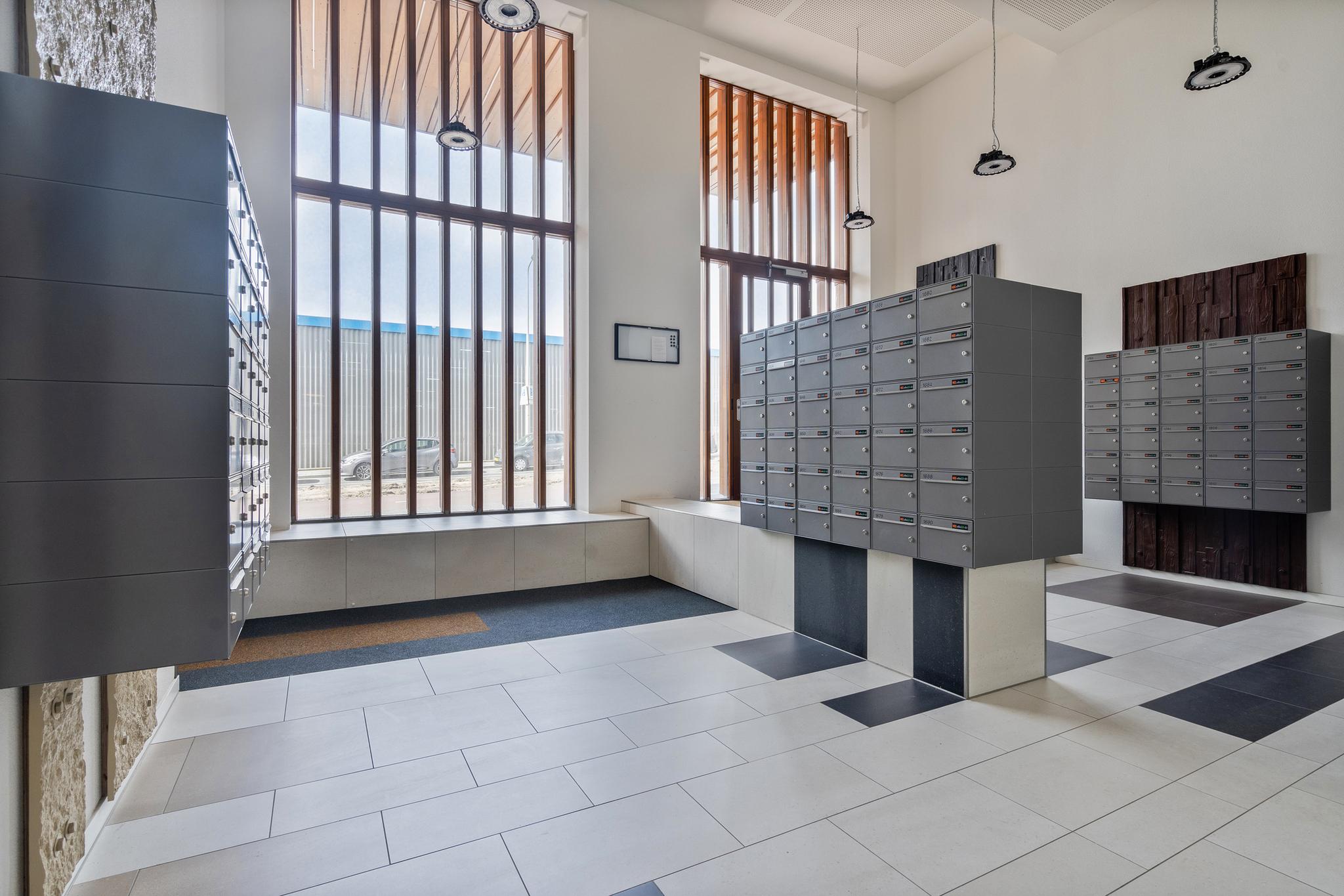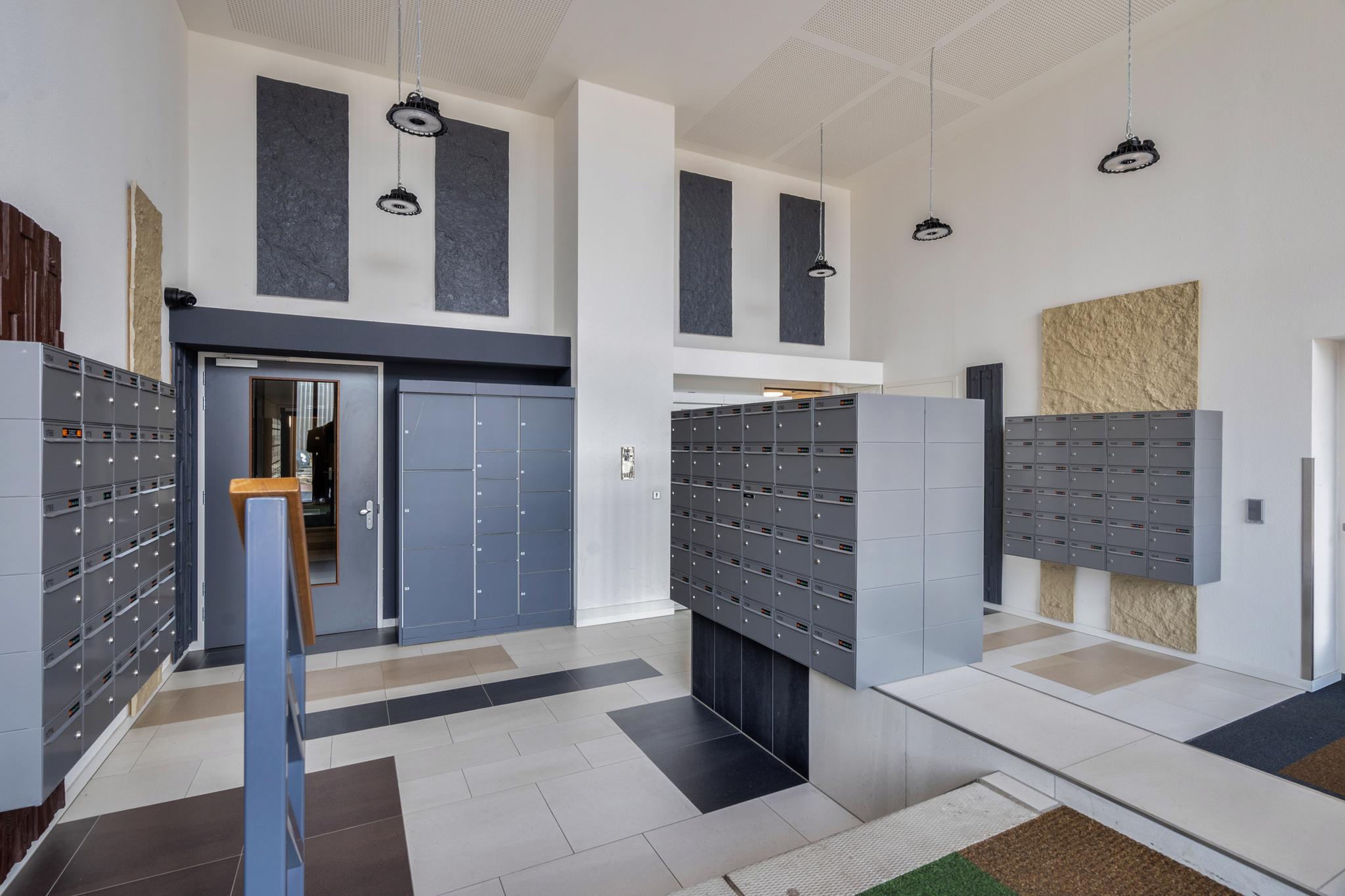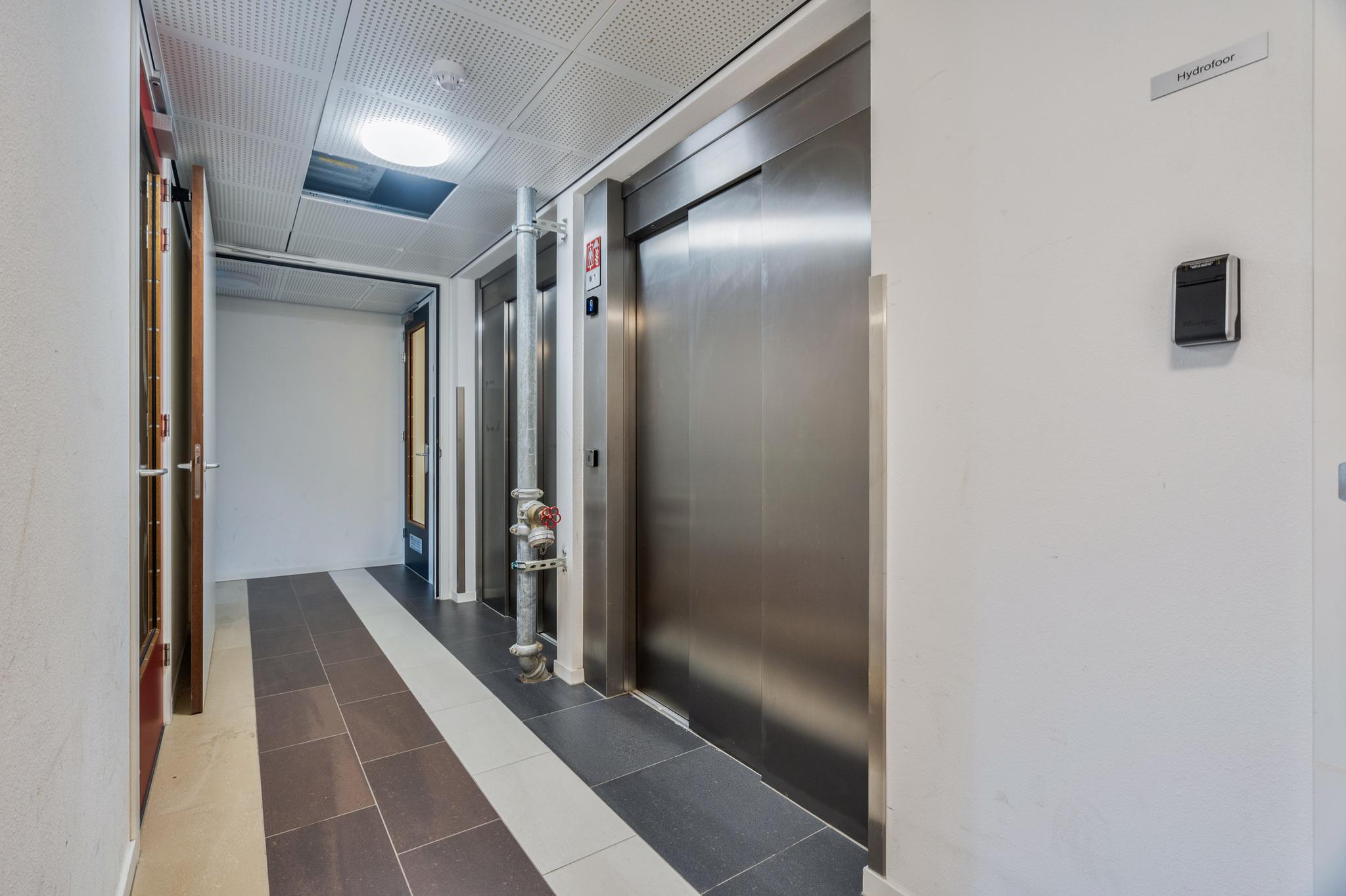 Centrale hal met bellentableau en brievenbussen op straatniveau. Afgesloten hal naar trappenhuis en 2 liften naar 20e etage.