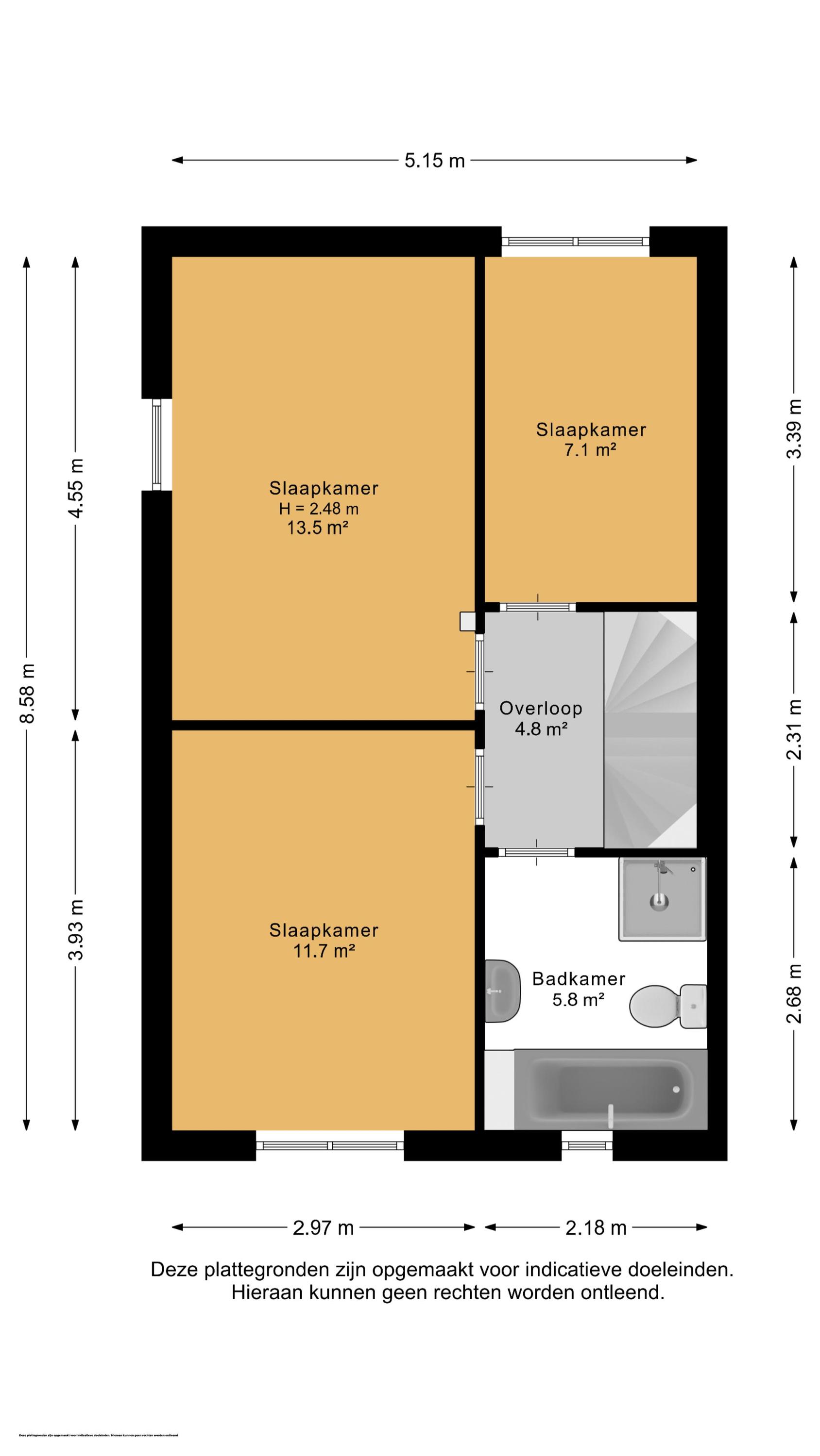 De overloop geeft toegang tot drie slaapkamers van respectievelijk ca. 13,5 m², 11,7 m² en 7,1 m². De badkamer is functioneel ingericht met een ligbad, aparte douchecabine, wastafel en tweede toilet.