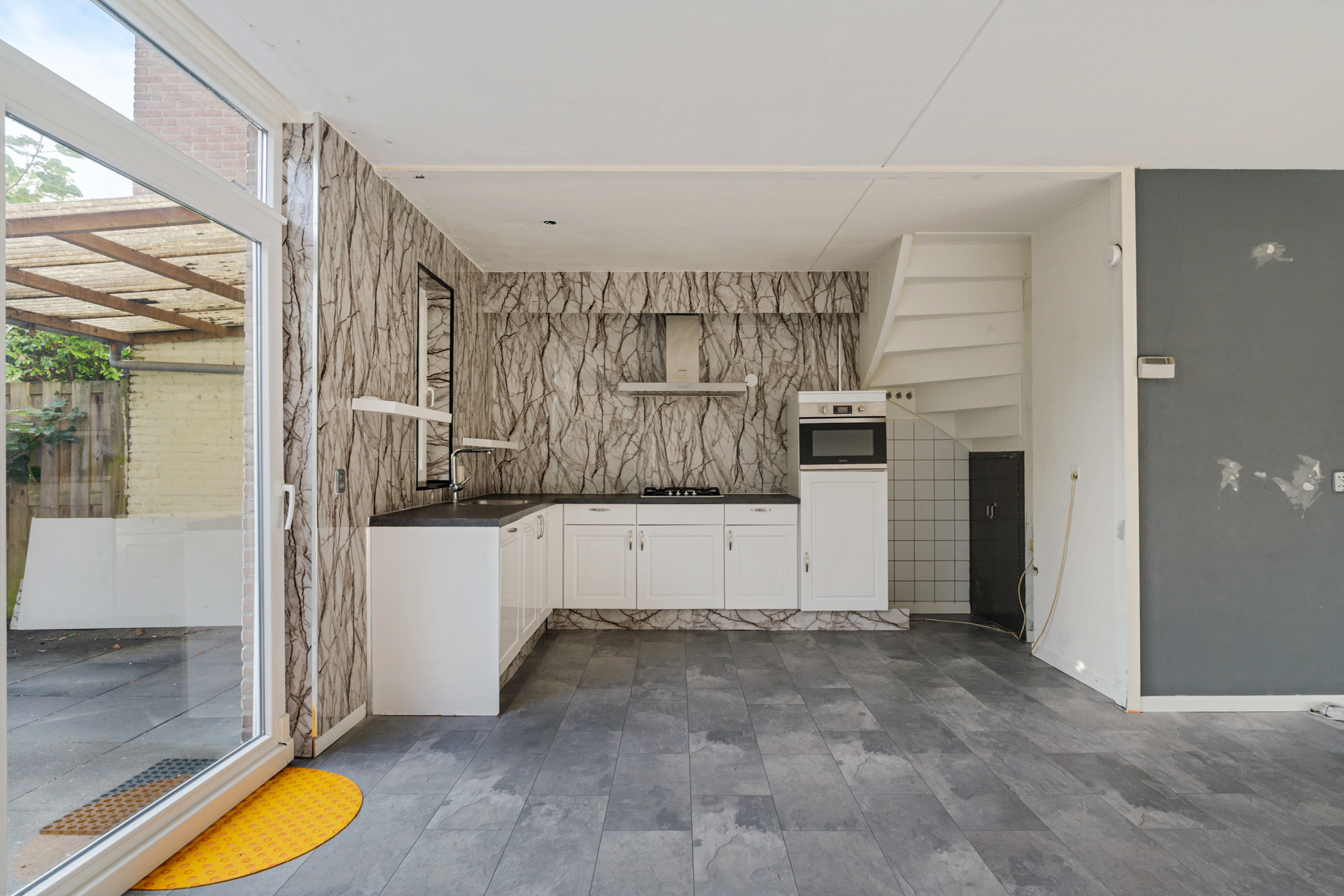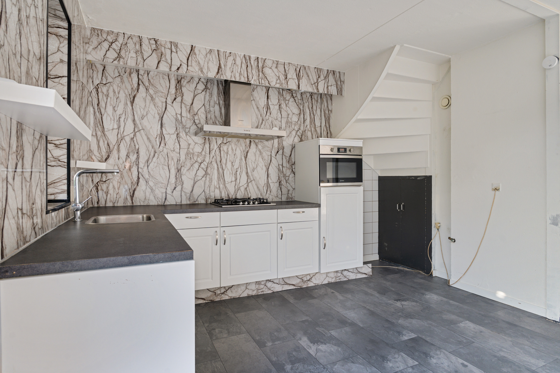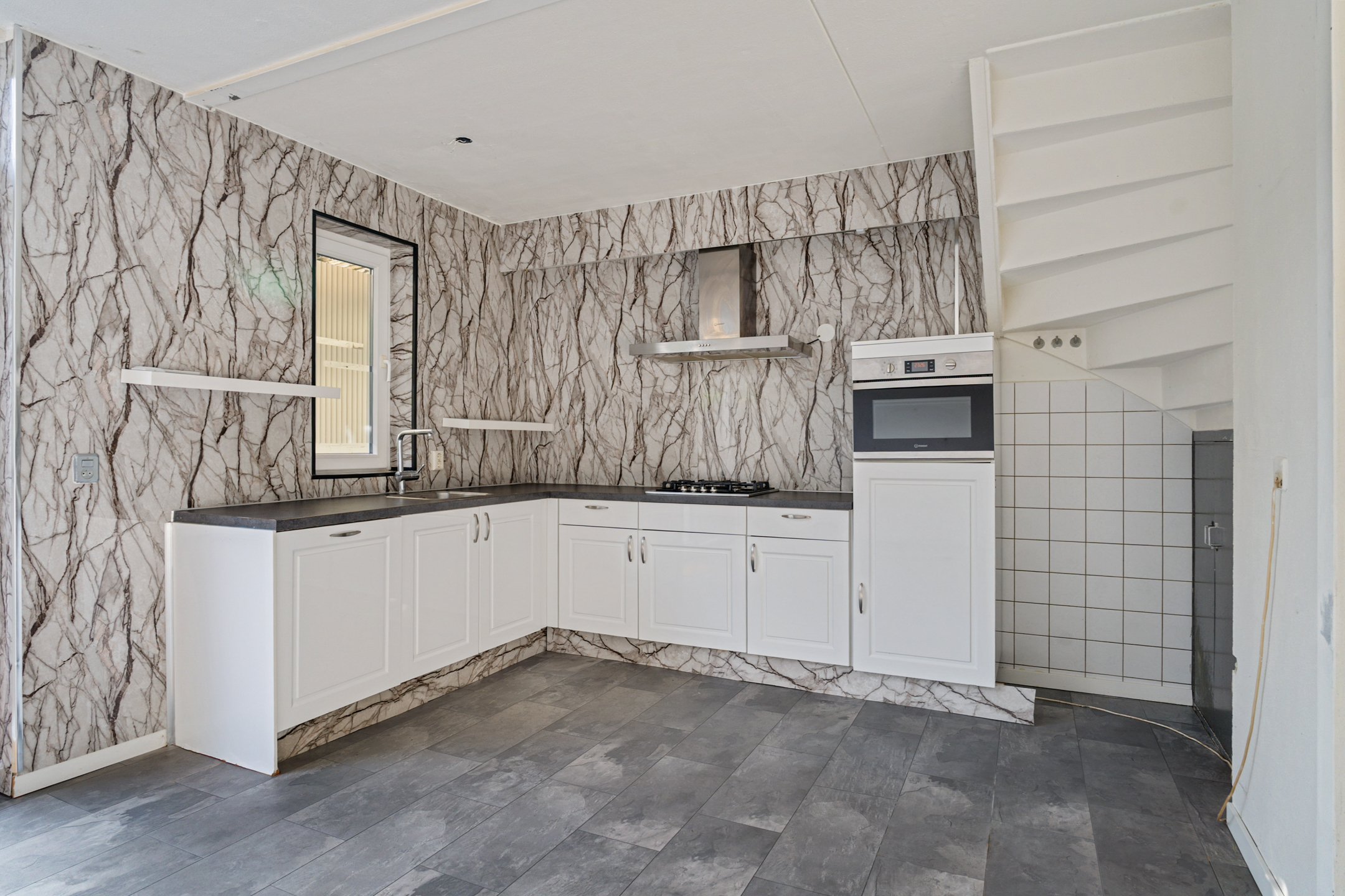 Aan de achterzijde ligt de open keuken in hoekopstelling (2023), voorzien van een gaskookplaat, afzuigkap, oven, spoelbak en volop werk- en opbergruimte. De keuken heeft een frisse uitstraling en vormt een fijne plek om te koken én te verbinden met het gezin of gasten.