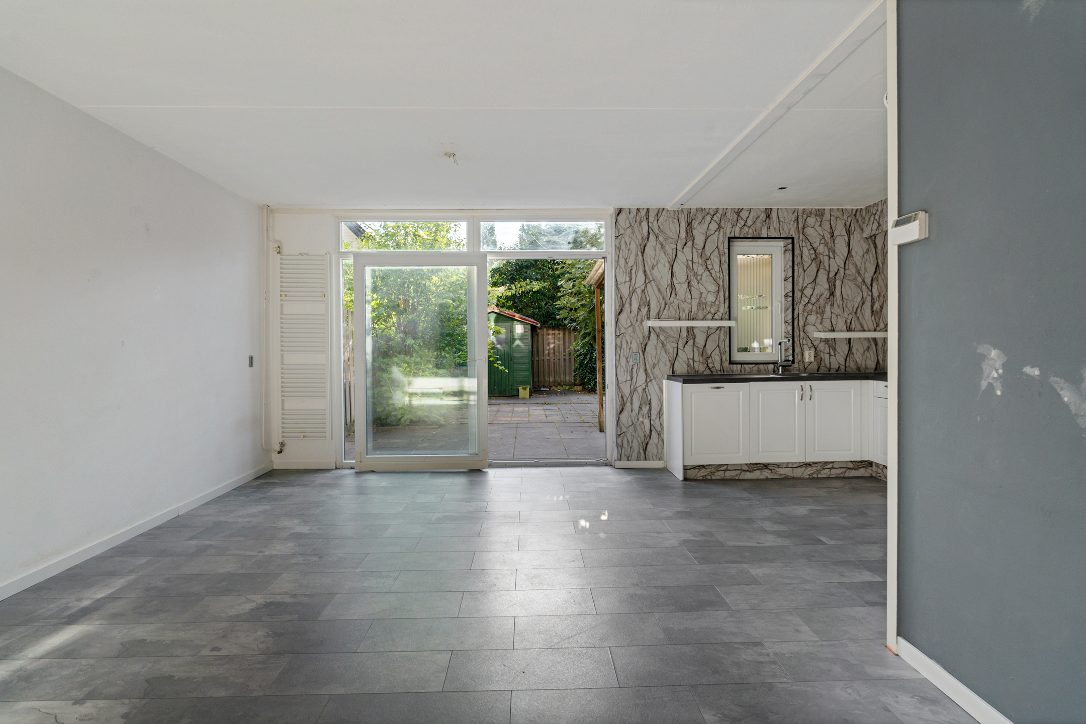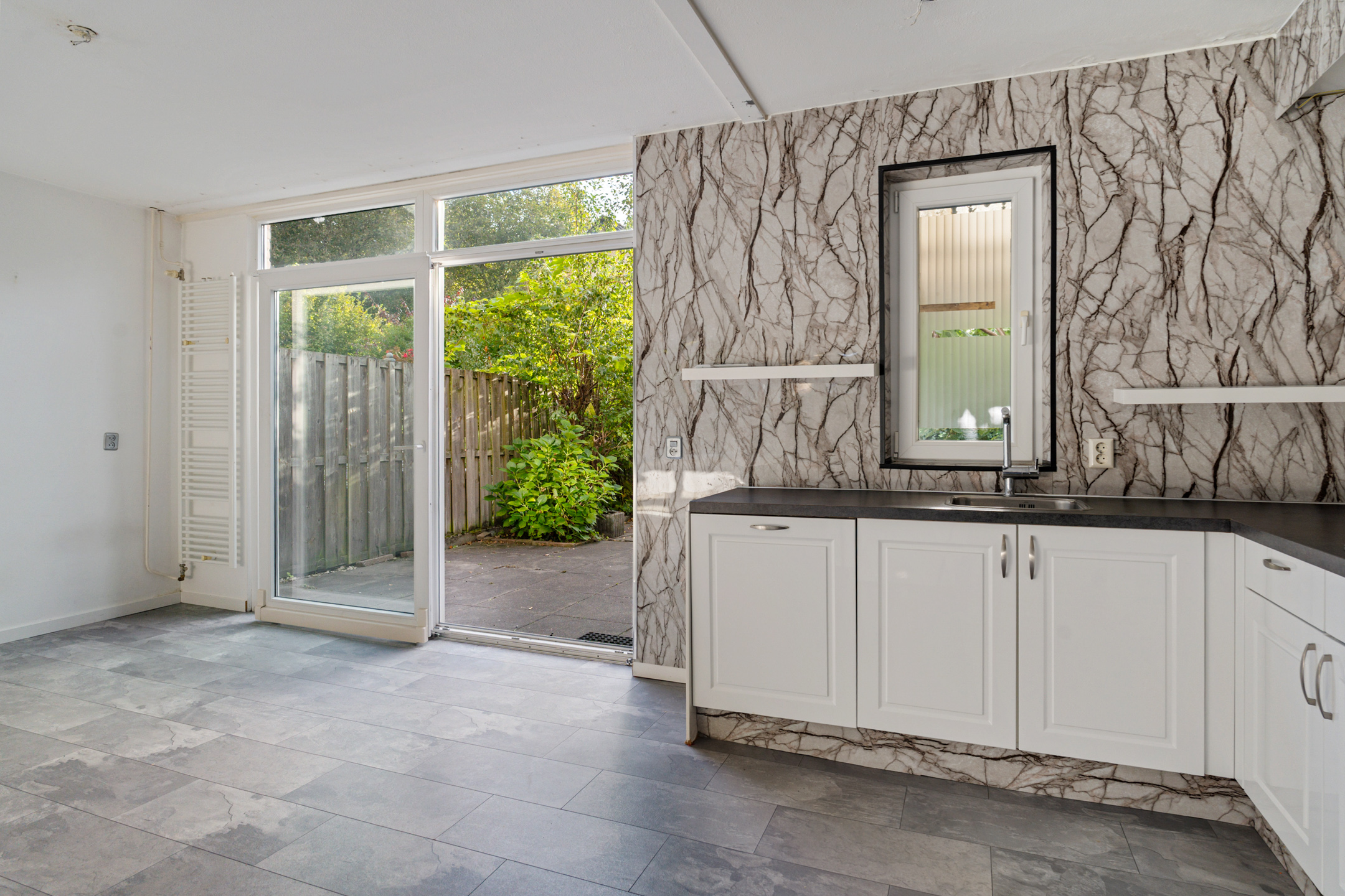 Je komt binnen via de entreehal met garderoberuimte, een vernieuwde meterkast en een keurig betegeld toilet met fonteintje. De royale doorzonwoonkamer is heerlijk licht door de grote raampartijen aan de voor- en achterzijde. Via de schuifpui stap je direct de zonnige achtertuin in.