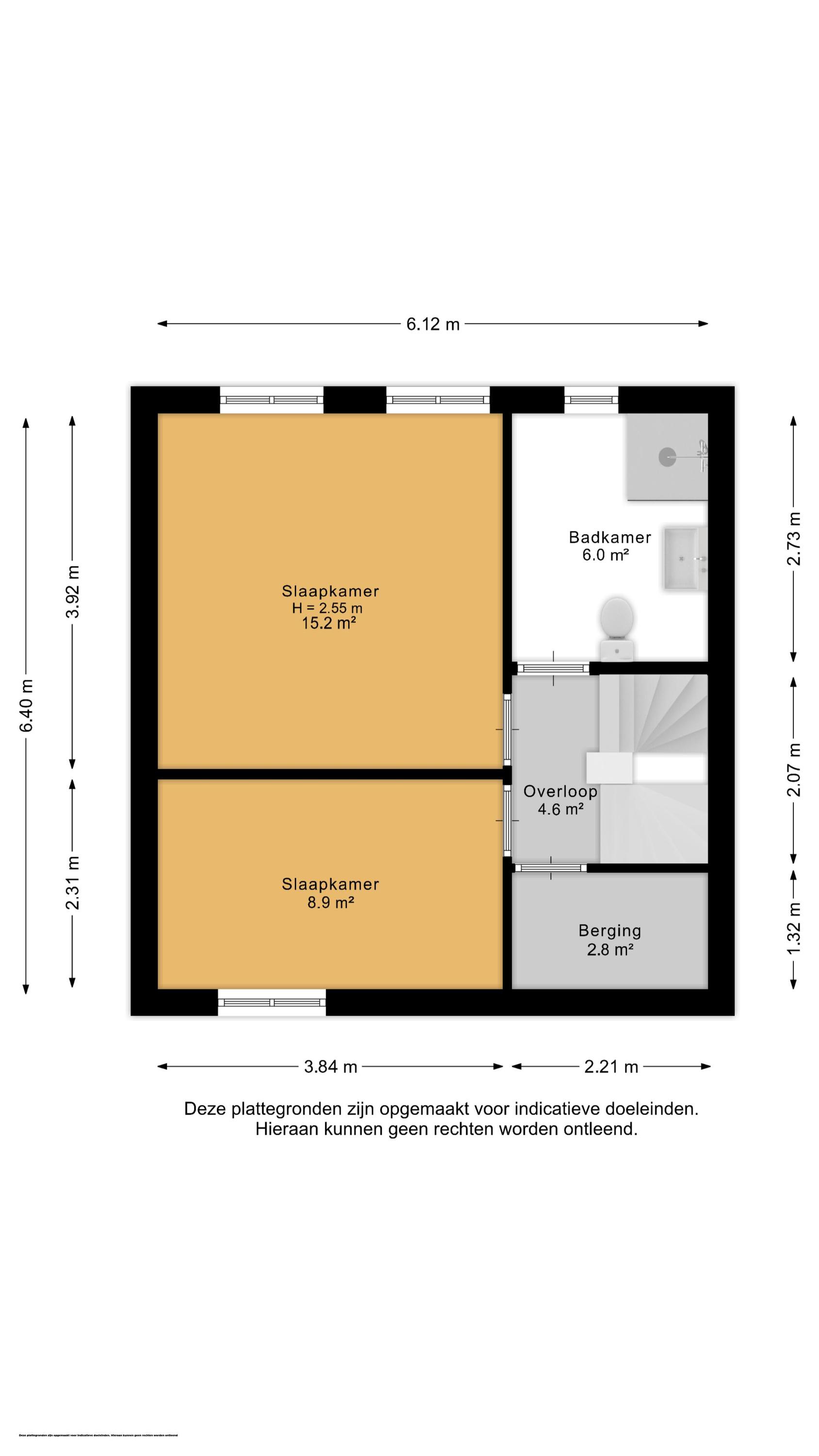 Op deze verdieping zijn twee ruime slaapkamers aanwezig. De hoofdslaapkamer is gelegen aan de achterzijde en biedt voldoende ruimte voor een groot bed en een kastenwand. Aan de voorzijde bevindt zich een tweede, eveneens goed formaat slaapkamer. De volledig betegelde badkamer beschikt over een douchecabine, wastafelmeubel, radiator, toilet en een raam voor natuurlijke ventilatie. Daarnaast is er een handige inpandige berging aanwezig, ideaal voor het opbergen van spullen.