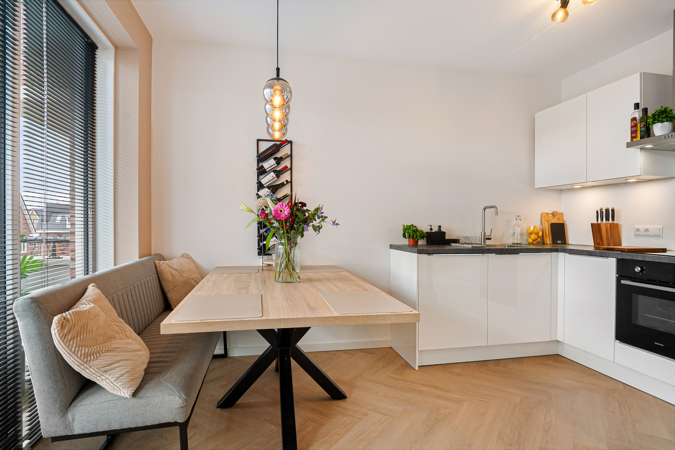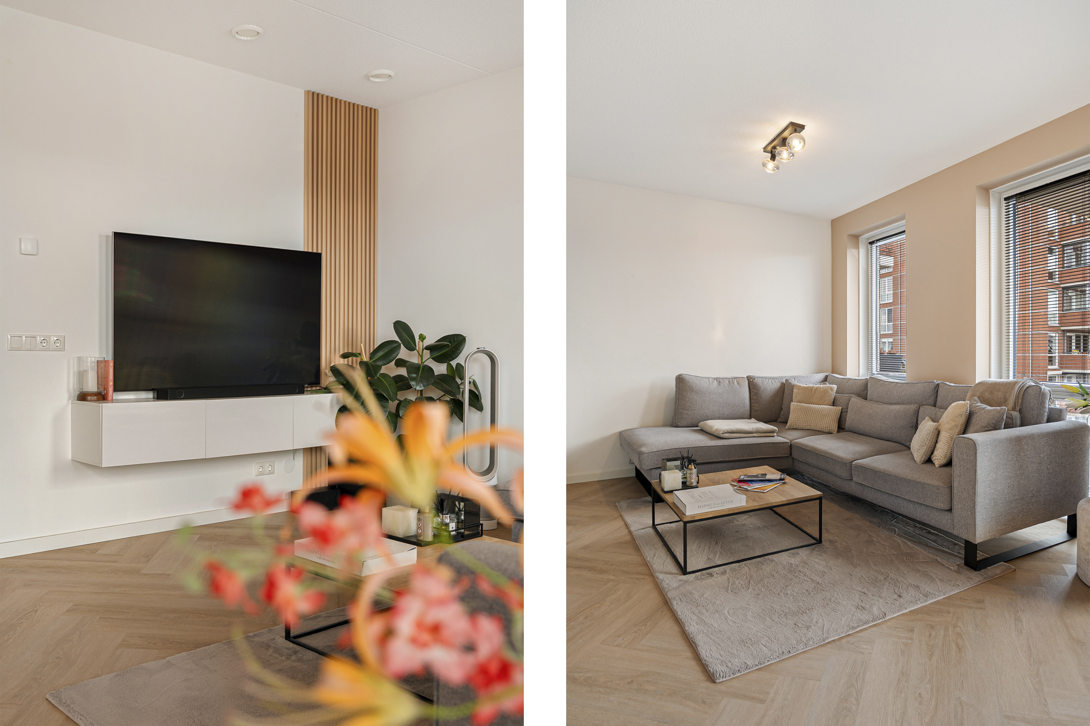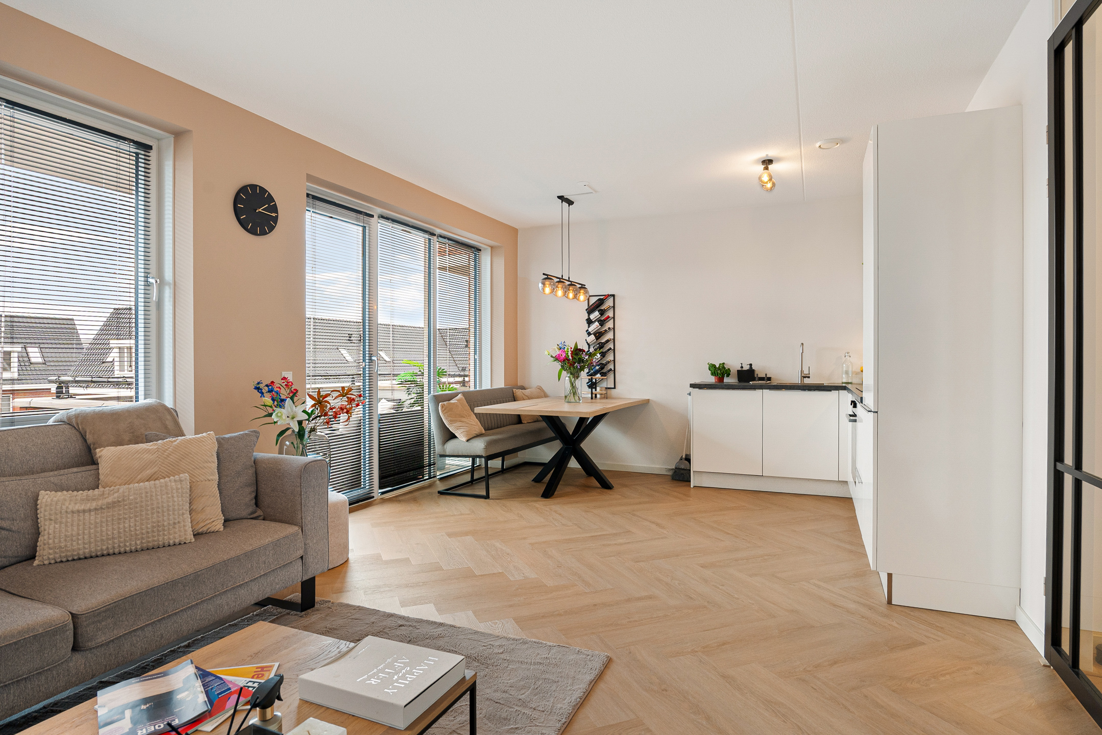 Bij binnenkomst ervaar je direct de nette en moderne afwerking. De hal biedt toegang tot de meterkast, de technische ruimte met warmtepomp en WTW installatie en een strak uitgevoerd toilet met hangcloset en fontein. De lichte woonkamer wordt gekenmerkt door grote raampartijen die zorgen voor veel daglicht en een ruimtelijk gevoel. De visgraatvloer loopt naadloos door in het gehele appartement en draagt bij aan de warme uitstraling.