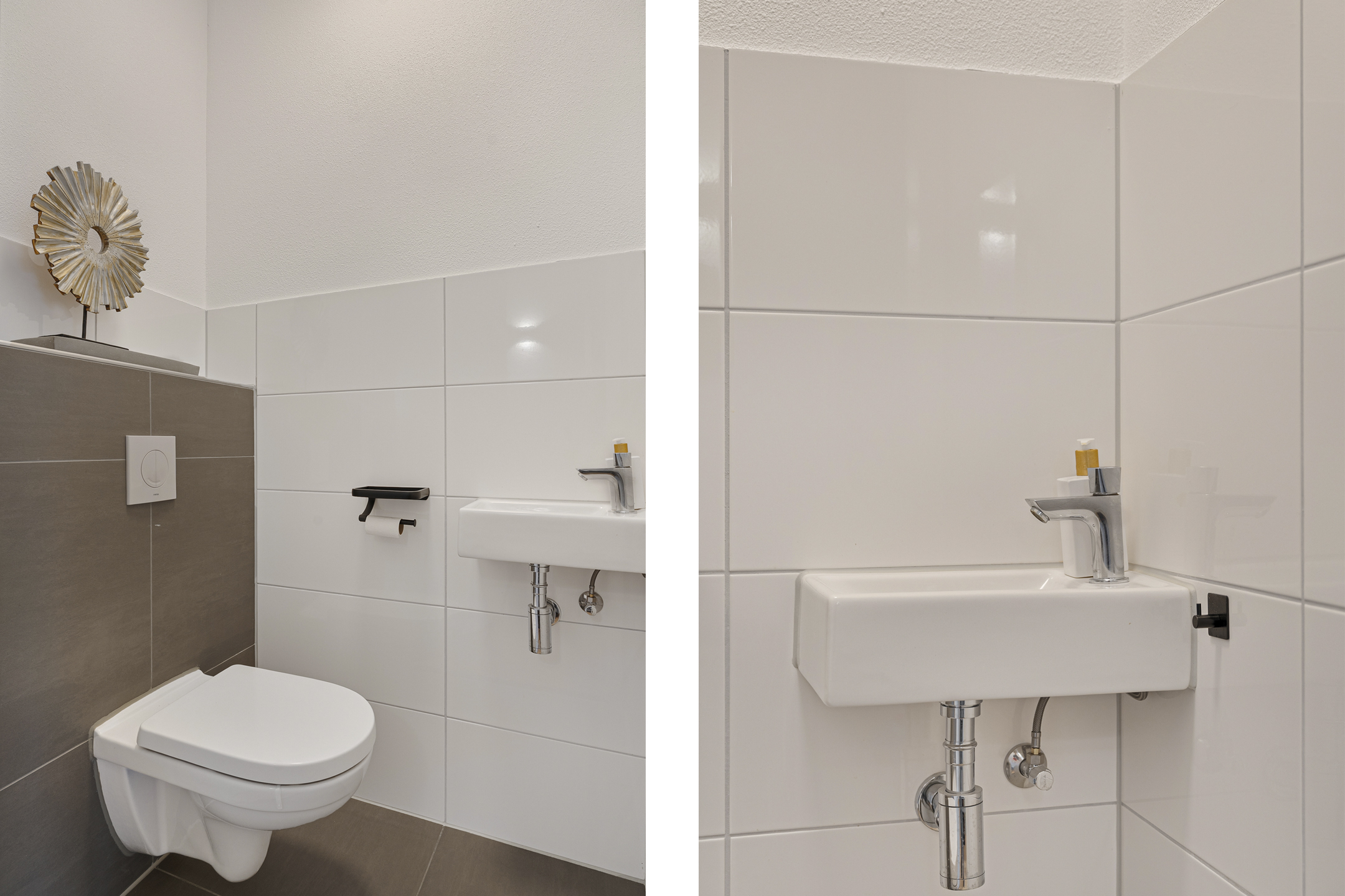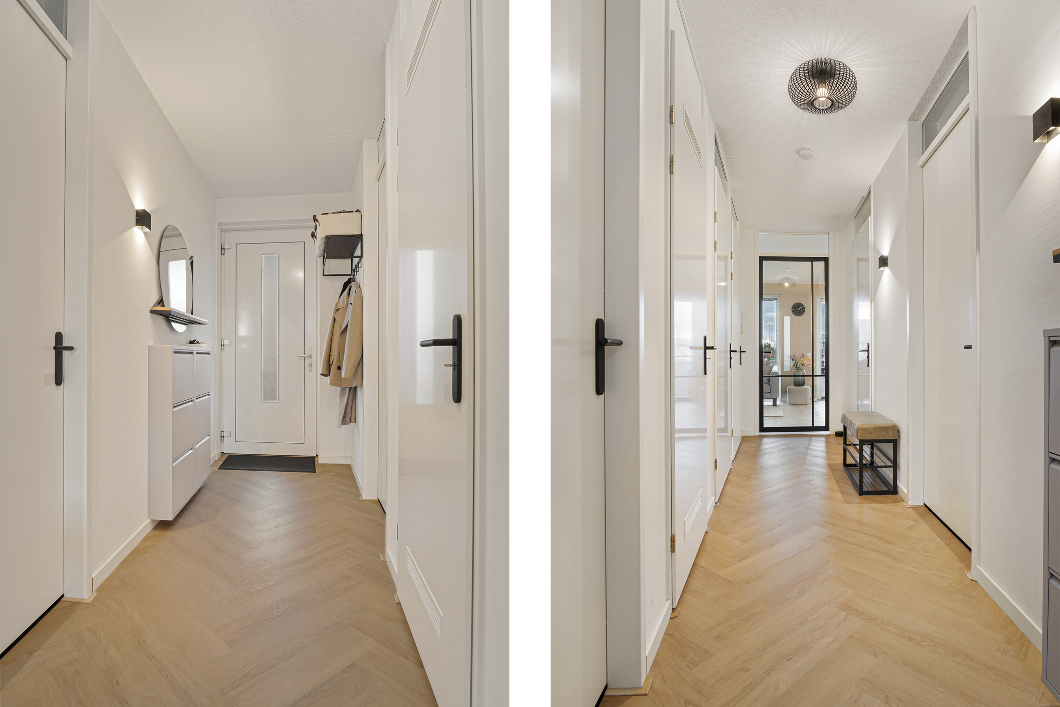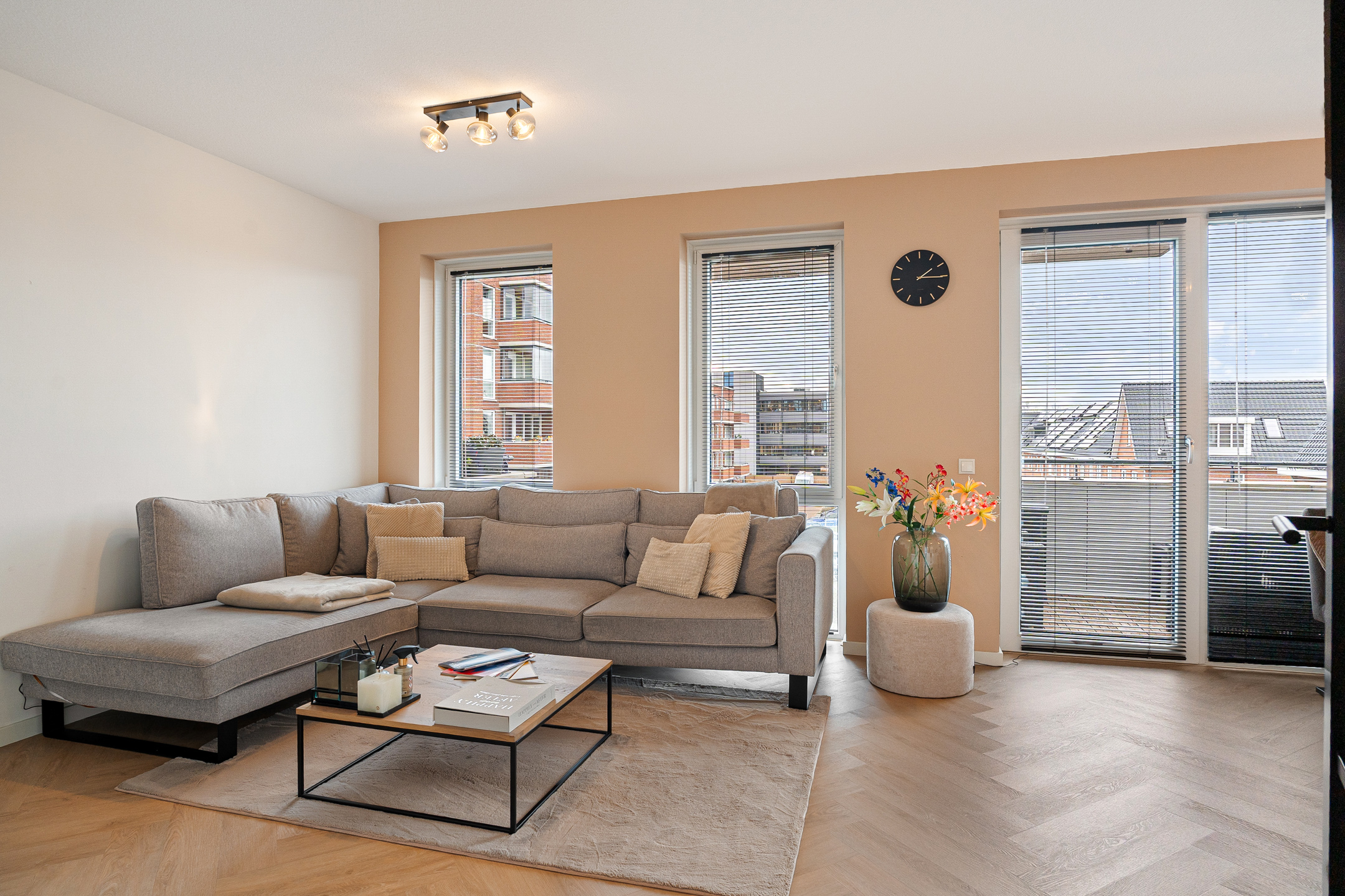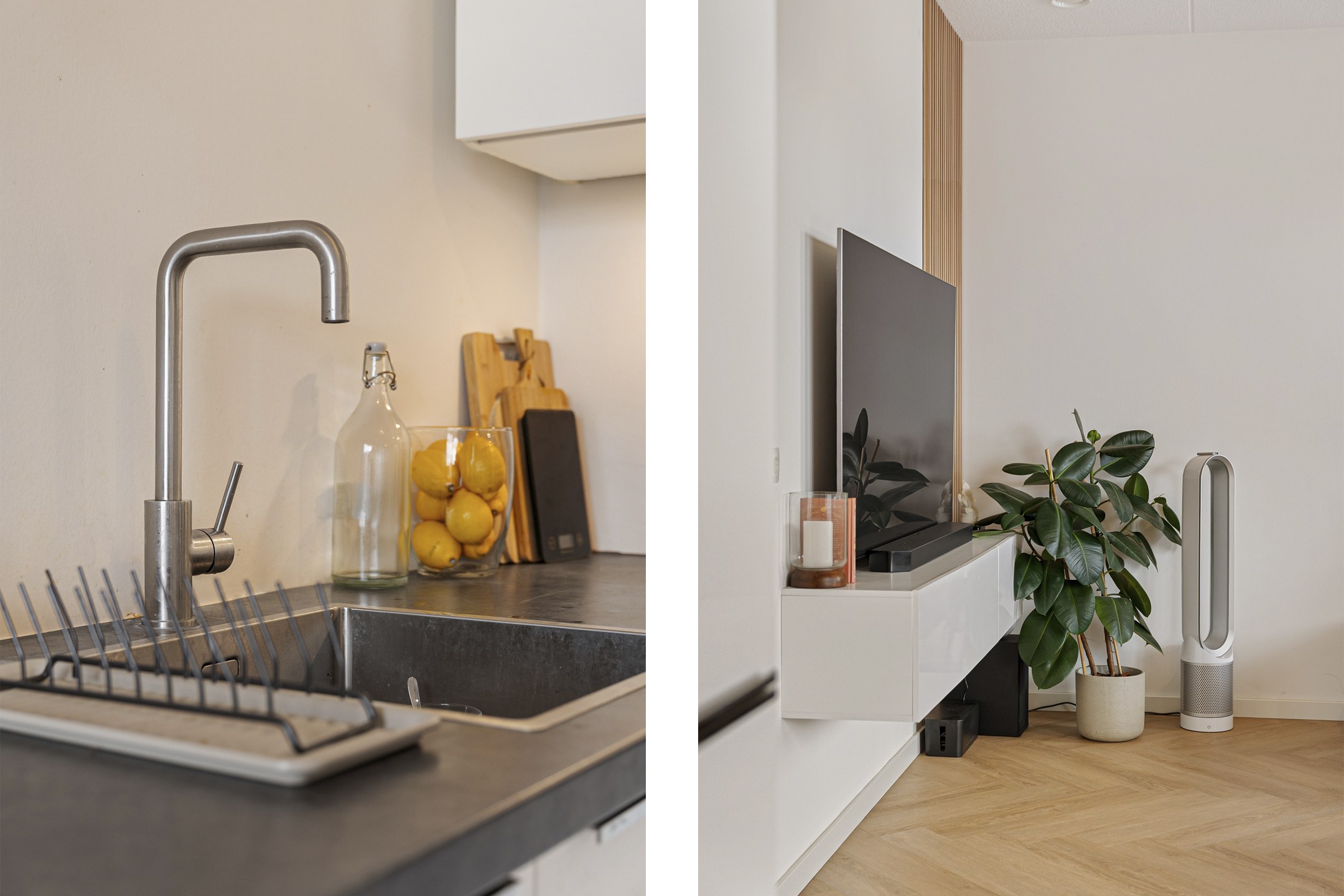 Bij binnenkomst ervaar je direct de nette en moderne afwerking. De hal biedt toegang tot de meterkast, de technische ruimte met warmtepomp en WTW installatie en een strak uitgevoerd toilet met hangcloset en fontein. De lichte woonkamer wordt gekenmerkt door grote raampartijen die zorgen voor veel daglicht en een ruimtelijk gevoel. De visgraatvloer loopt naadloos door in het gehele appartement en draagt bij aan de warme uitstraling.