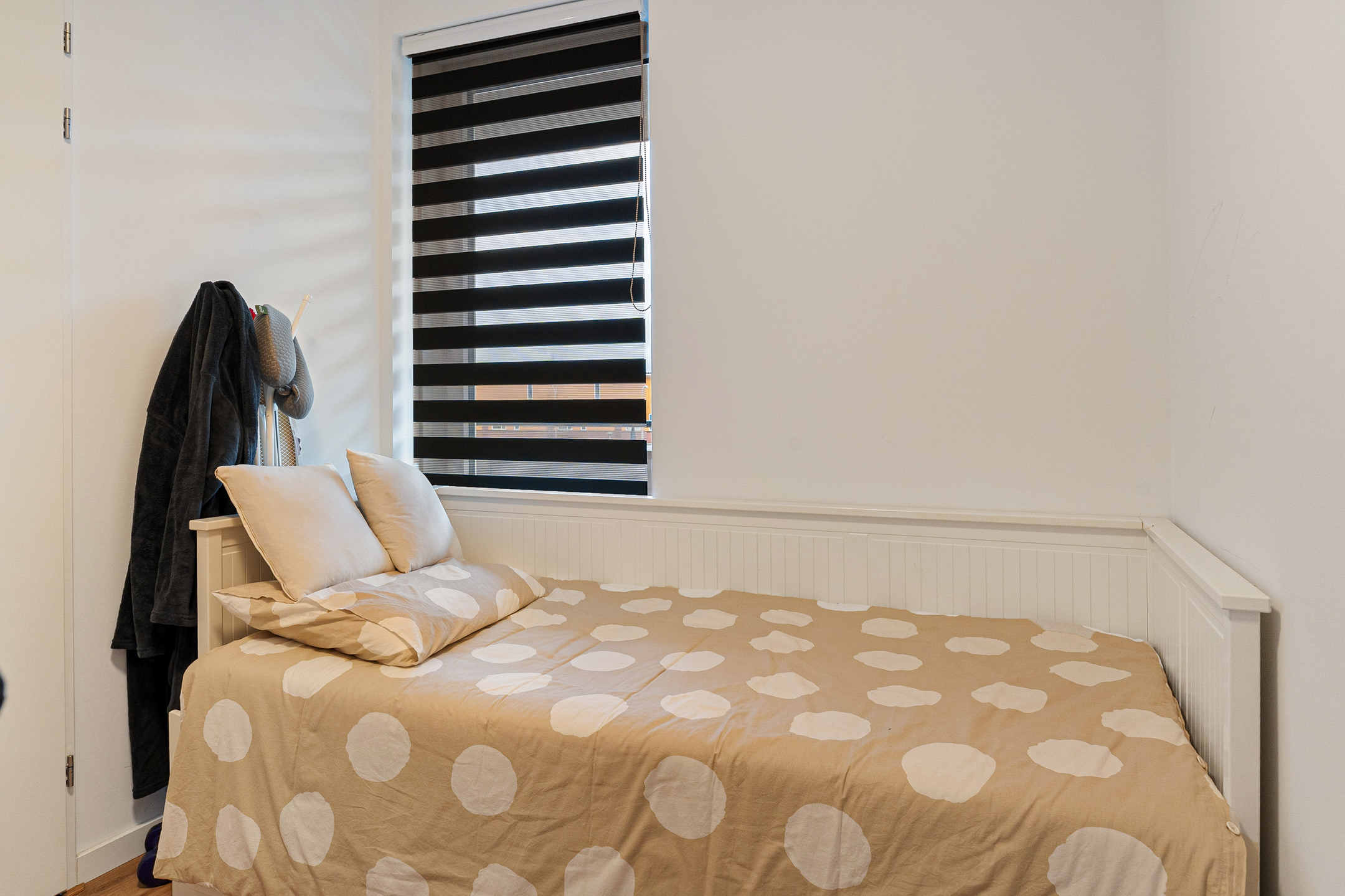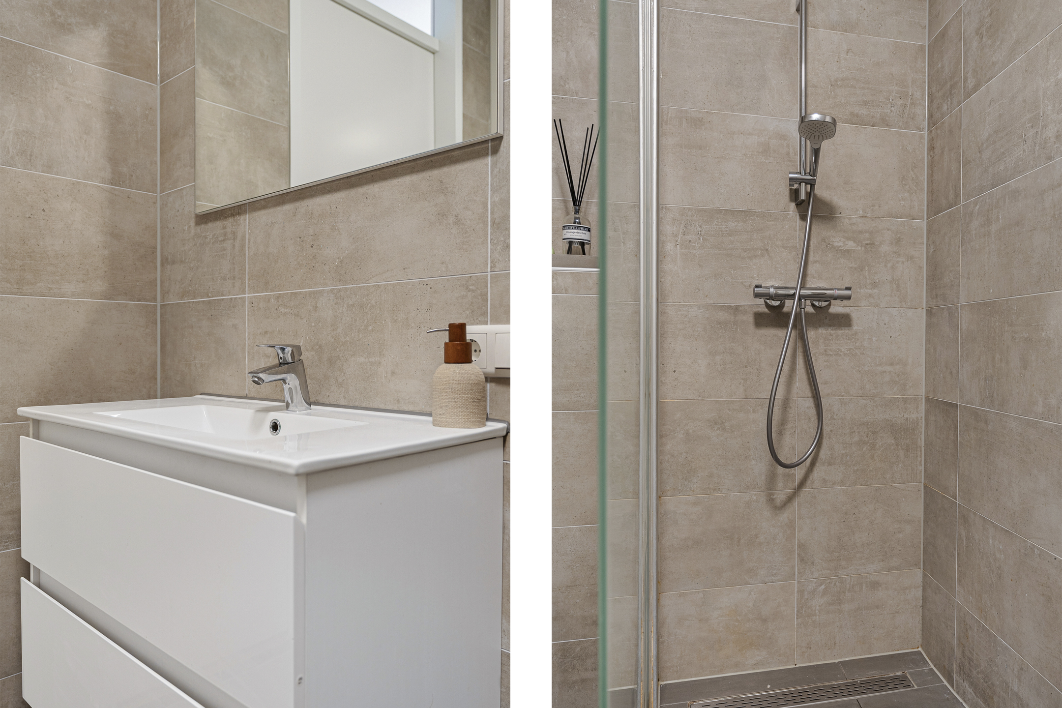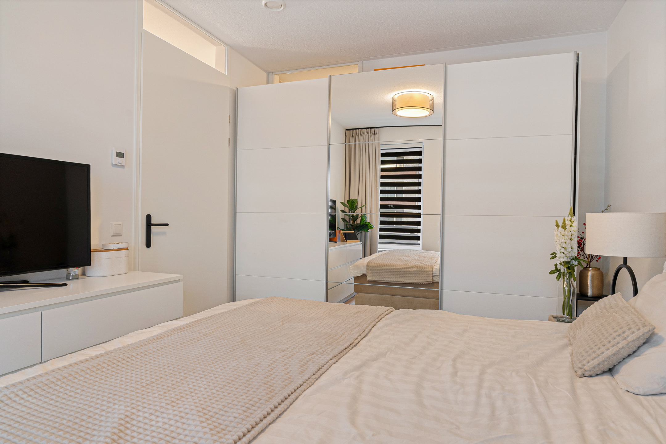 Het appartement beschikt over twee slaapkamers. De hoofdslaapkamer meet circa 13 m² en biedt volop ruimte voor een tweepersoonsbed en kastruimte. De tweede kamer van circa 7 m² is ideaal als werkplek, logeerkamer of kinderkamer. De moderne badkamer is volledig betegeld en uitgevoerd met een ruime inloopdouche, wastafelmeubel, tweede toilet, elektrische radiator en comfortabele vloerverwarming.