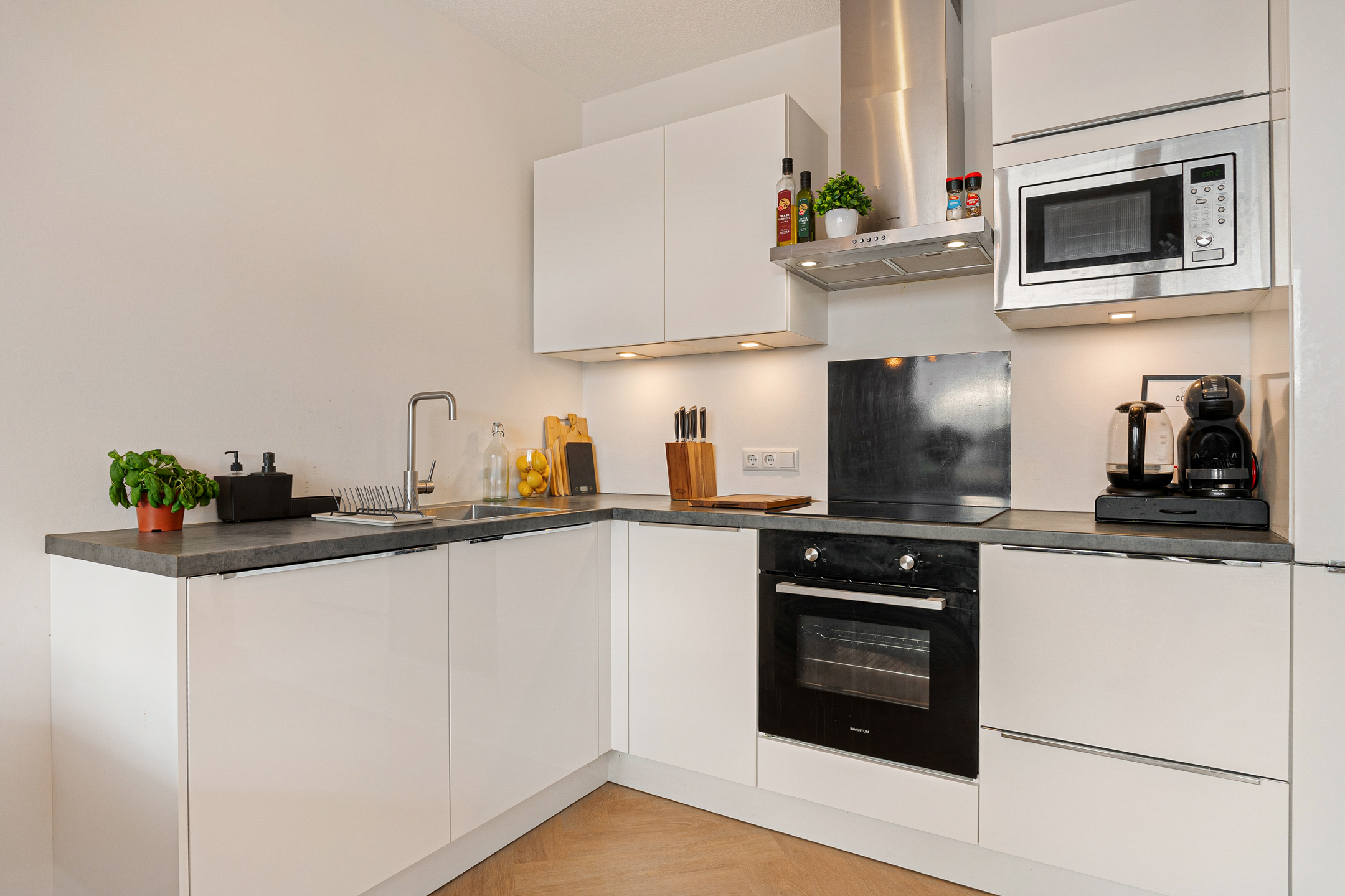 De open keuken is opgesteld in een praktische L vorm en voorzien van moderne inbouwapparatuur, waaronder een inductiekookplaat, oven, vaatwasser en koel vriescombinatie. Een fijne plek waar koken en wonen moeiteloos samenkomen. Vanuit de woonkamer stap je zo het ruime balkon op. Dankzij de ligging is dit een heerlijke plek om in de middag en avond van de zon te genieten.