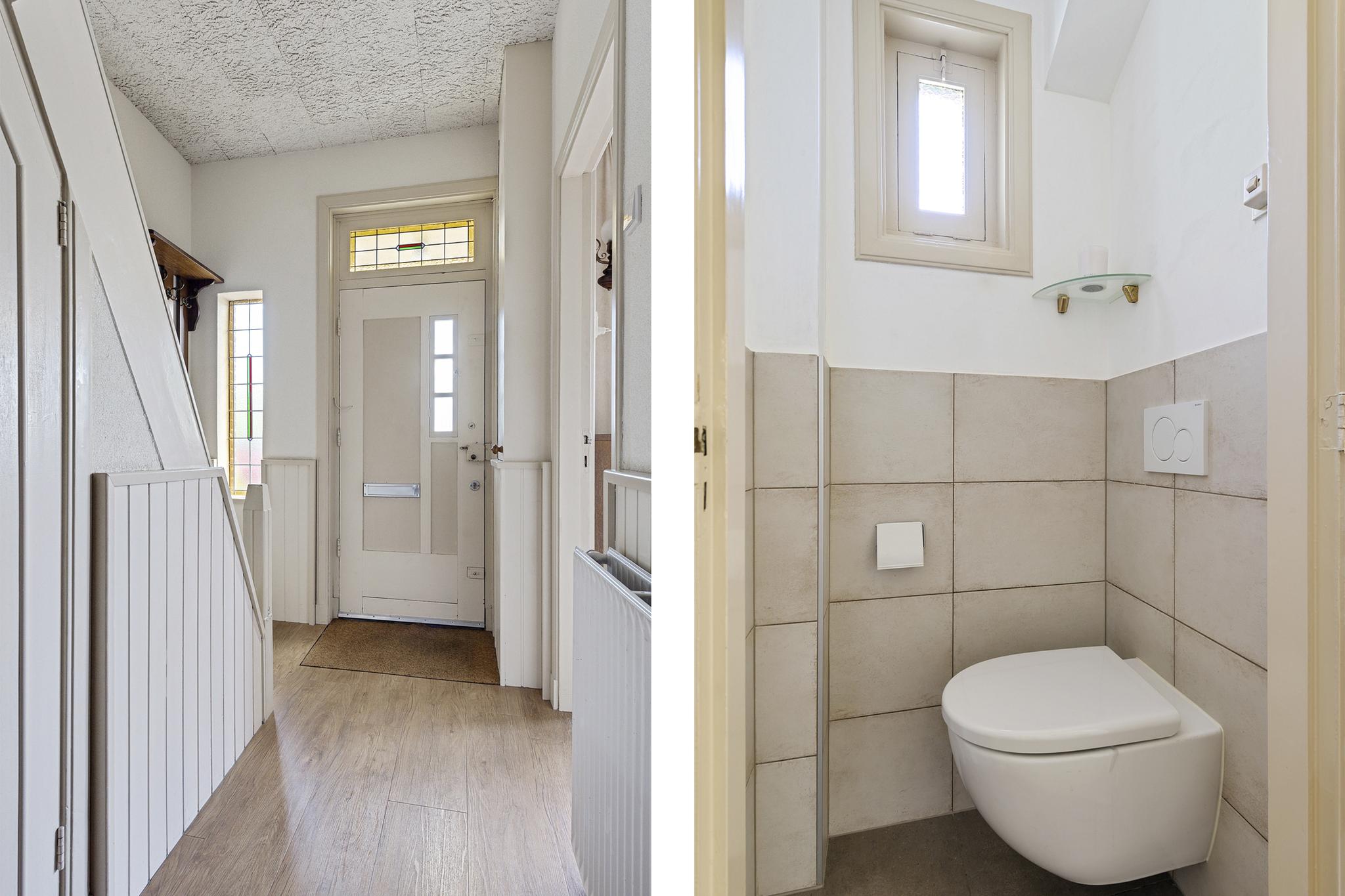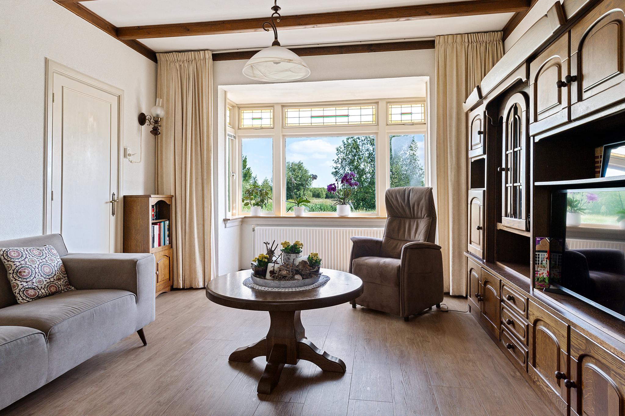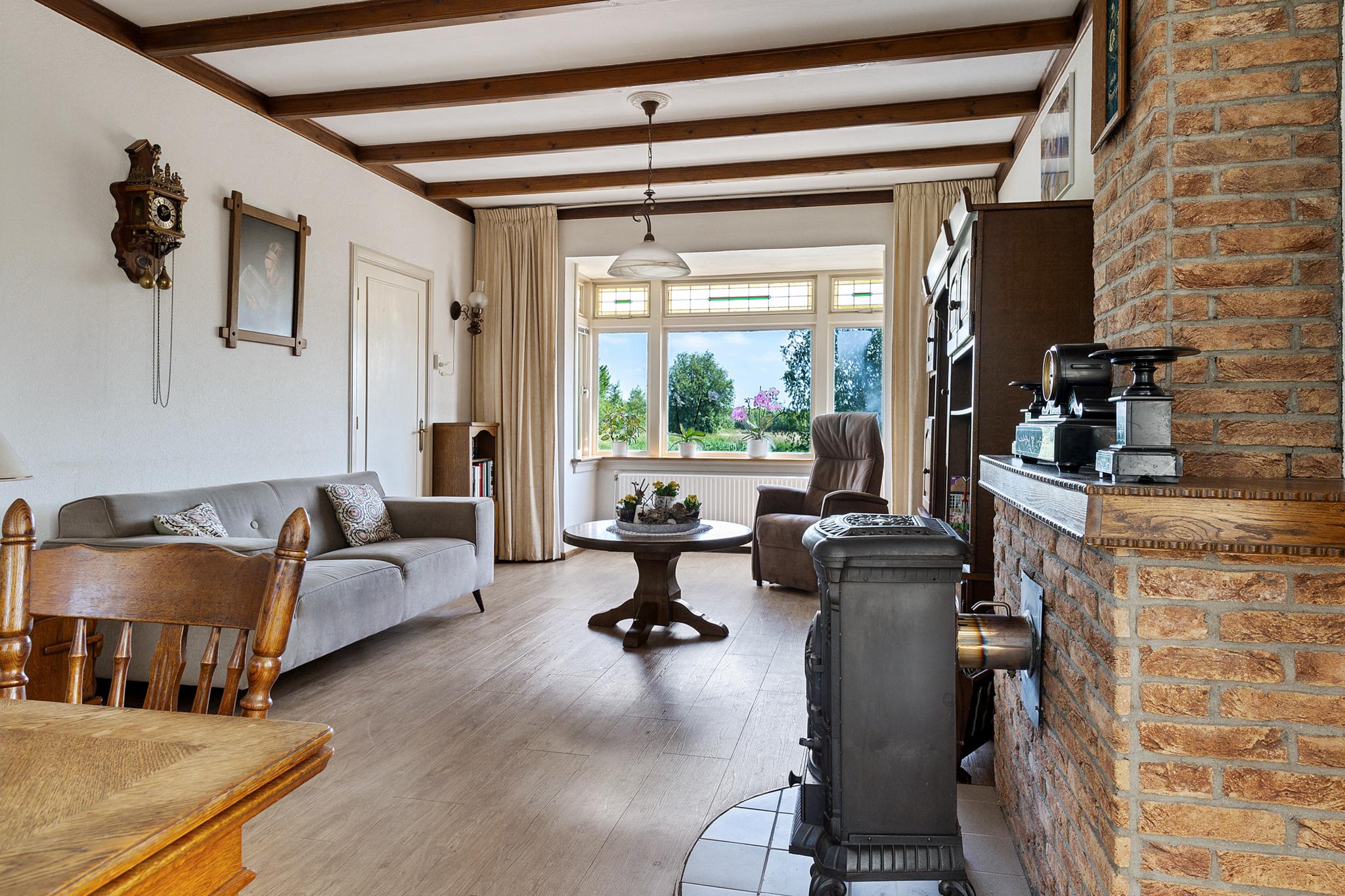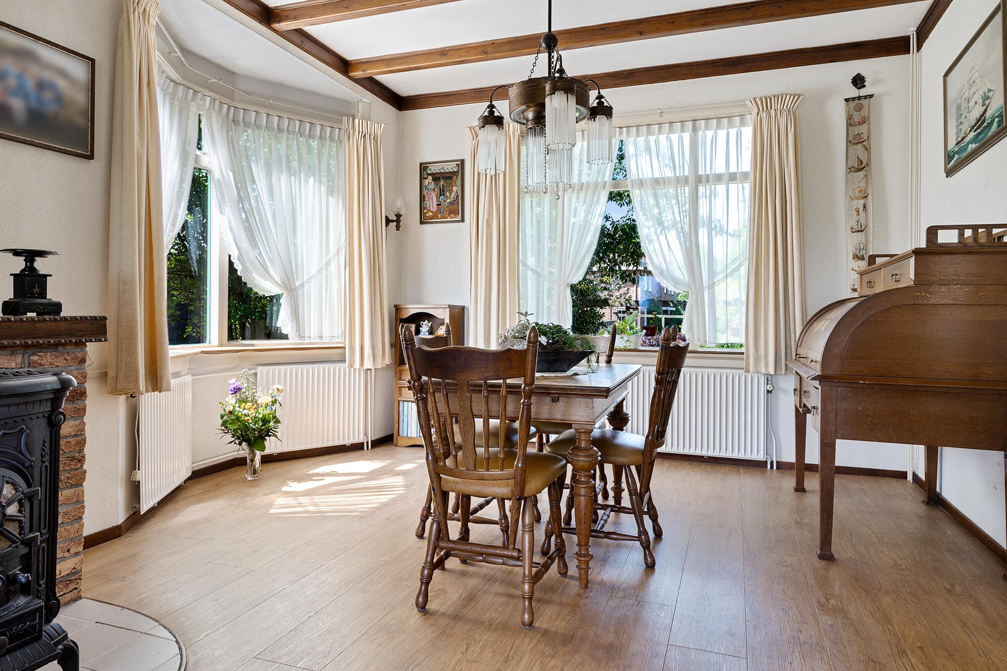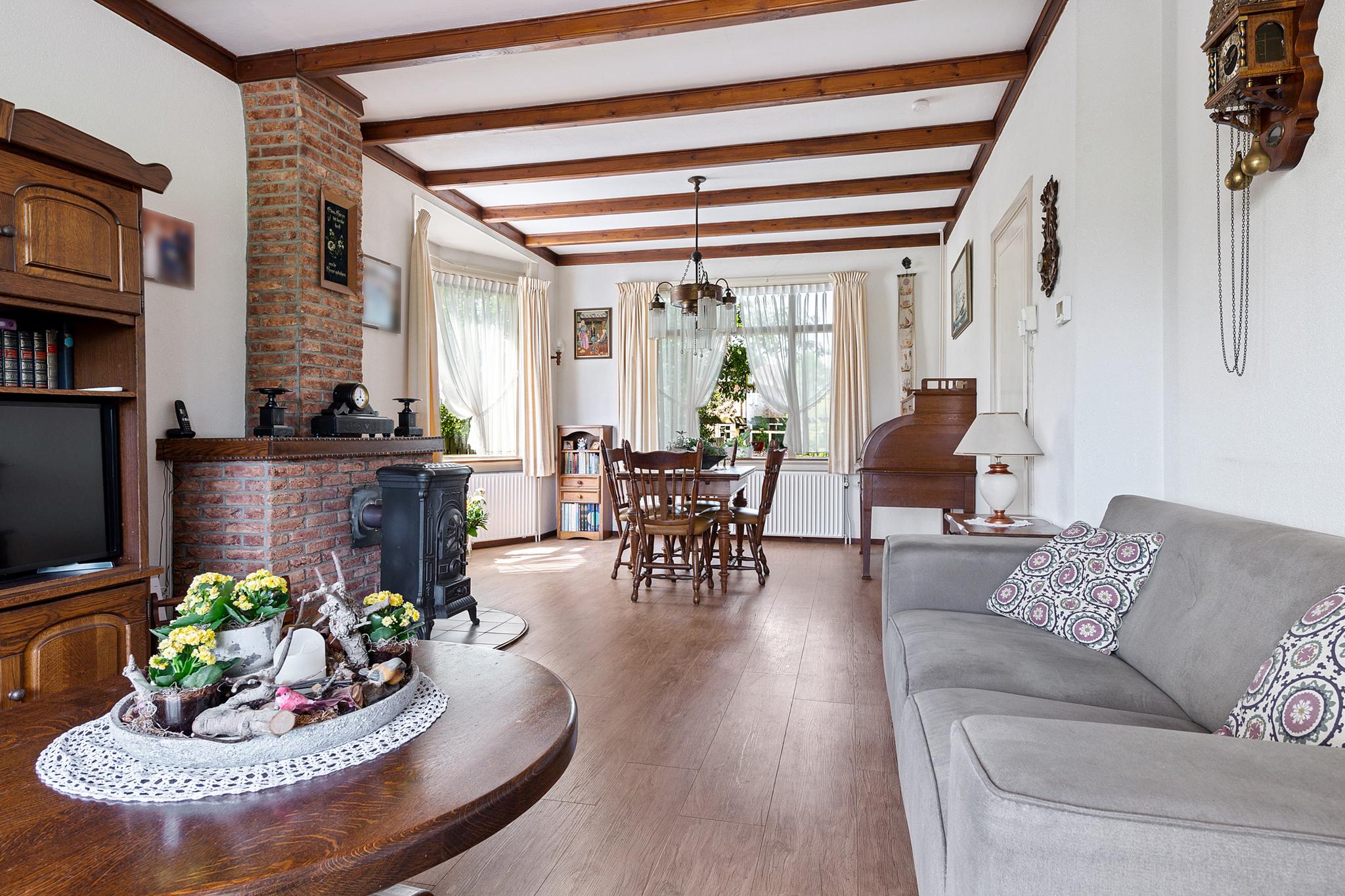 Via de hal met toilet, trapkast met toegang naar kelder en trap naar boven kom je binnen in de sfeervolle woonkamer. De erker aan de voorzijde en zijkant zorgt voor veel lichtinval, terwijl de haard centraal in de ruimte voor warmte en sfeer zorgt. Vanuit hier loop je door naar de garage, die voorzien is van extra bergruimtes, 2e doucheruimte en toegang geeft tot de kelder. Tevens geeft de bijkeuken toegang tot de achtertuin en parkeerplaats aan voorzijde.