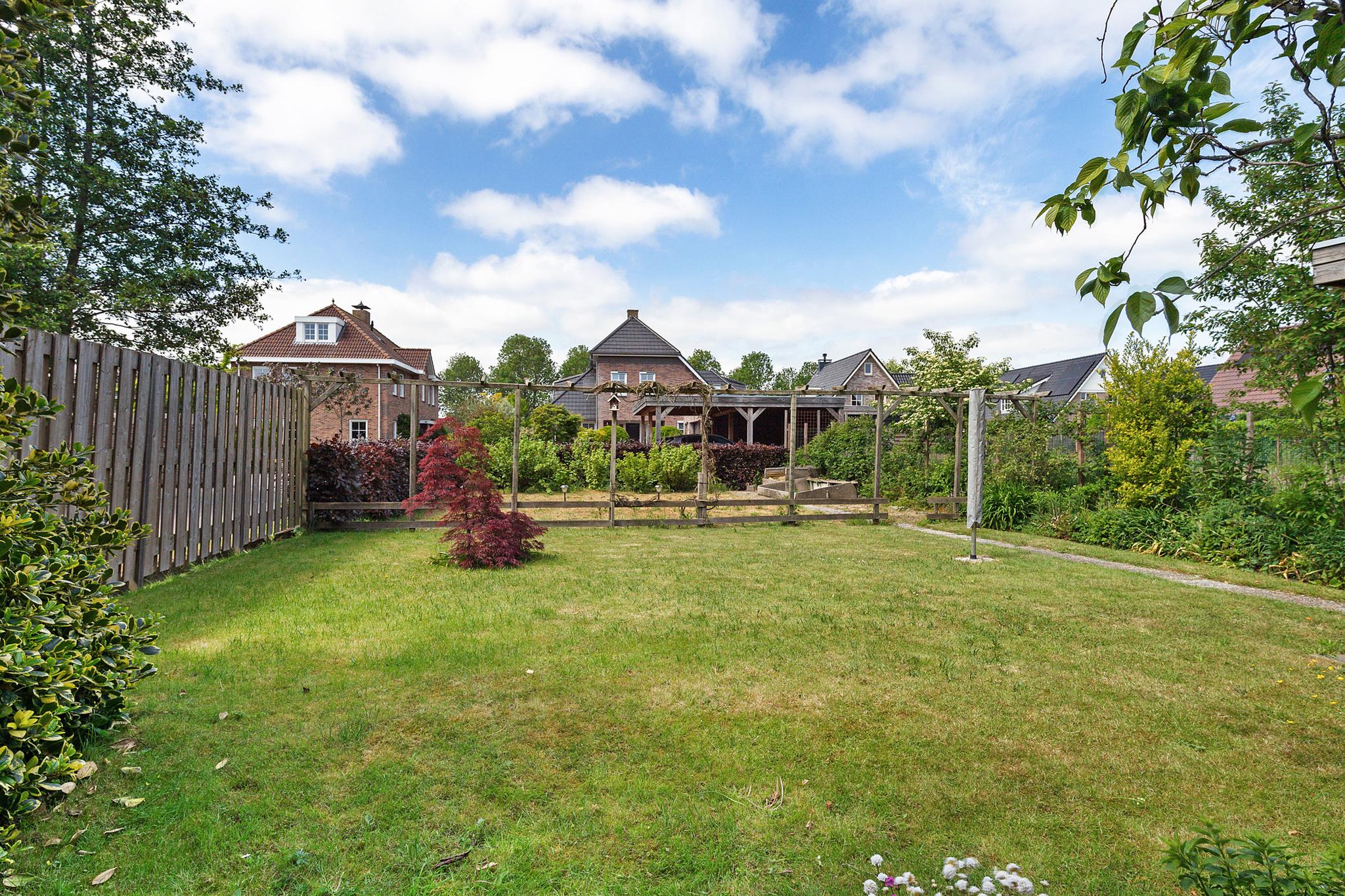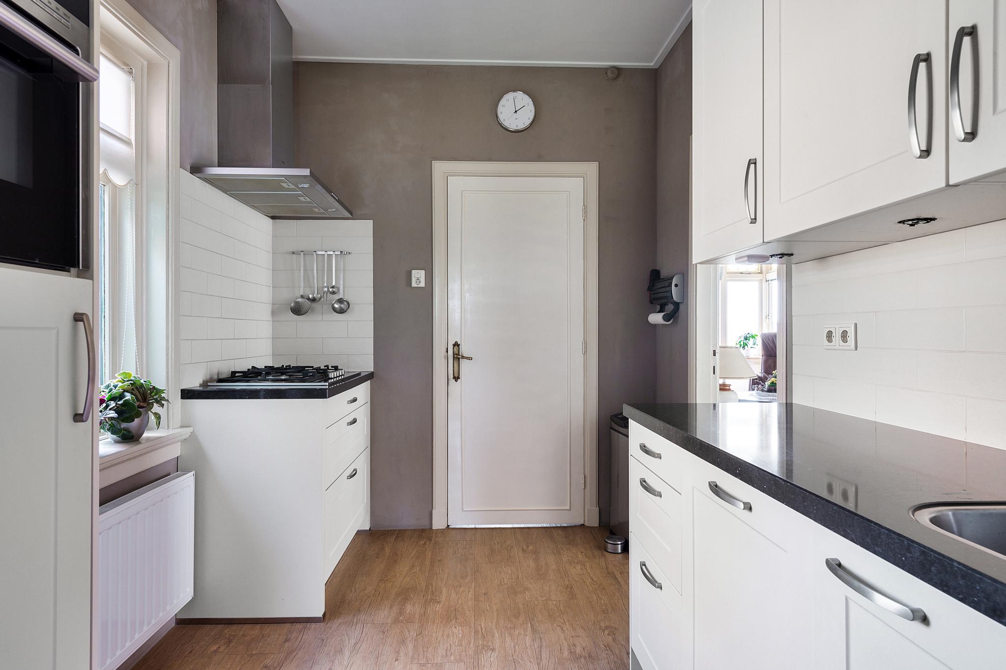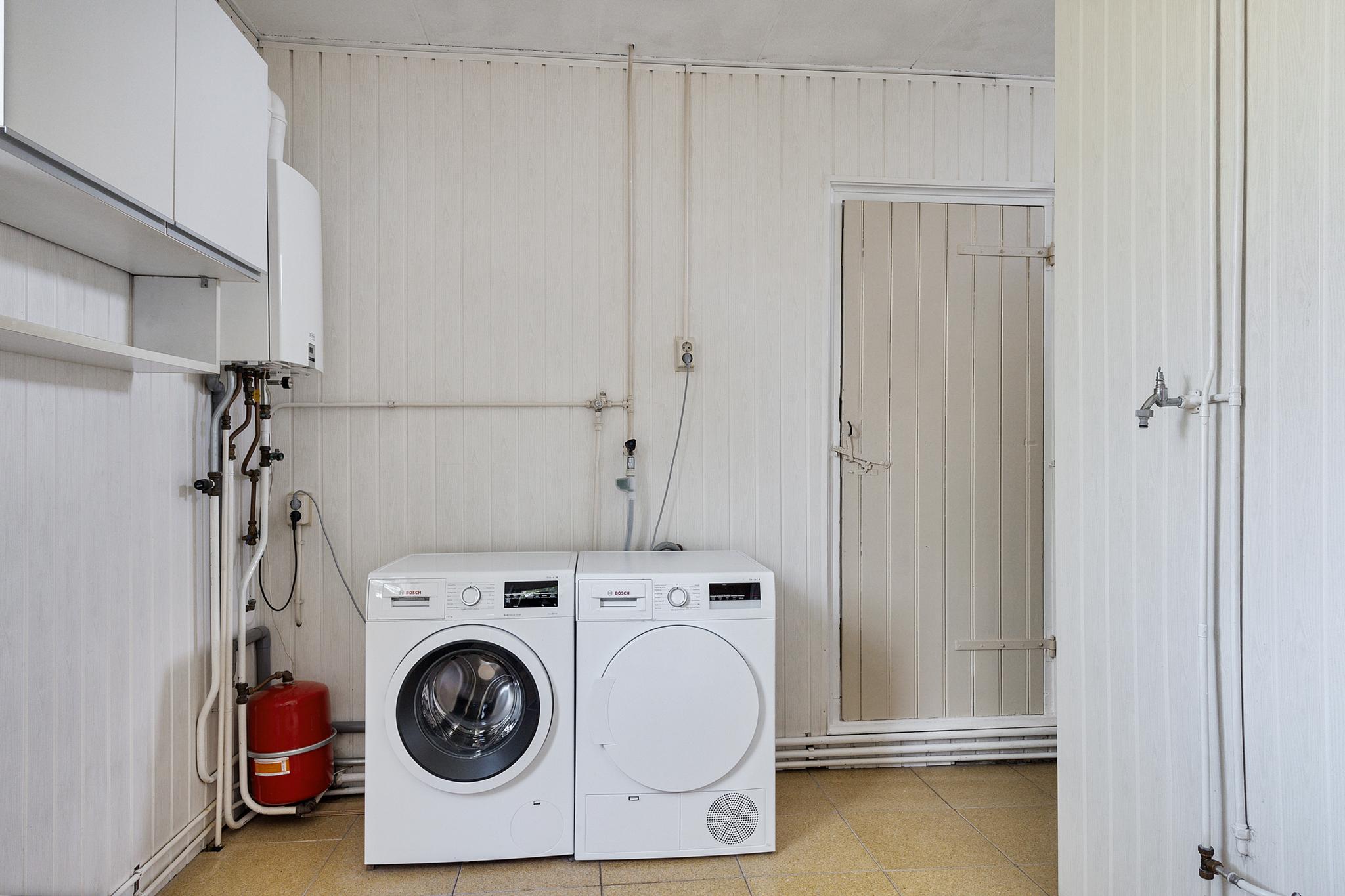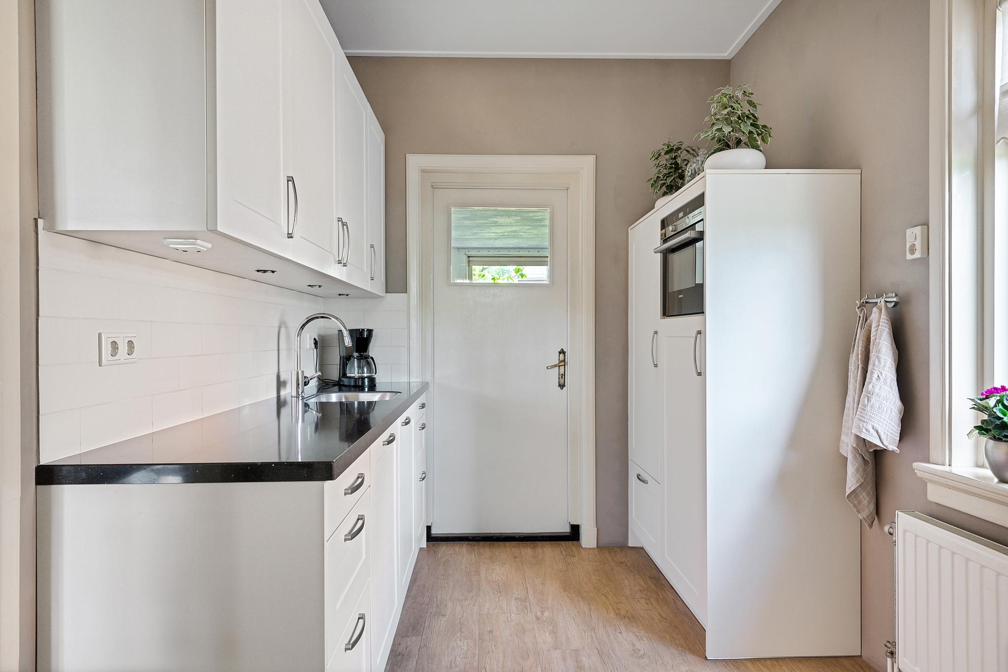 Aan de achterzijde vind je de verzorgde keuken, uitgerust met diverse inbouwapparatuur. Direct daarachter ligt de bijkeuken met plek voor je wasapparatuur. Vanuit hier loop je door naar de garage, die voorzien is van extra bergruimtes en toegang geeft tot de kelder.
