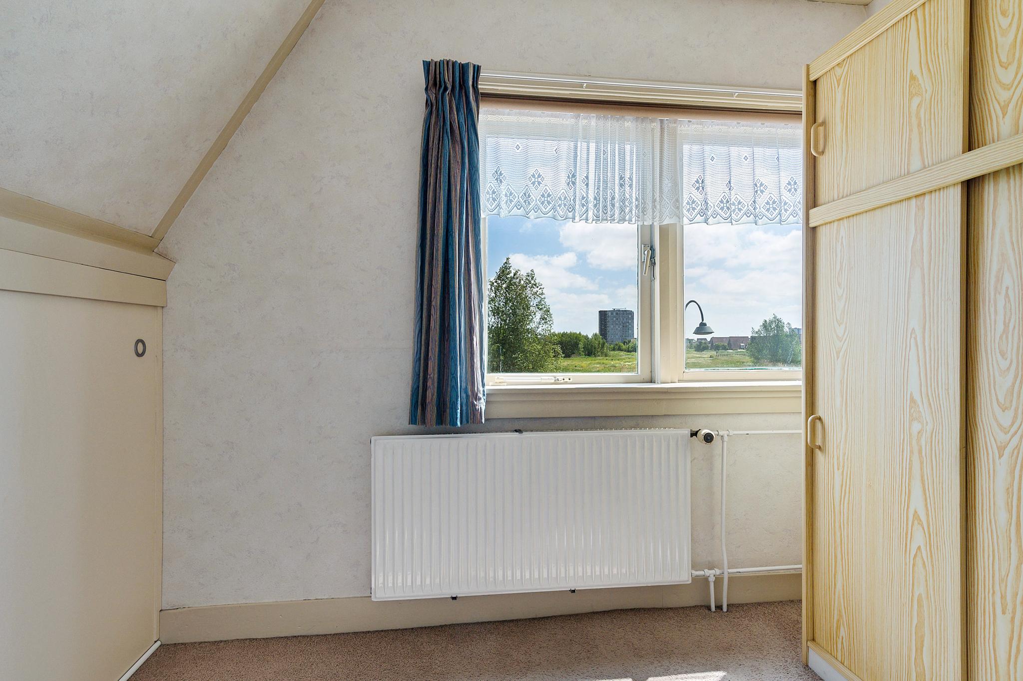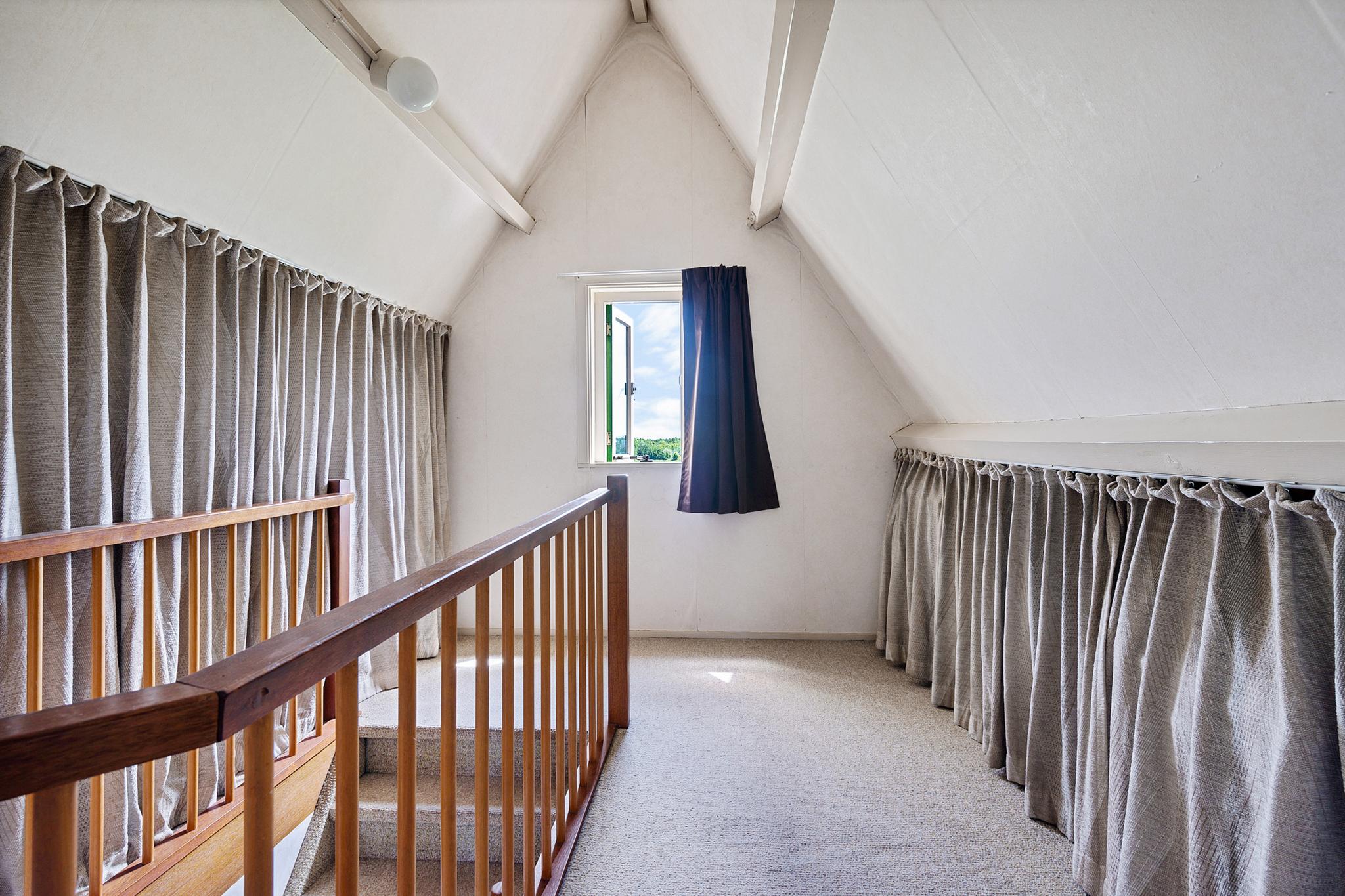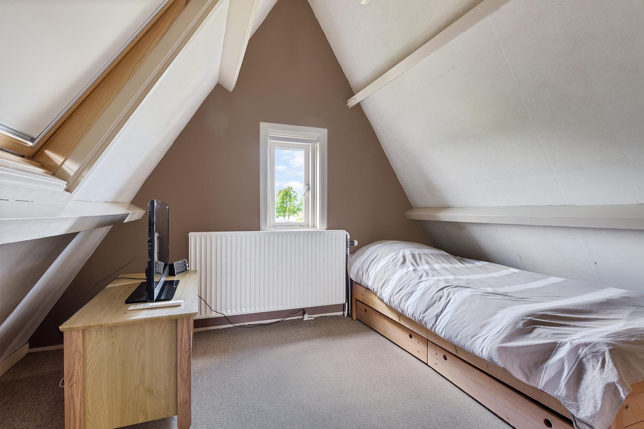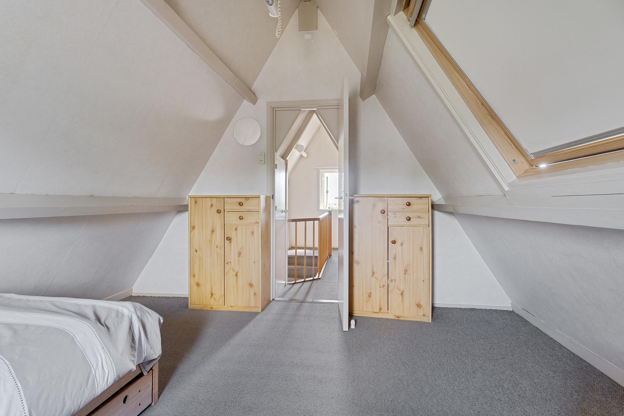 Via de ruime overloop bereik je de vierde slaapkamer, gelegen aan de achterzijde. Dankzij het dakraam geniet je hier van een prettige lichtinval. Ook is hier nog een kleine vaste bergkast aanwezig.