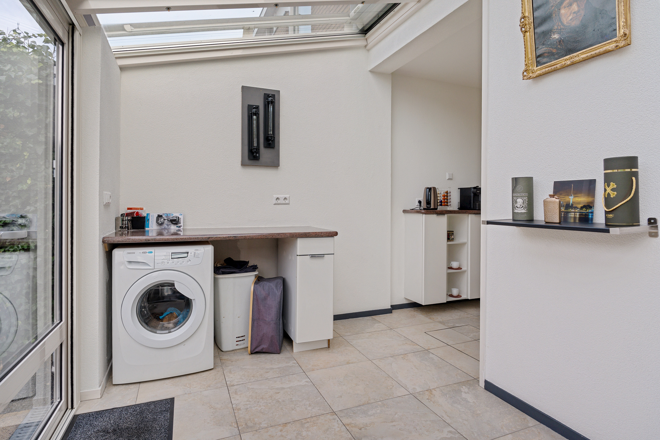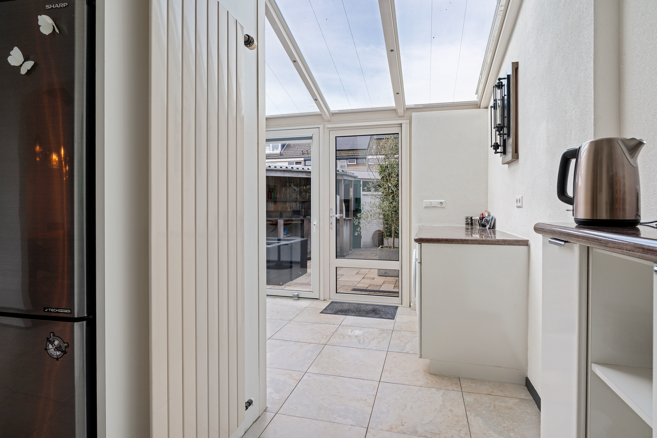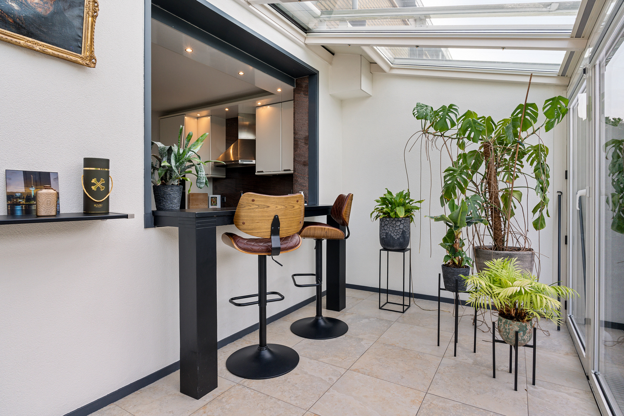 Aansluitend aan de woning bevindt zich de serre, een waardevolle toevoeging die het buitenleven op een natuurlijke manier met binnen verbindt. De serre is voorzien van speciale zon- /warmte werende en isolerende plissé op de binnenzijde van de ramen en aan de buitenzijde is er een elektrisch zonnescherm. De garage is bereikbaar vanuit de tuin en voorzien van een elektrische deur en extra bergruimte.