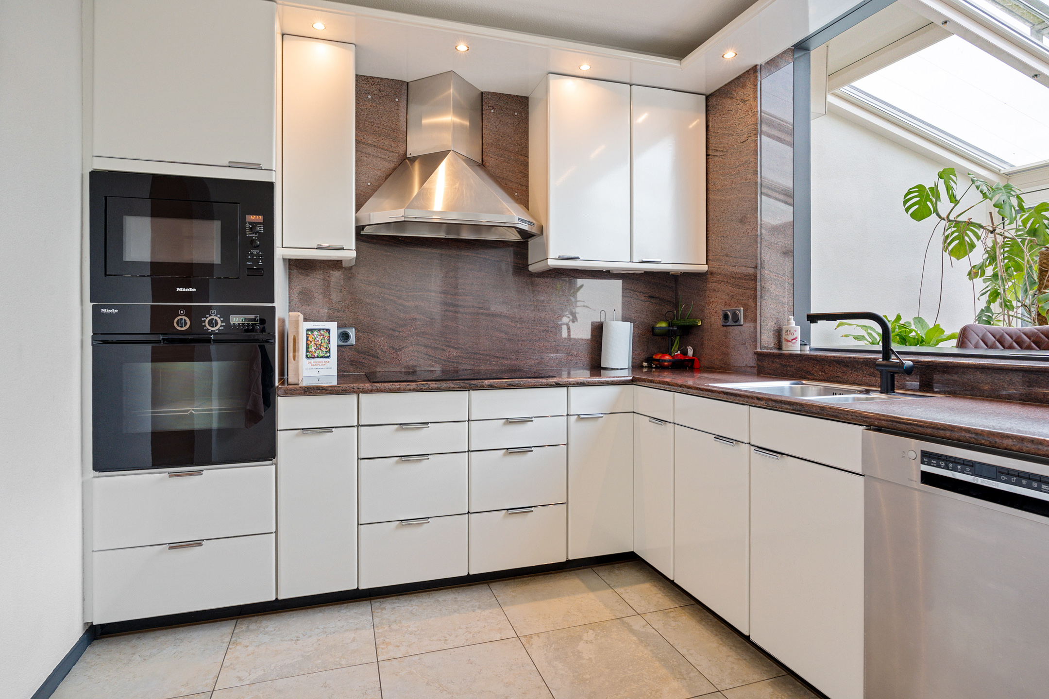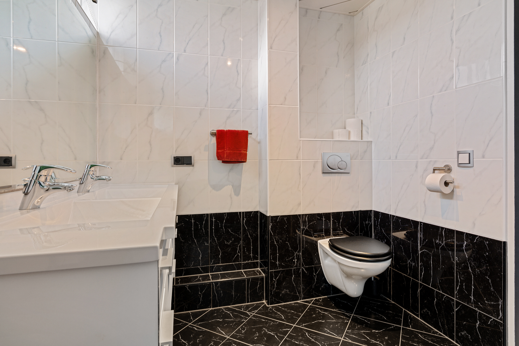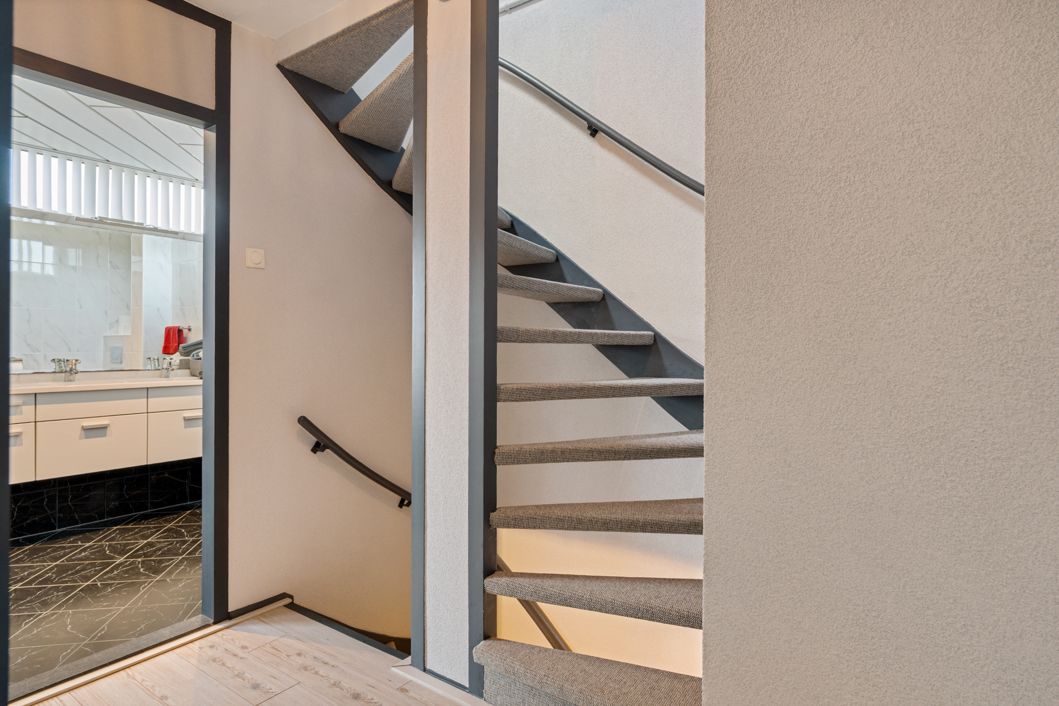 De keuken is compleet uitgevoerd en praktisch ingedeeld, met voldoende werk- en kastruimte. De begane grond is voorzien van vloerverwarming, wat bijdraagt aan het comfortabele woonklimaat. In de hal, nabij de trapopgang, bevindt zich een separate toiletruimte.