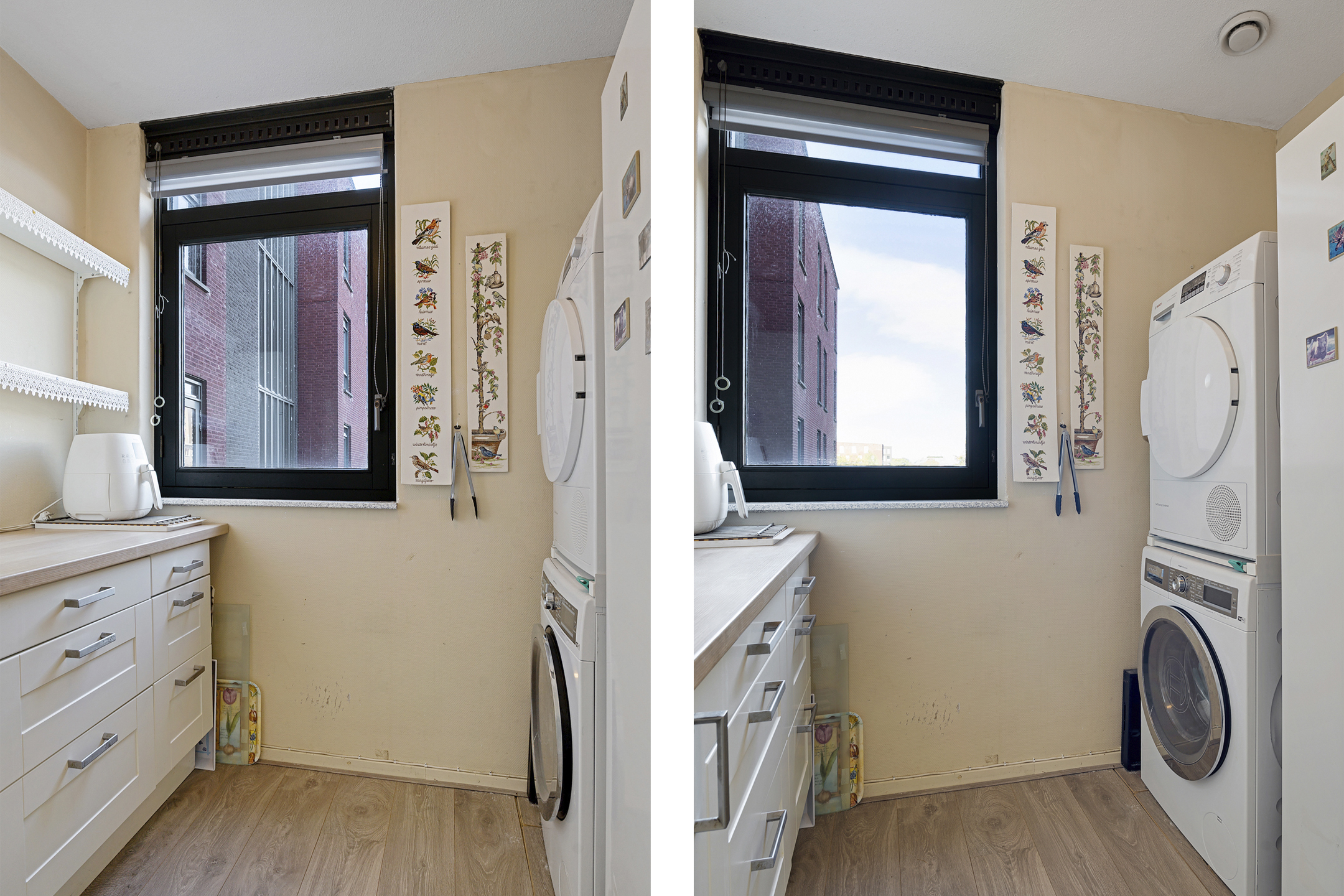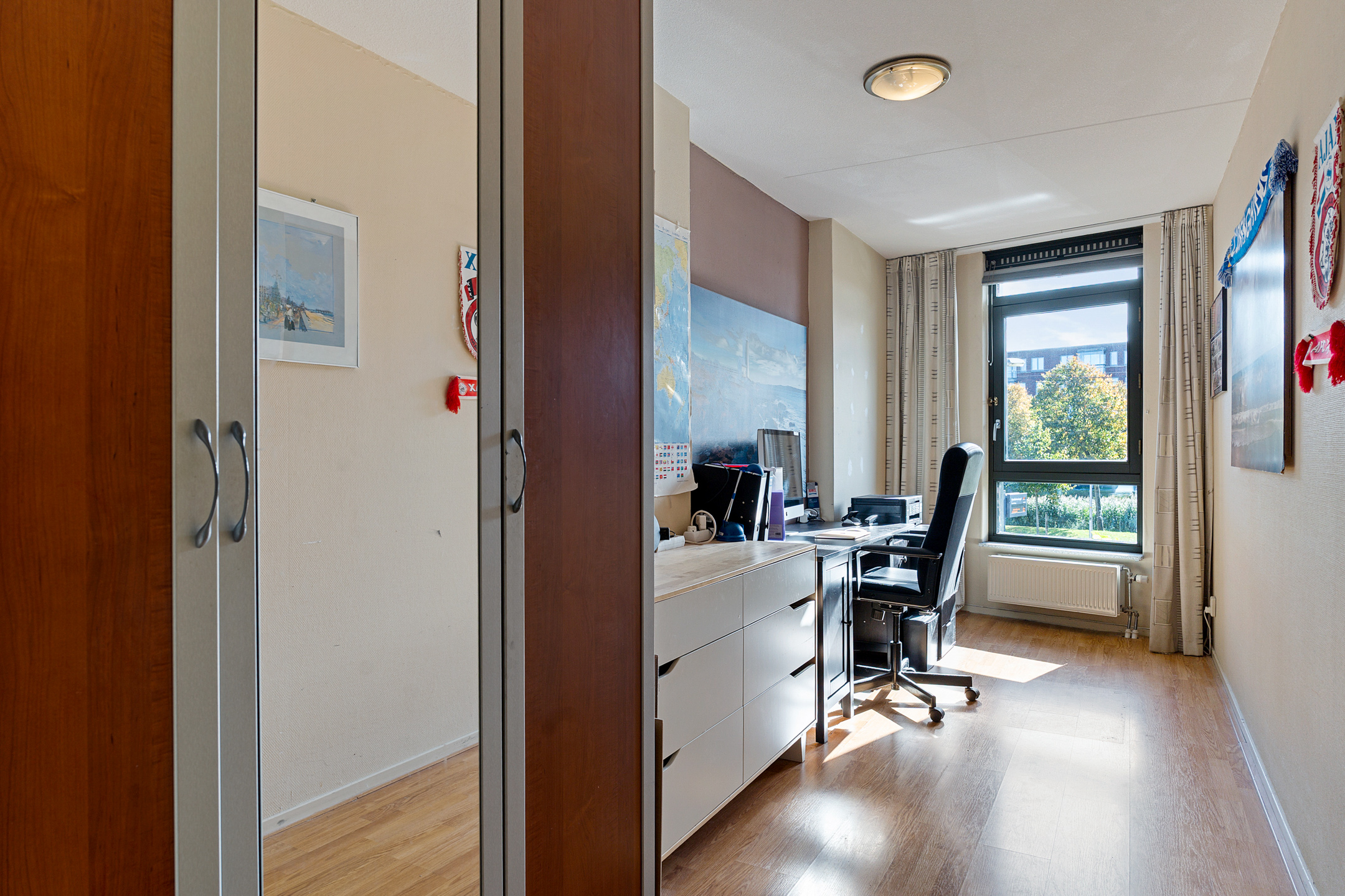 Aan de achterzijde bevinden zich twee ruime slaapkamers. De grootste slaapkamer is ideaal als hoofdslaapkamer, terwijl de tweede kamer uitstekend dienst kan doen als logeer-, hobby- of werkkamer. De badkamer is functioneel en uitgerust met een douche, wastafel en aansluiting voor de wasmachine.