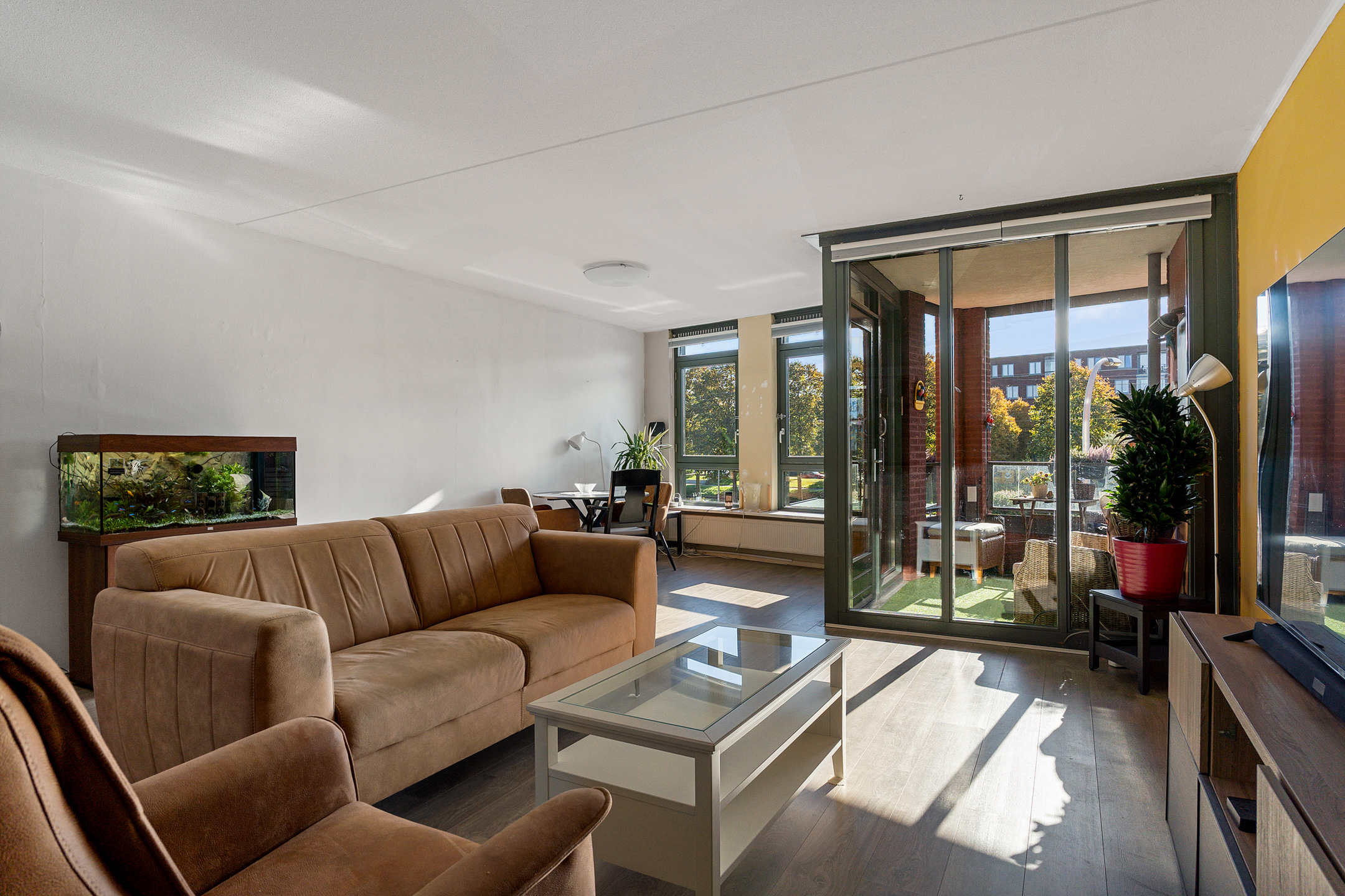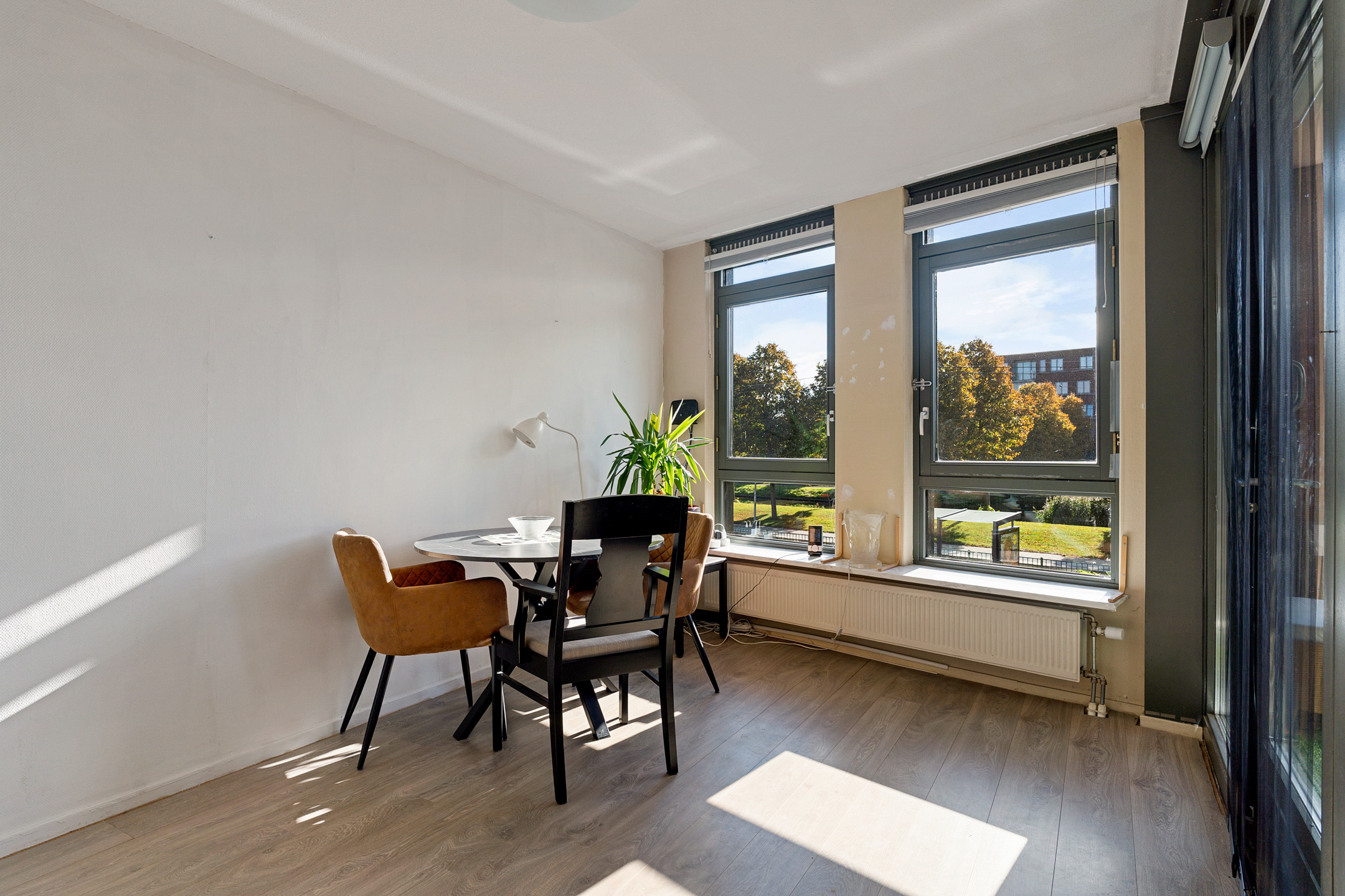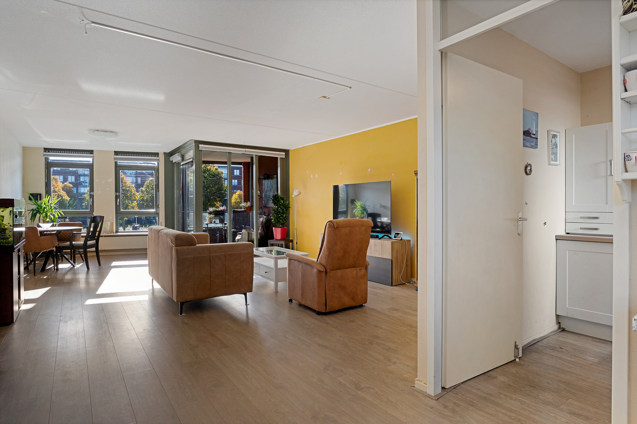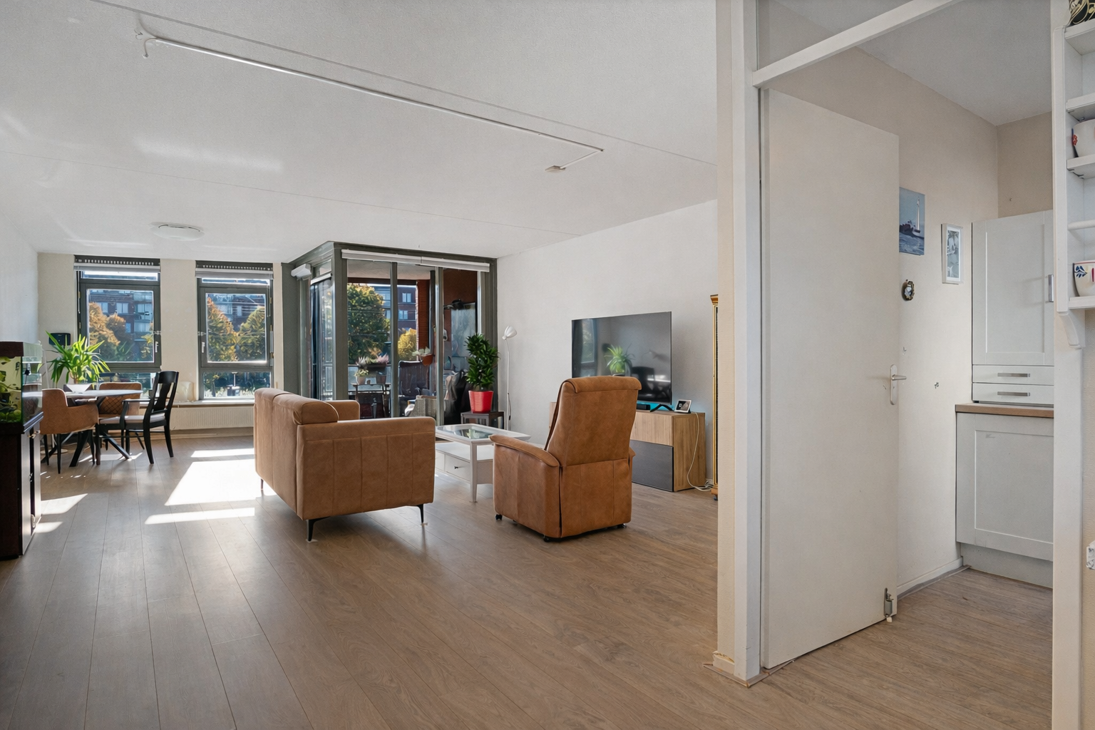 Vanuit de centrale hal van het appartement bereik je alle vertrekken. De woonkamer is ruim opgezet en heeft grote raampartijen die zorgen voor een prettige lichtinval. Vanuit hier stap je direct het balkon op, gelegen op het zuidwesten – perfect om in de middag- en avondzon te ontspannen.