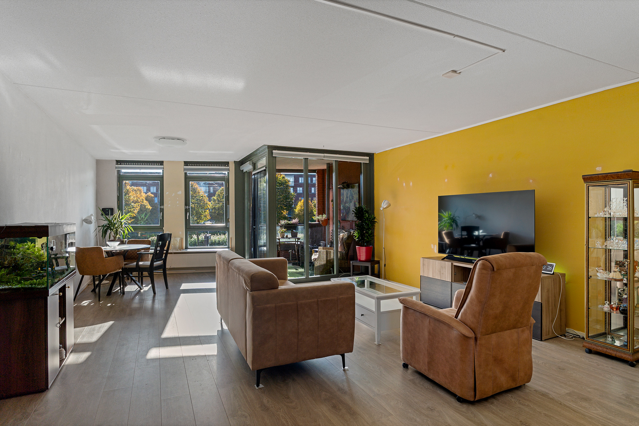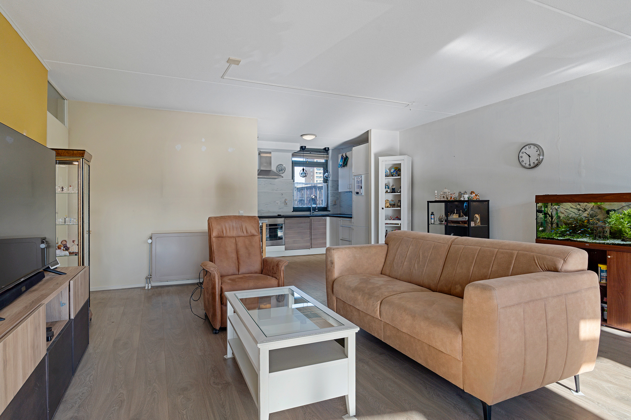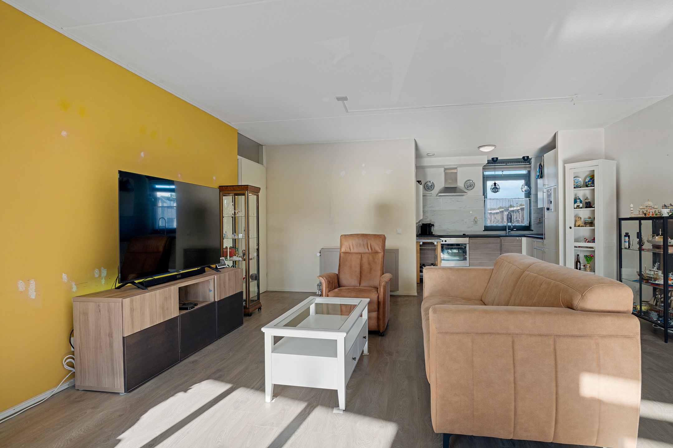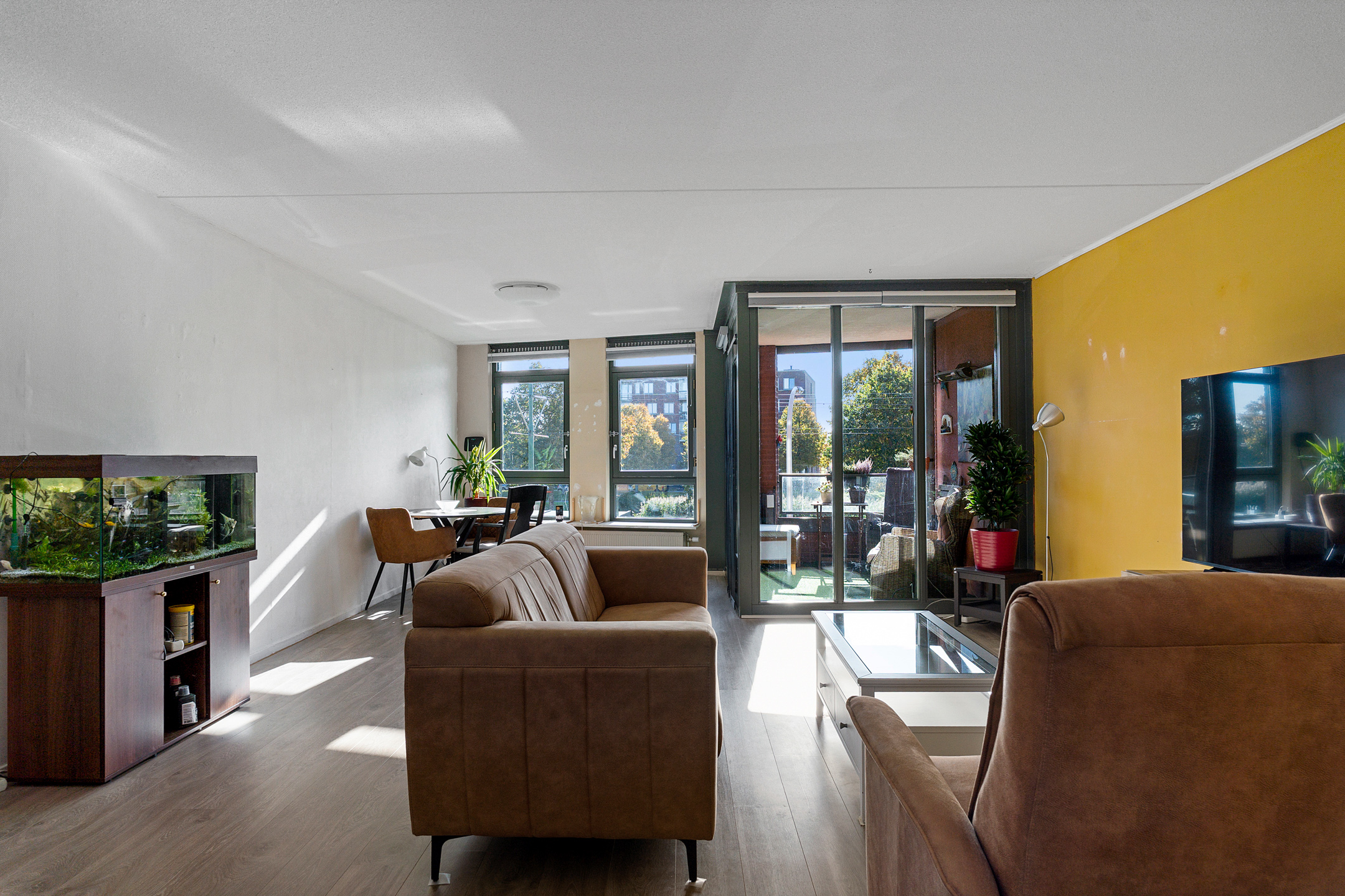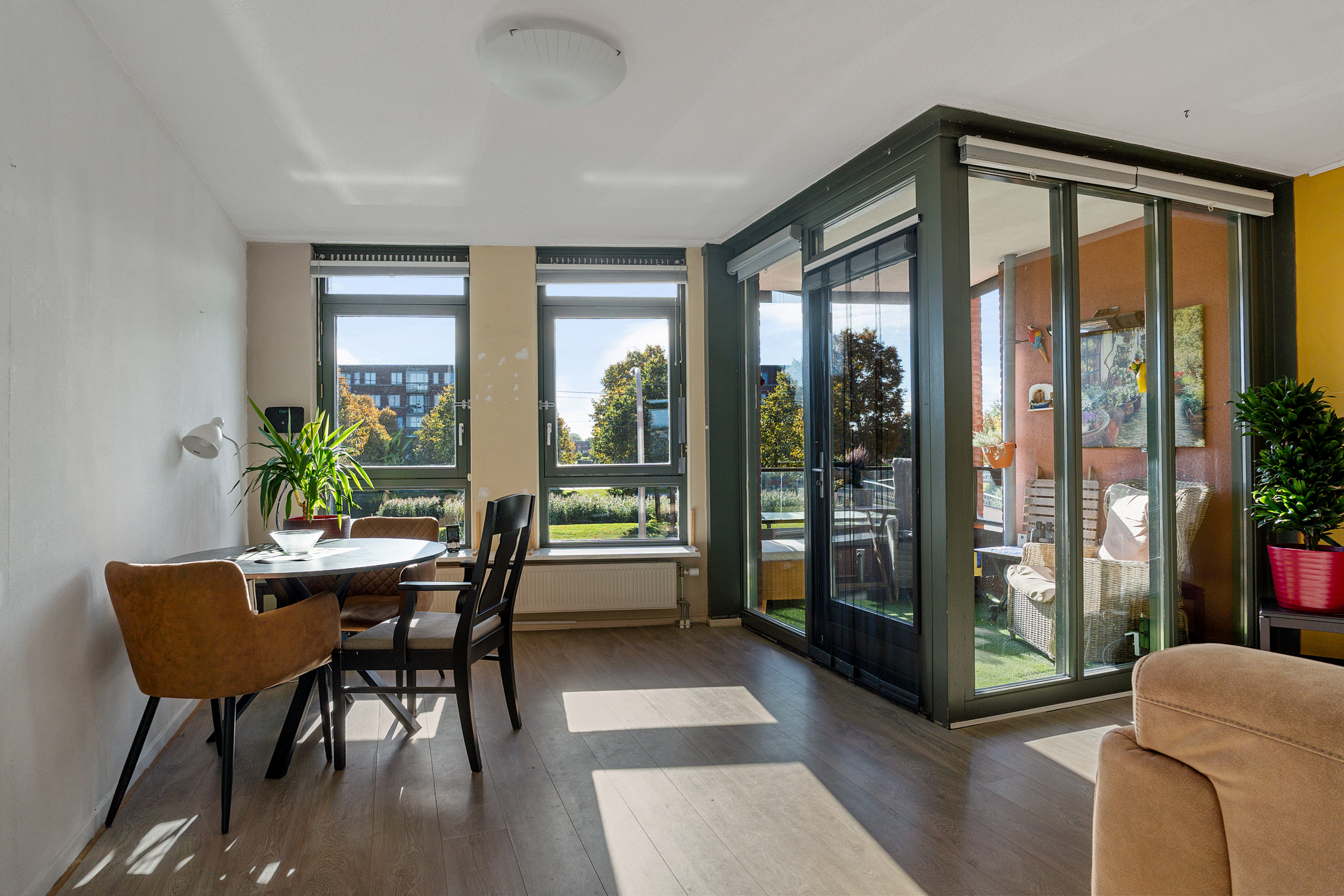 Vanuit de centrale hal van het appartement bereik je alle vertrekken. De woonkamer is ruim opgezet en heeft grote raampartijen die zorgen voor een prettige lichtinval. Vanuit hier stap je direct het balkon op, gelegen op het zuidwesten – perfect om in de middag- en avondzon te ontspannen.