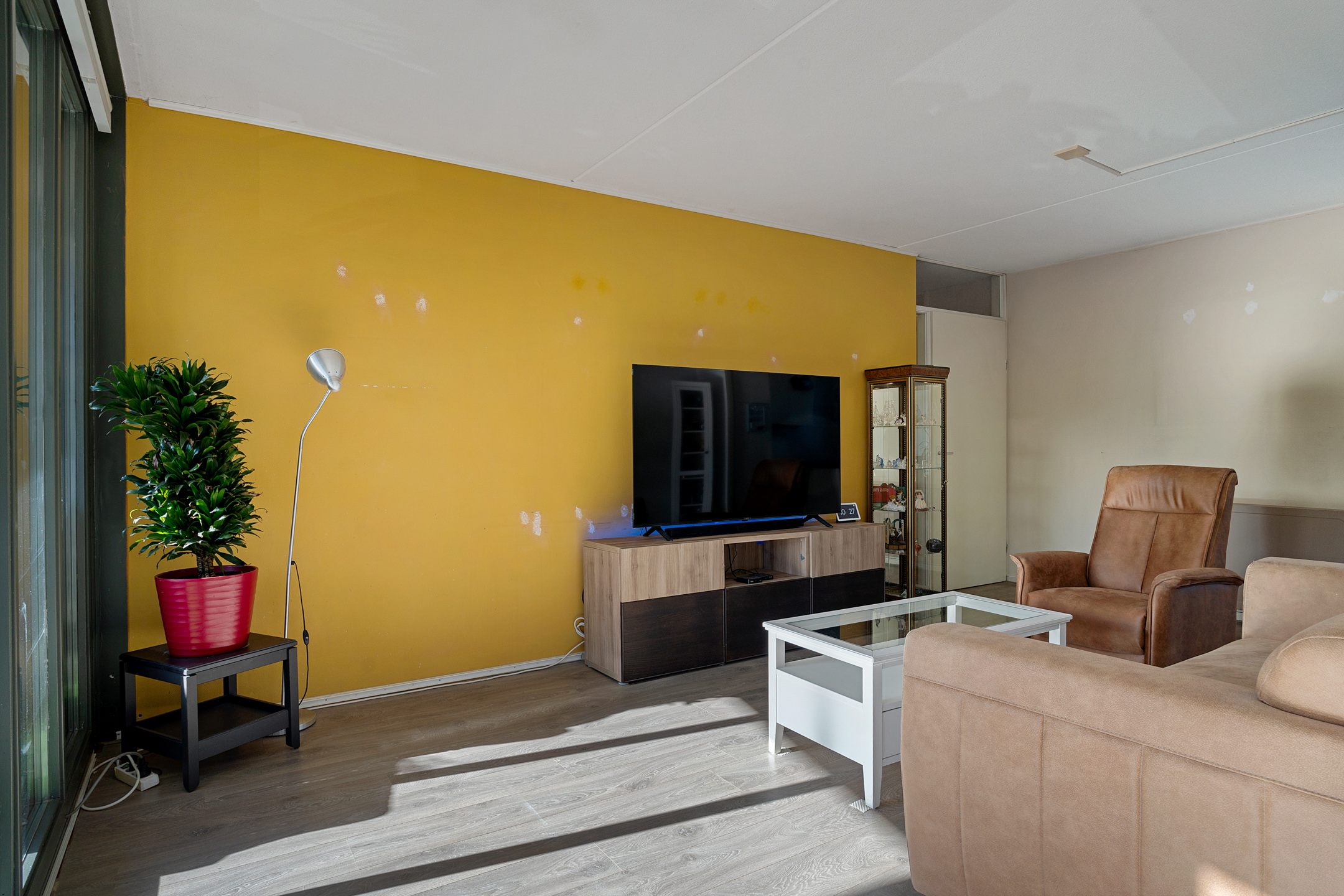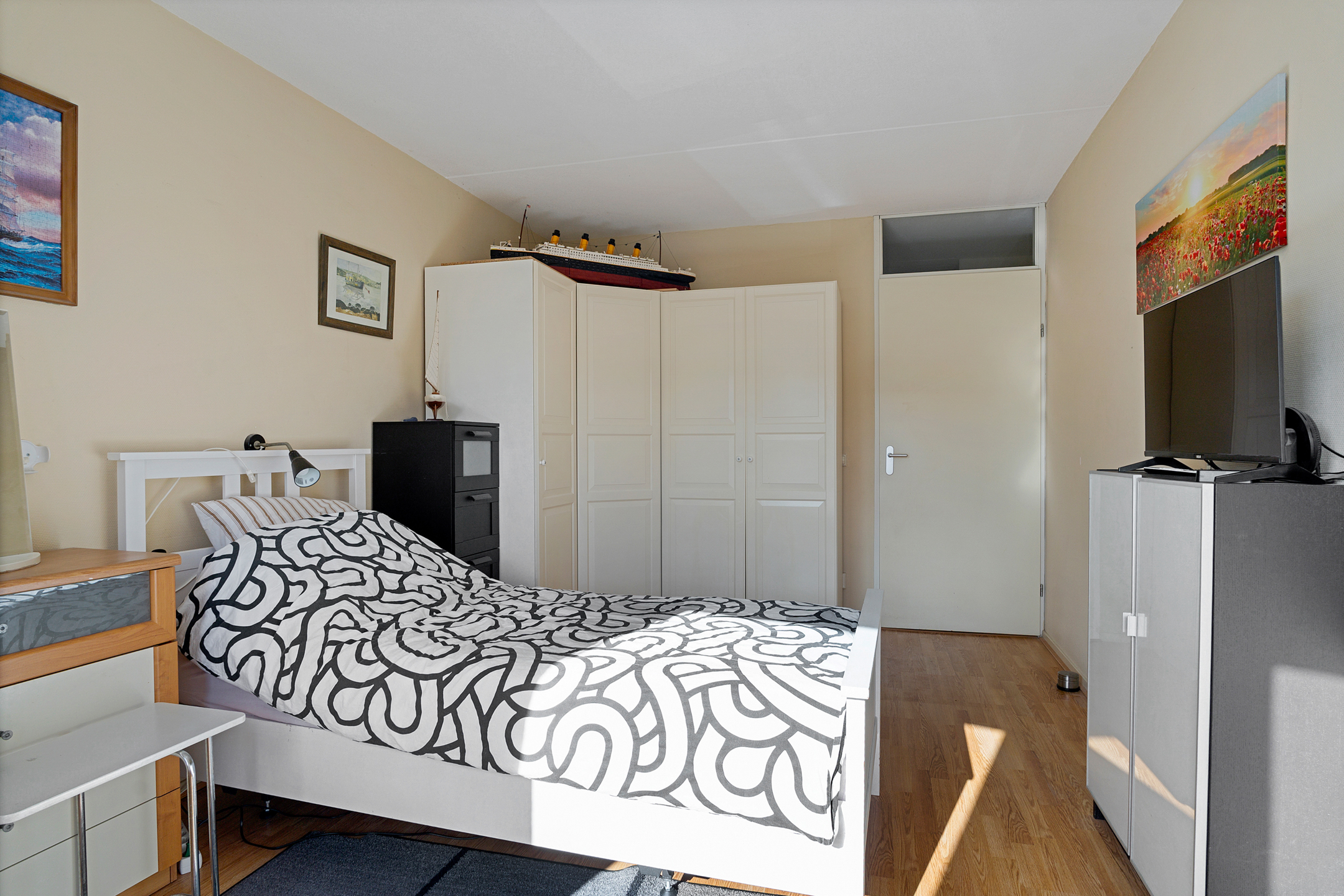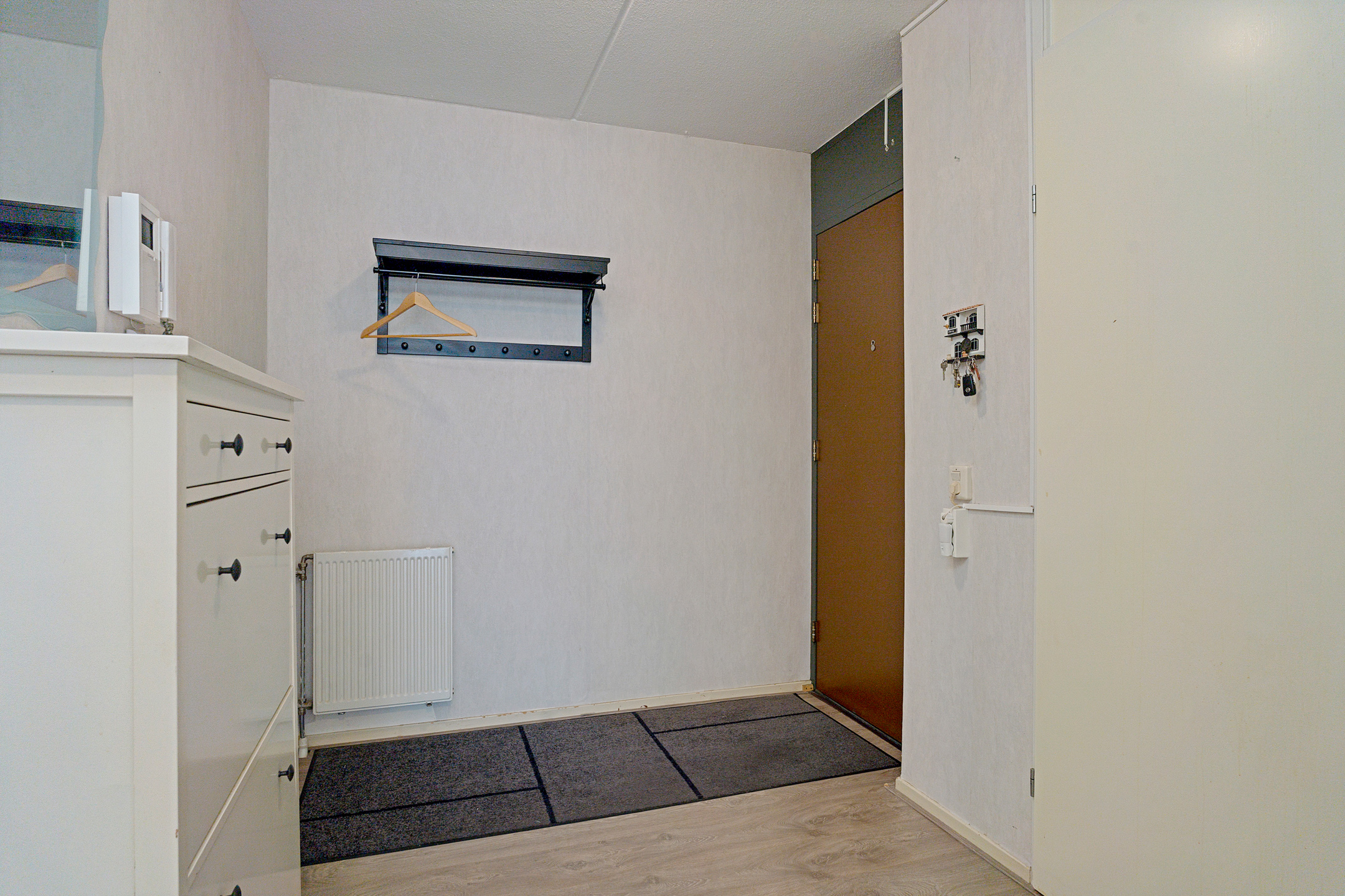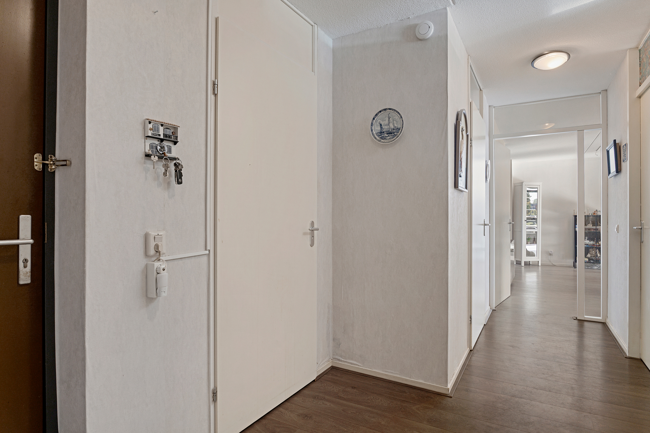 Vanuit de centrale hal van het appartement bereik je alle vertrekken. De woonkamer is ruim opgezet en heeft grote raampartijen die zorgen voor een prettige lichtinval. Vanuit hier stap je direct het balkon op, gelegen op het zuidwesten – perfect om in de middag- en avondzon te ontspannen.