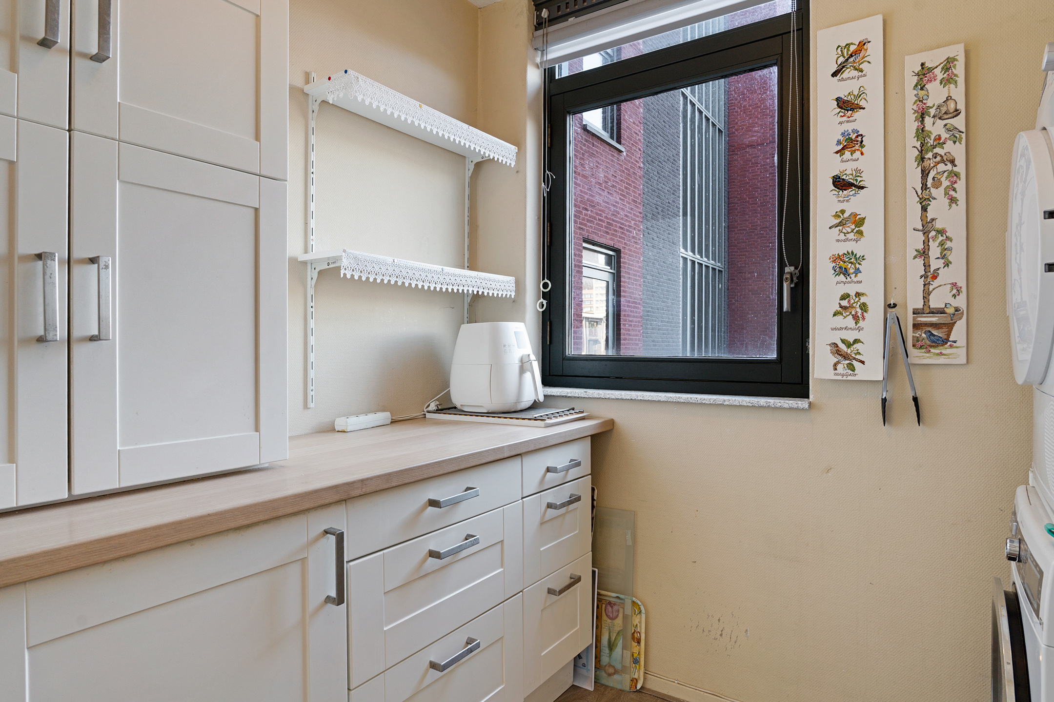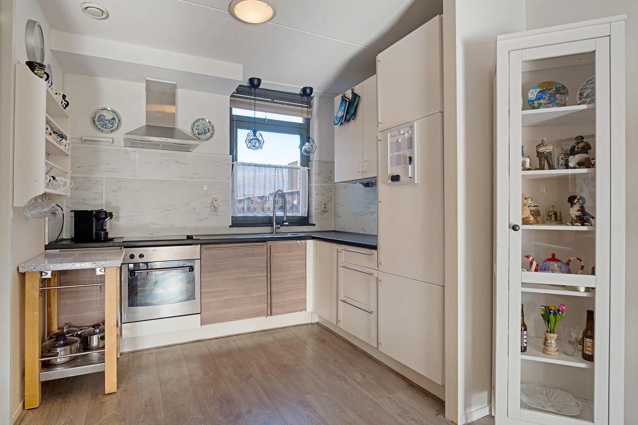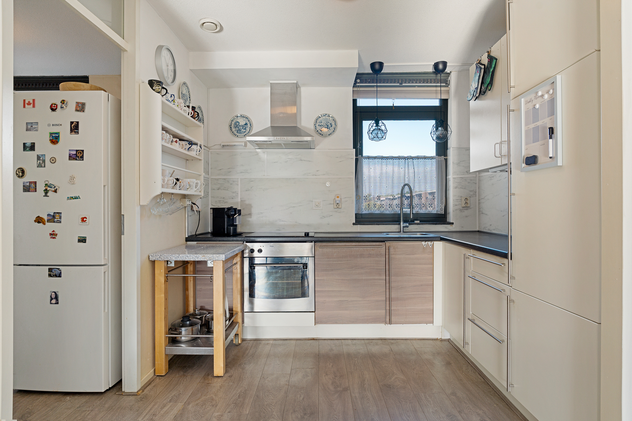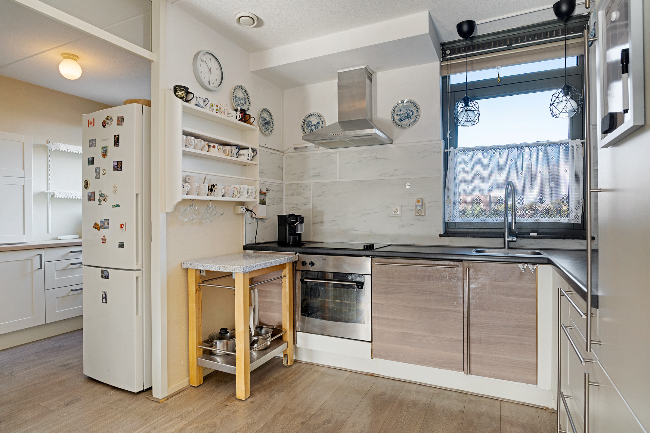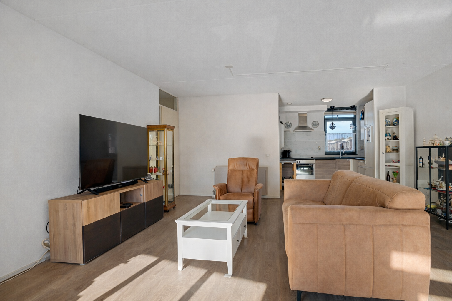 De halfopen keuken grenst aan de woonkamer en is praktisch ingericht met voldoende werk- en opbergruimte, geschikt voor al je apparatuur en keukengerei.