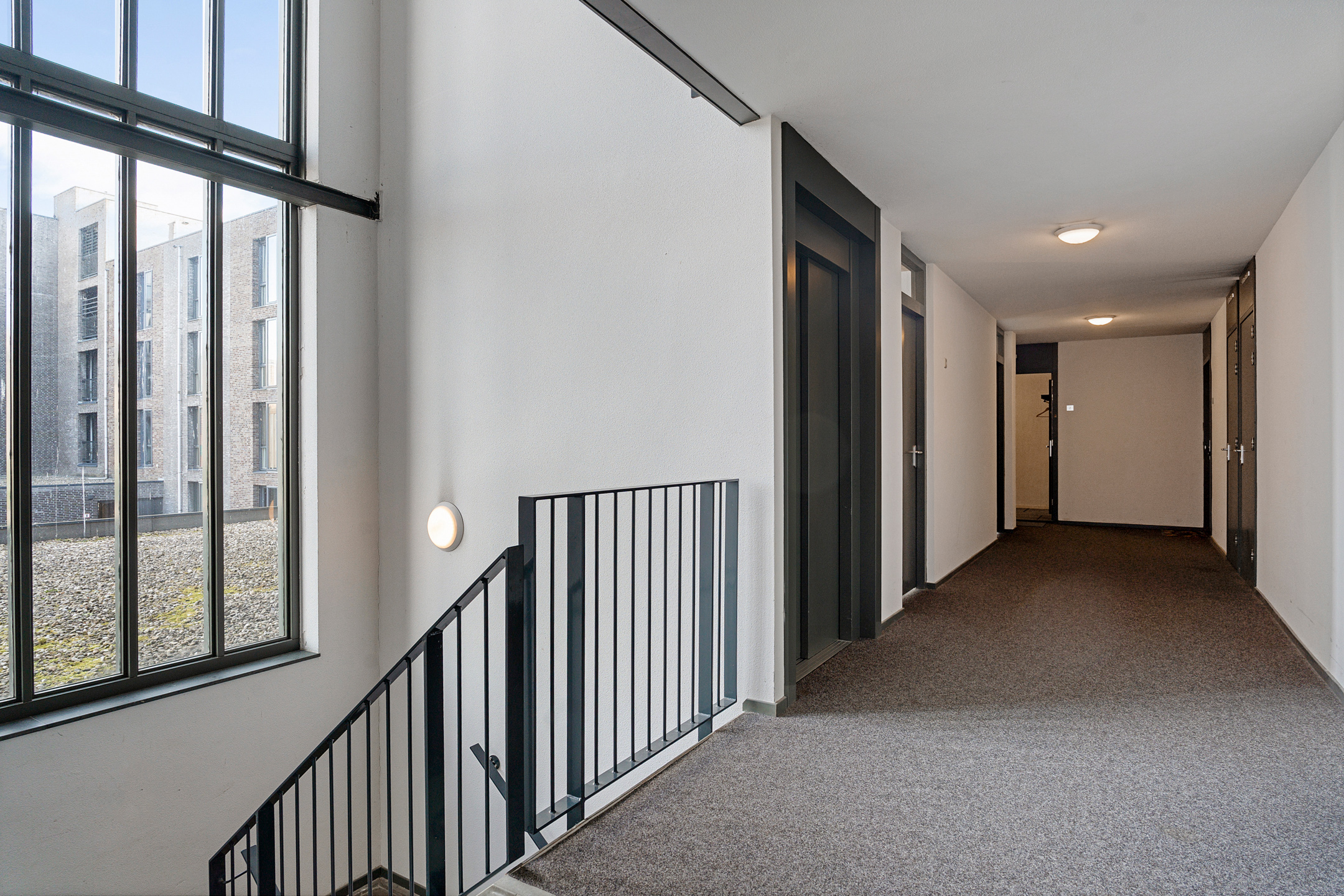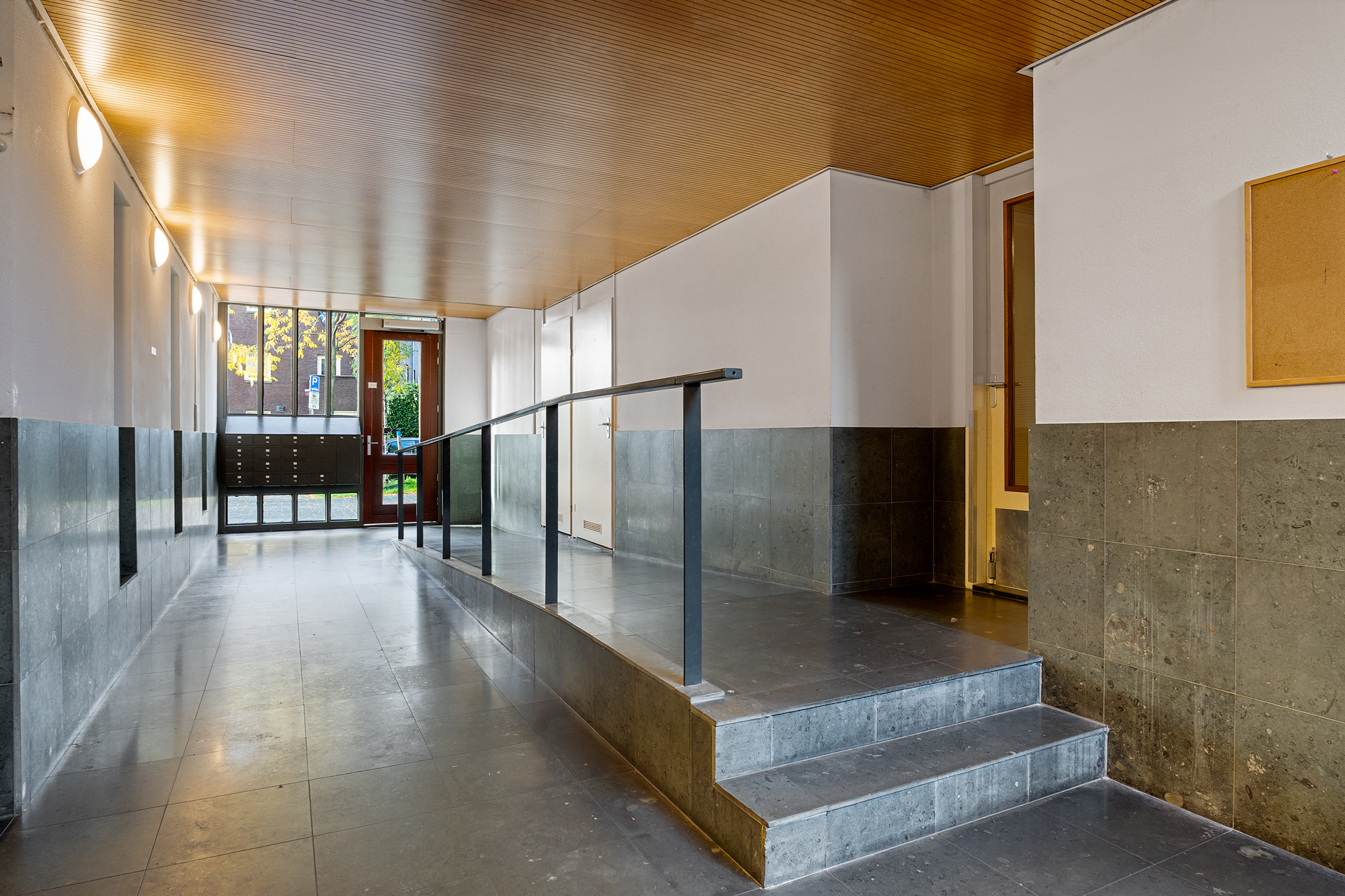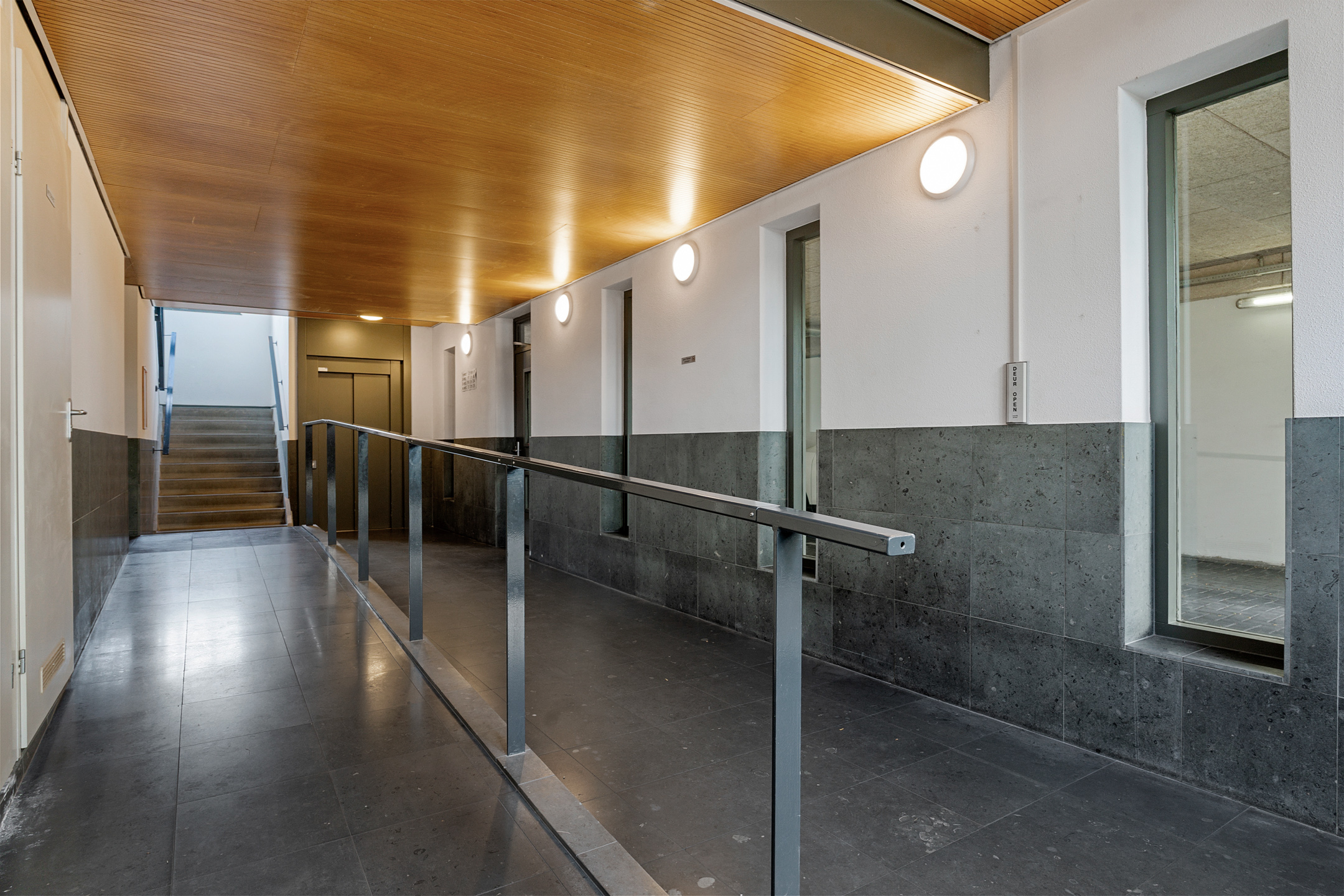 De entree van het gebouw is verzorgd en goed onderhouden. Via de automatische deur kom je in de centrale hal met brievenbussen, bellentableau, lift en trapopgang. Alles is rolstoelvriendelijk en uitstekend toegankelijk.
