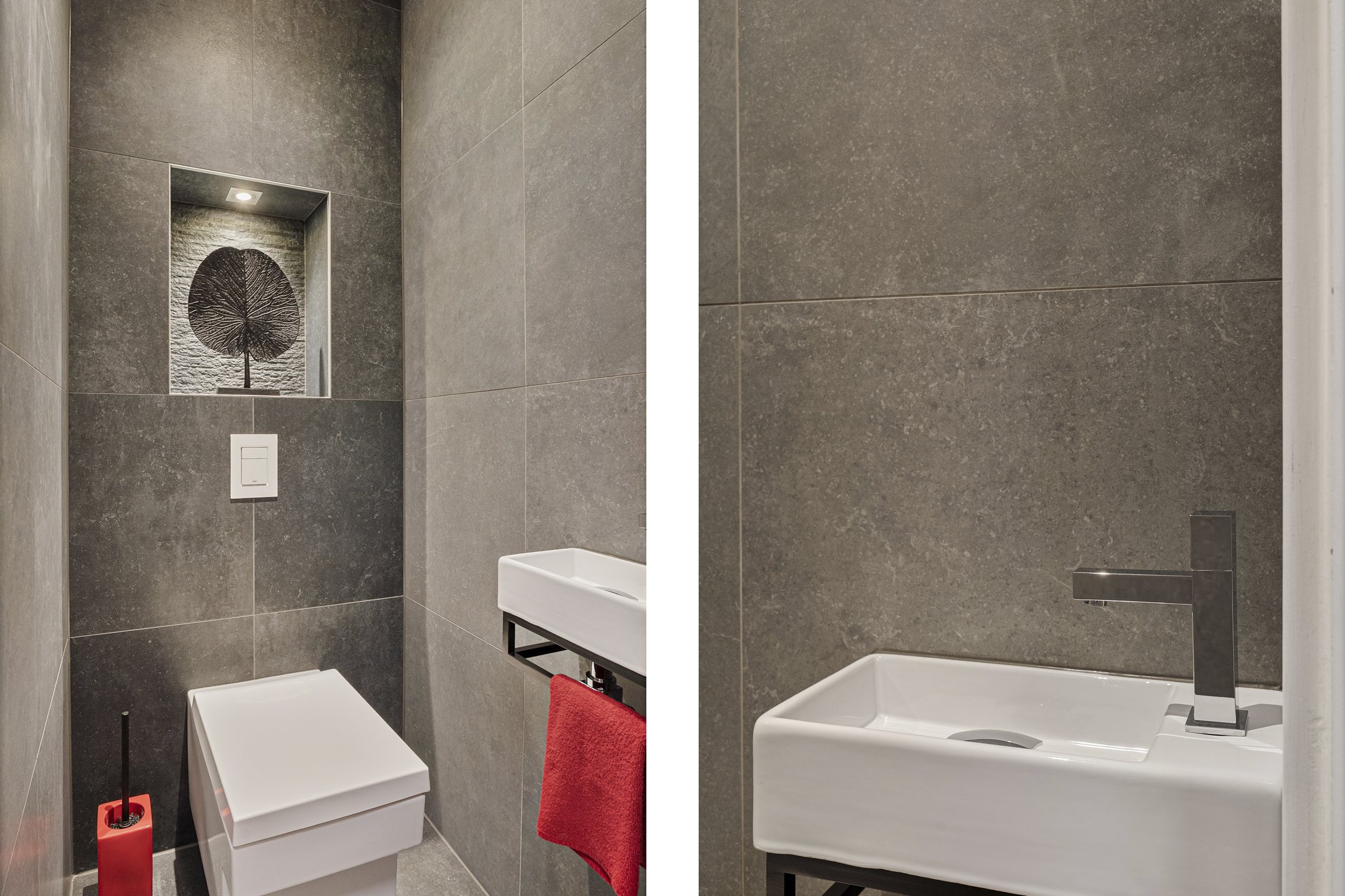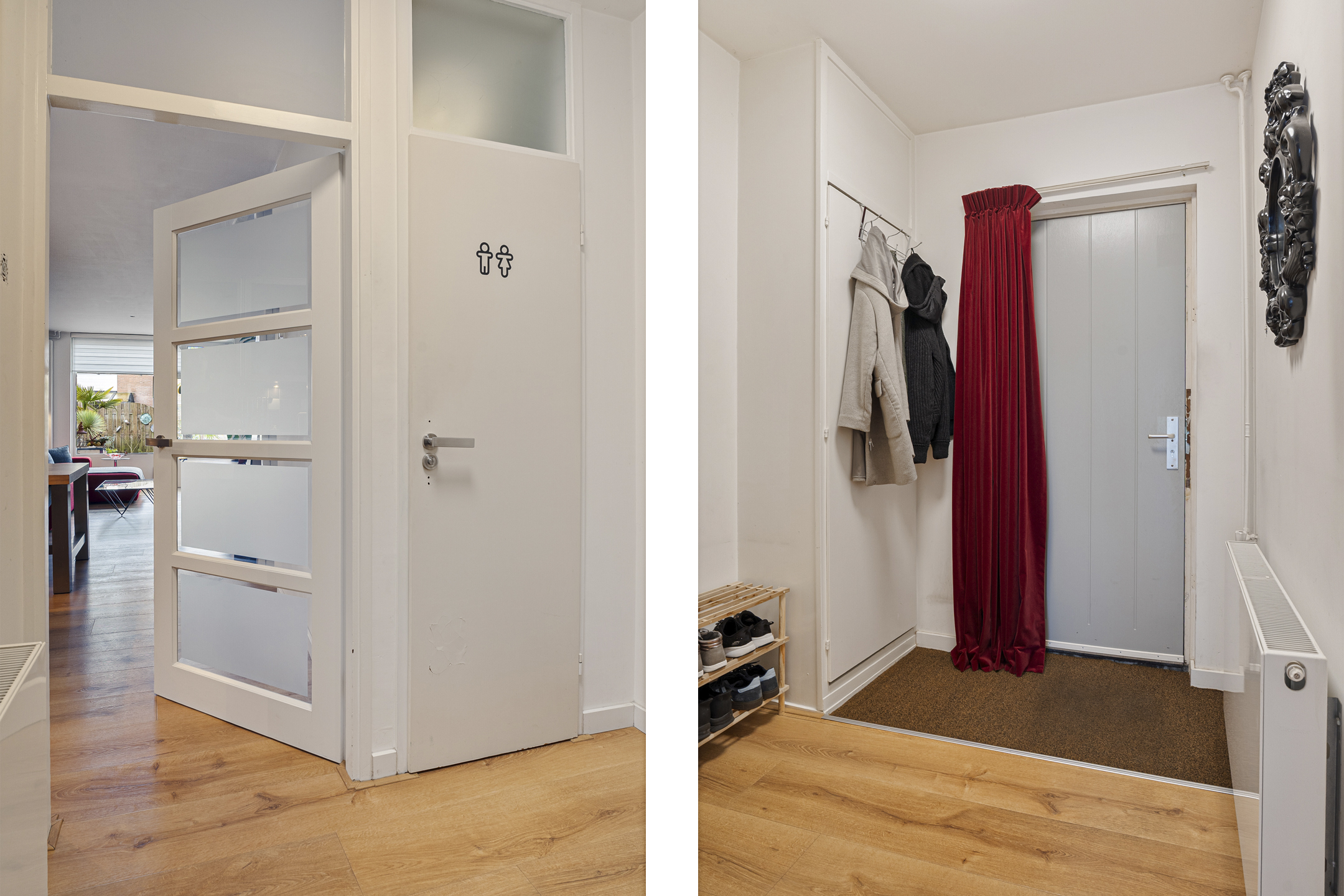 Bij aankomst word je al welkom geheten door de verzorgde voortuin met sierbestrating. De overdekte entree leidt naar een ruime hal met de meterkast en een stijlvolle toiletruimte (2023), voorzien van luxe hangend toilet, fonteintje en betegelde nis met verlichting.