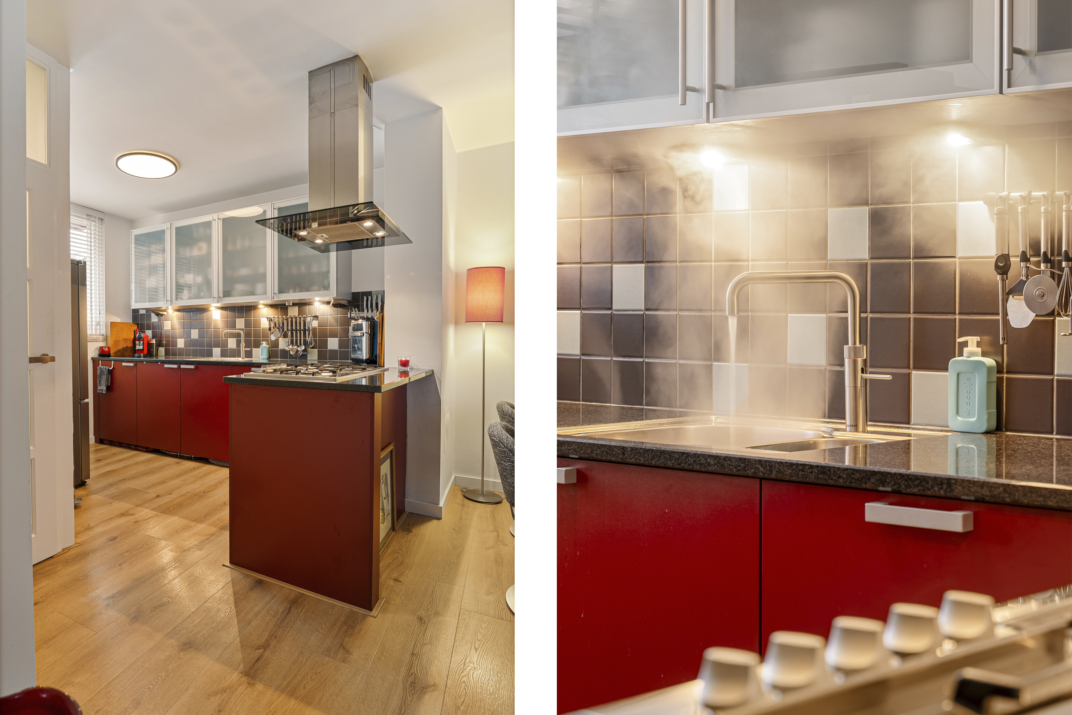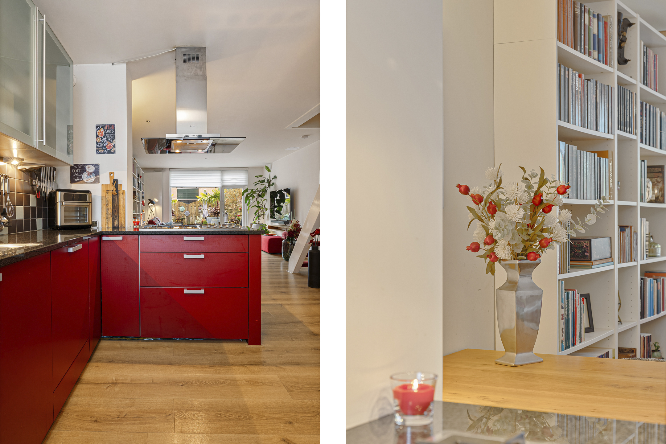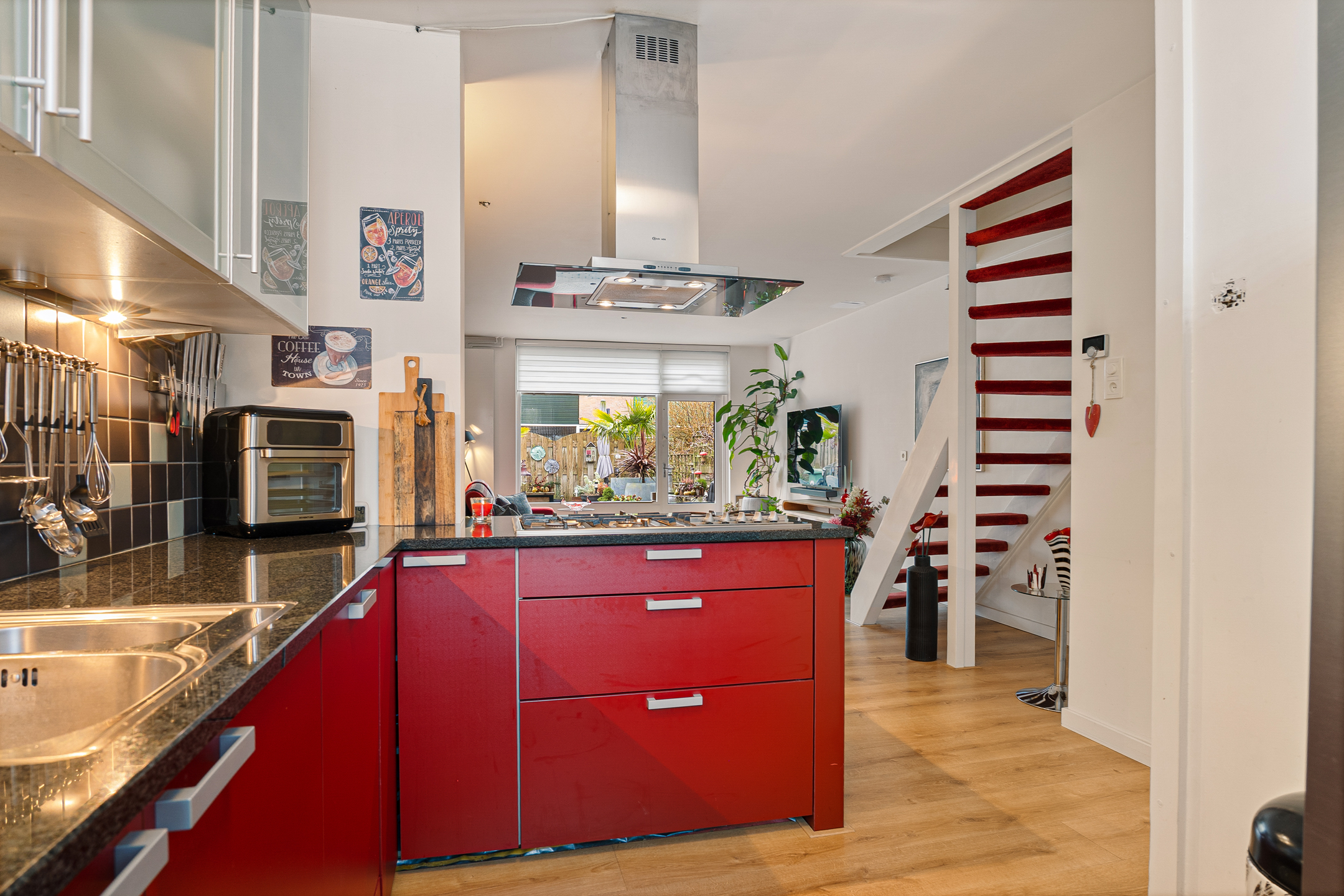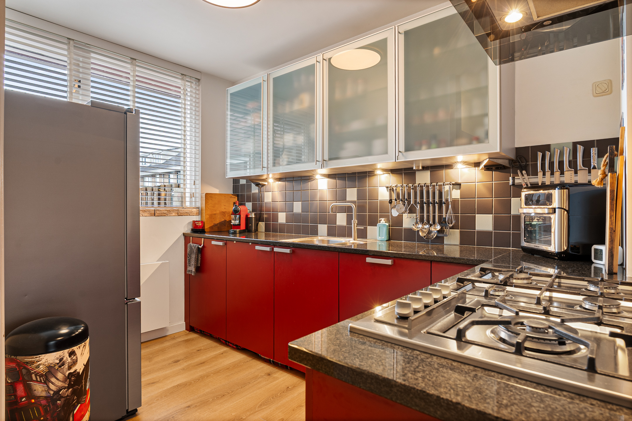 Aan de voorzijde treft men de open keuken aan, welke is ingericht met een moderne L-opstelling voorzien van een granieten aanrechtblad en de volgende inbouwapparatuur: 5-pits gaskookplaat, RVS afzuigkap, Quooker (2023) en een vrijwel nieuwe vaatwasser (2024).