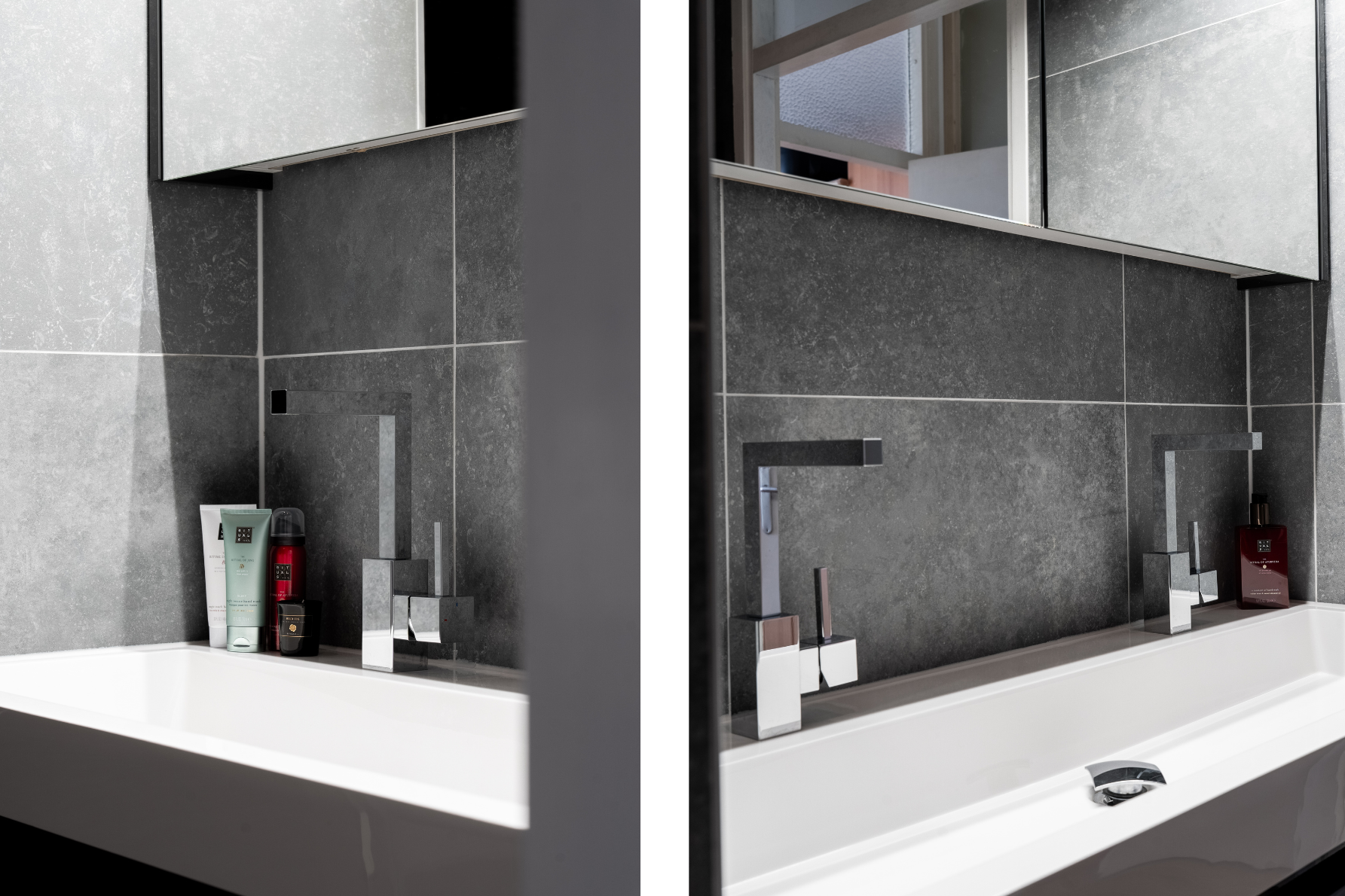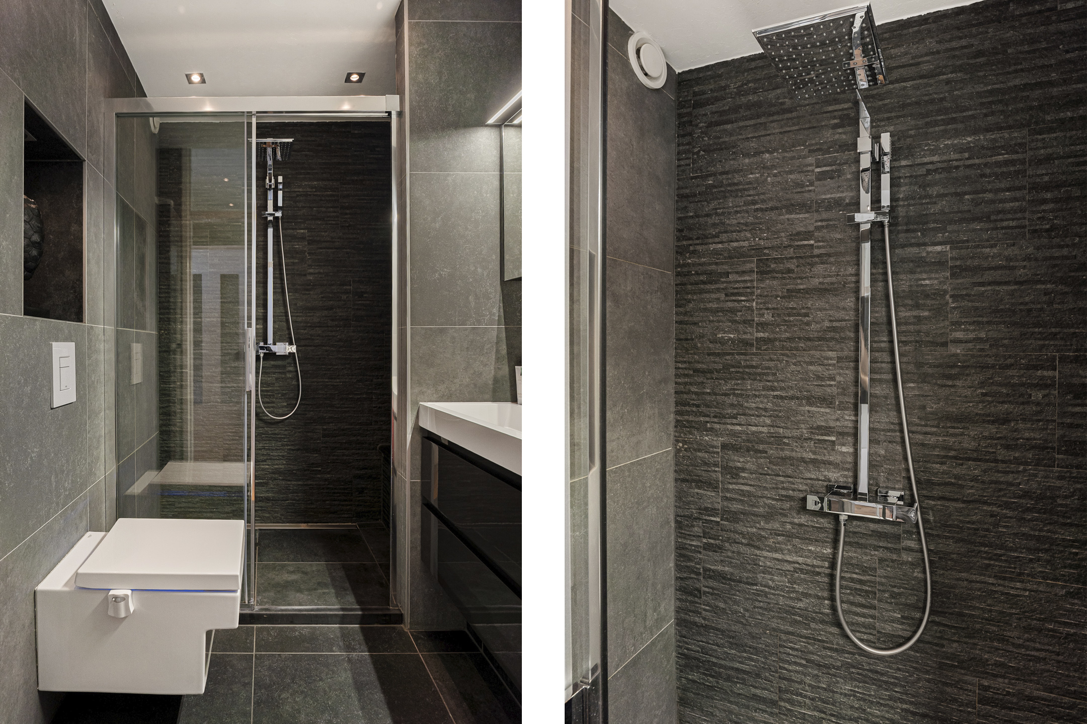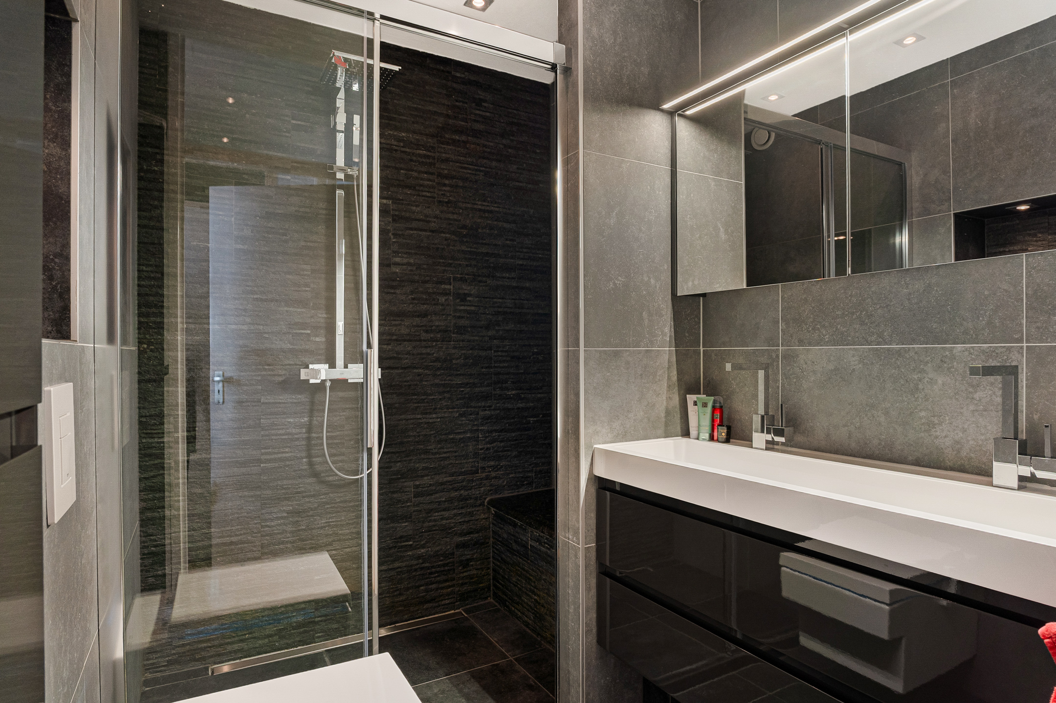 De inpandige smaakvolle badkamer (2022) is ingericht met een ruime inloopdouche en Belgisch hardstenen zitbank, een 2e hangend toilet, betegelde nis, prachtige polystone wastafel met 2 mengkranen, luxe hoogglans badkamermeubels, en vloerverwarming.
