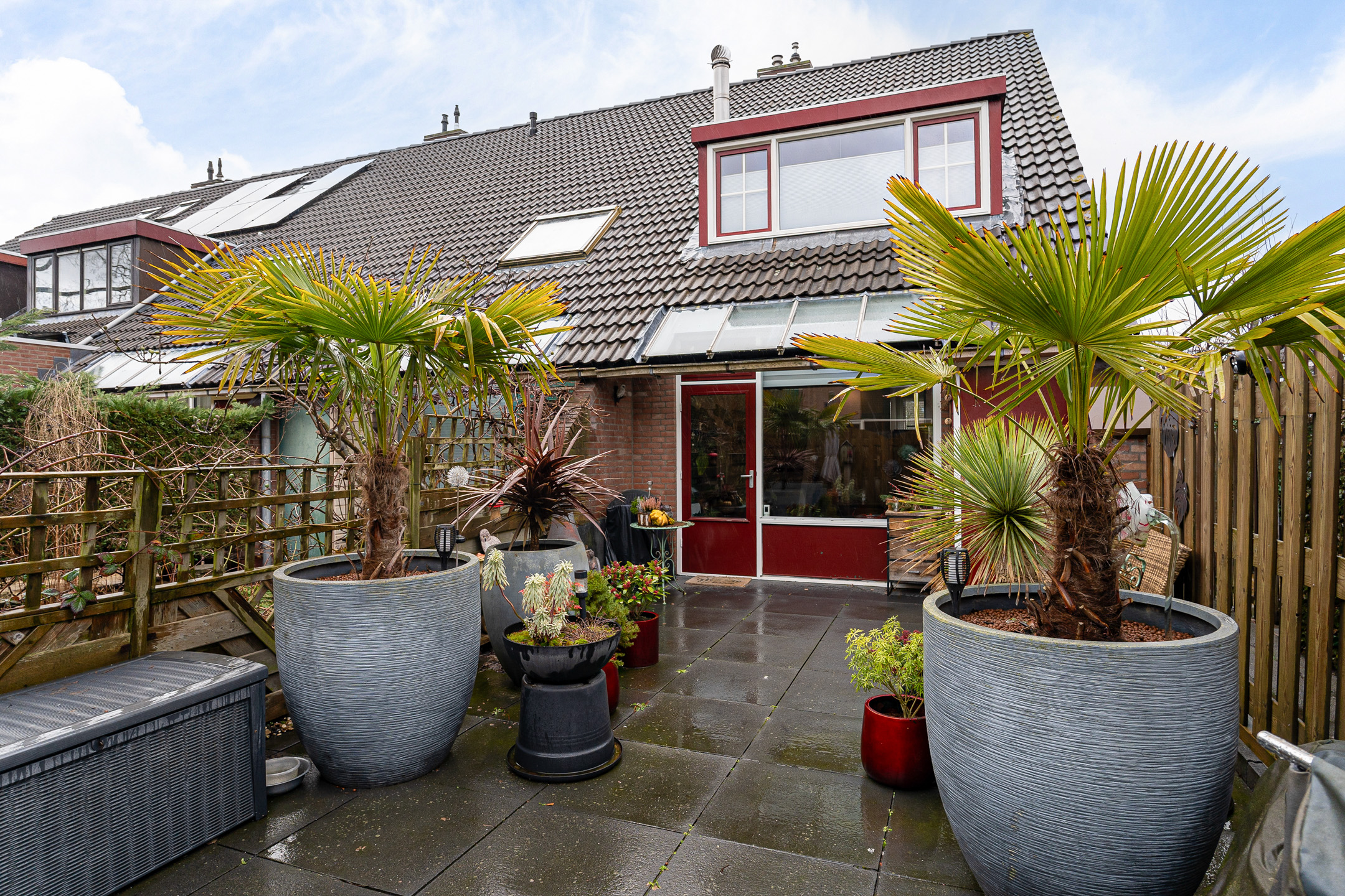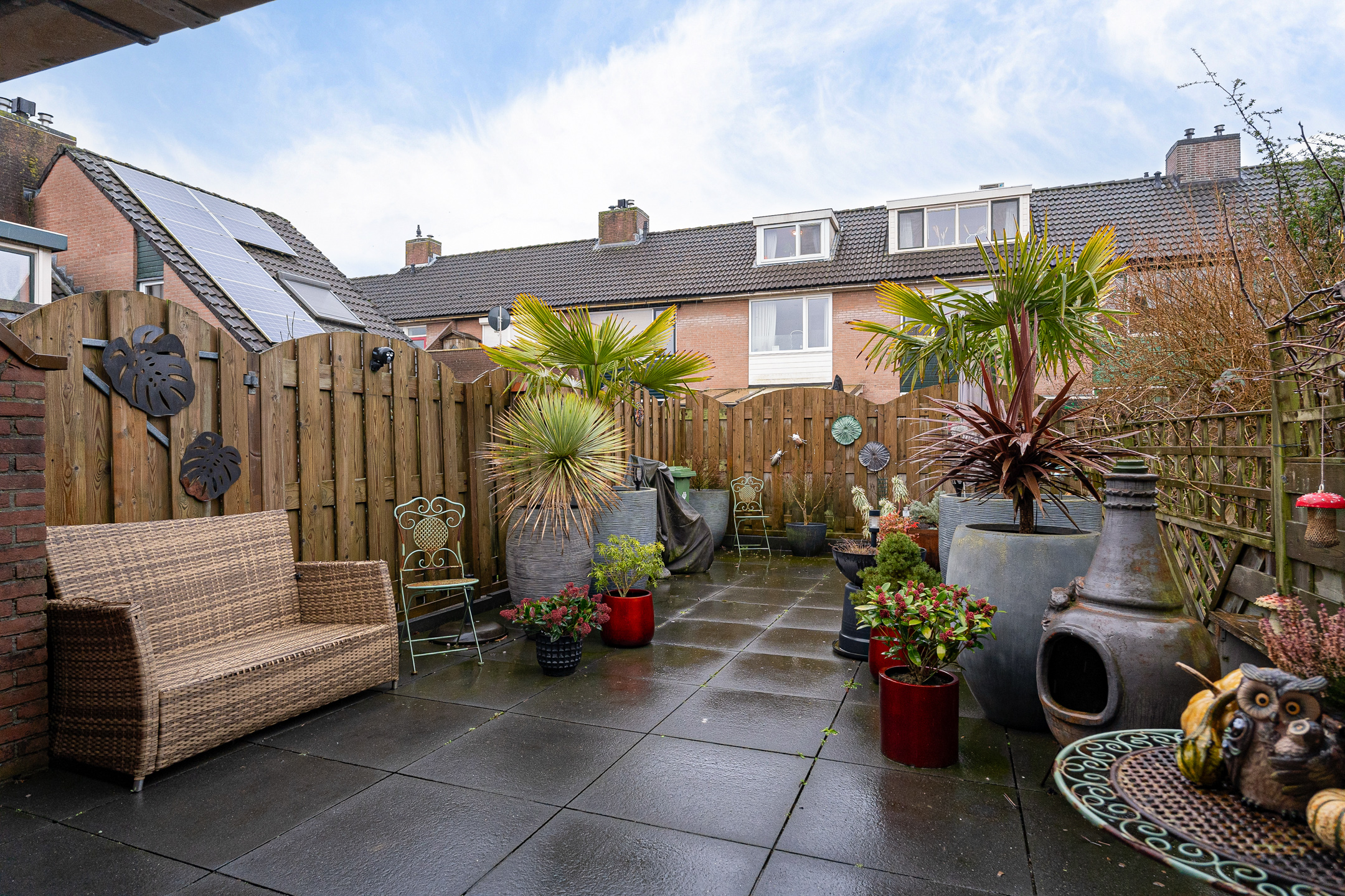 De zonnige en sfeervolle achtertuin op het zuidwesten is toegankelijk vanuit de woonkamer en is keurig aangelegd met sierbestrating en voorzien van diverse mooie plantenbakken. Een perfecte plek om te genieten van je rust. Met de handige tuinkast en directe toegang tot het naastgelegen pad, is alles tot in de puntjes geregeld.