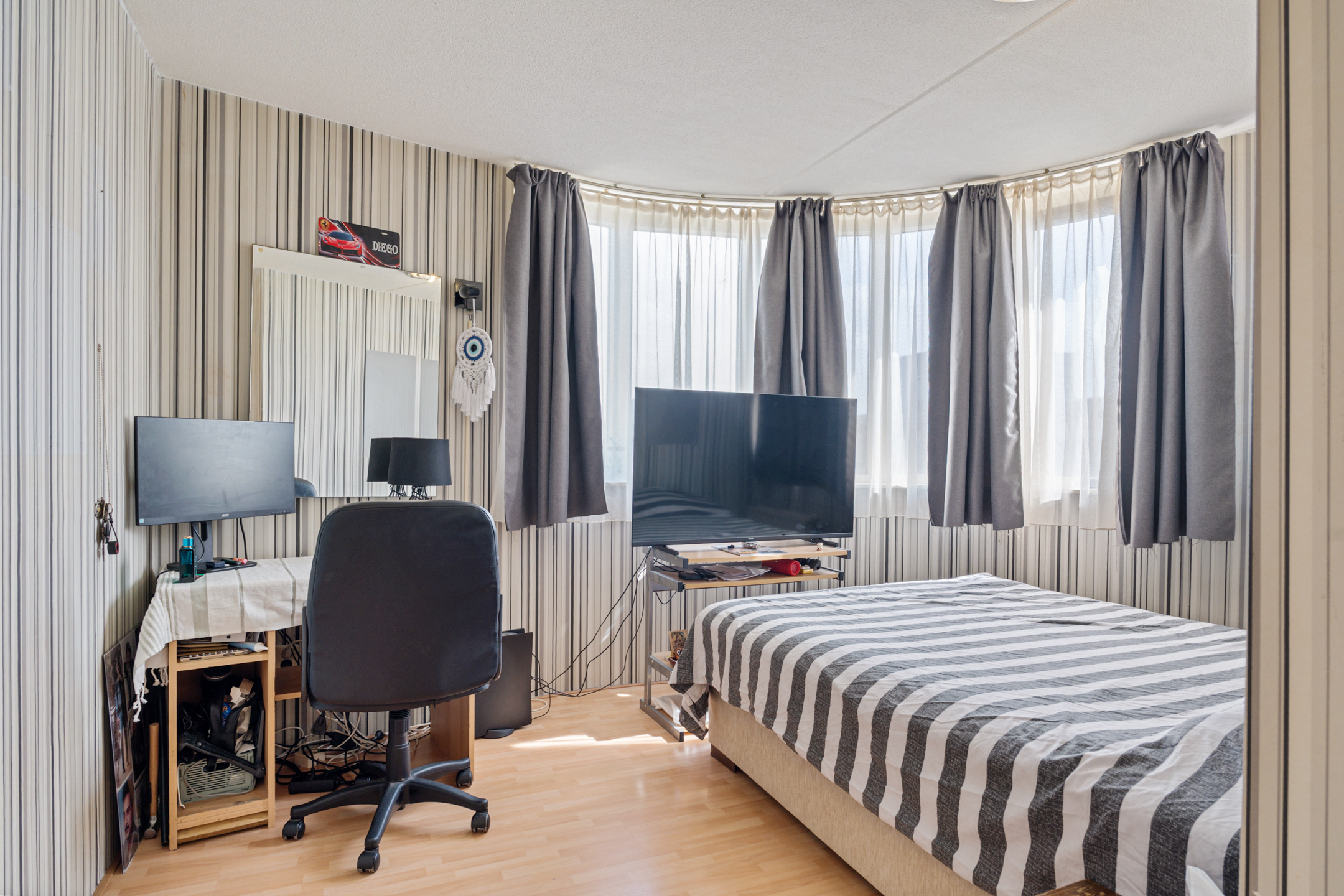 Je komt binnen in een ruime hal die toegang geeft tot de eerste slaapkamer, gelegen aan de voorzijde en voorzien van grote raampartijen die voor veel daglicht zorgen. Aan de achterzijde van deze verdieping vind je een ruime berging met een praktische douchecabine en aansluitingen voor wasmachine en droger.