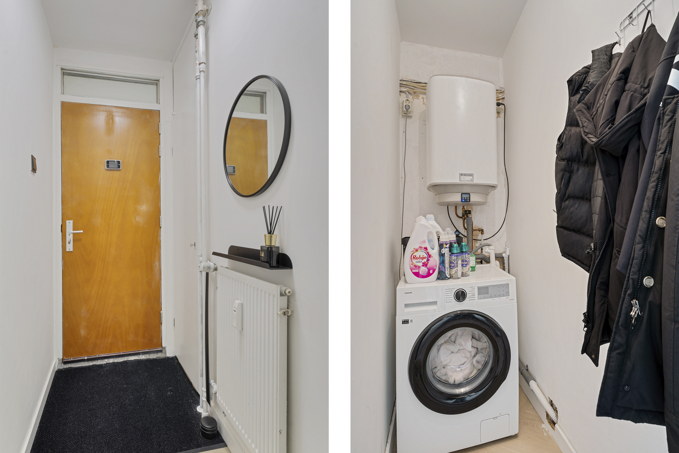 Via de entree kom je in de ruime hal met een strakke, moderne afwerking. Vanuit hier zijn alle vertrekken bereikbaar. In de hal bevinden zich het separate toilet met wandcloset en wastafel, uitgevoerd in een lichte en moderne stijl, evenals een praktische berging voor extra opslag.
