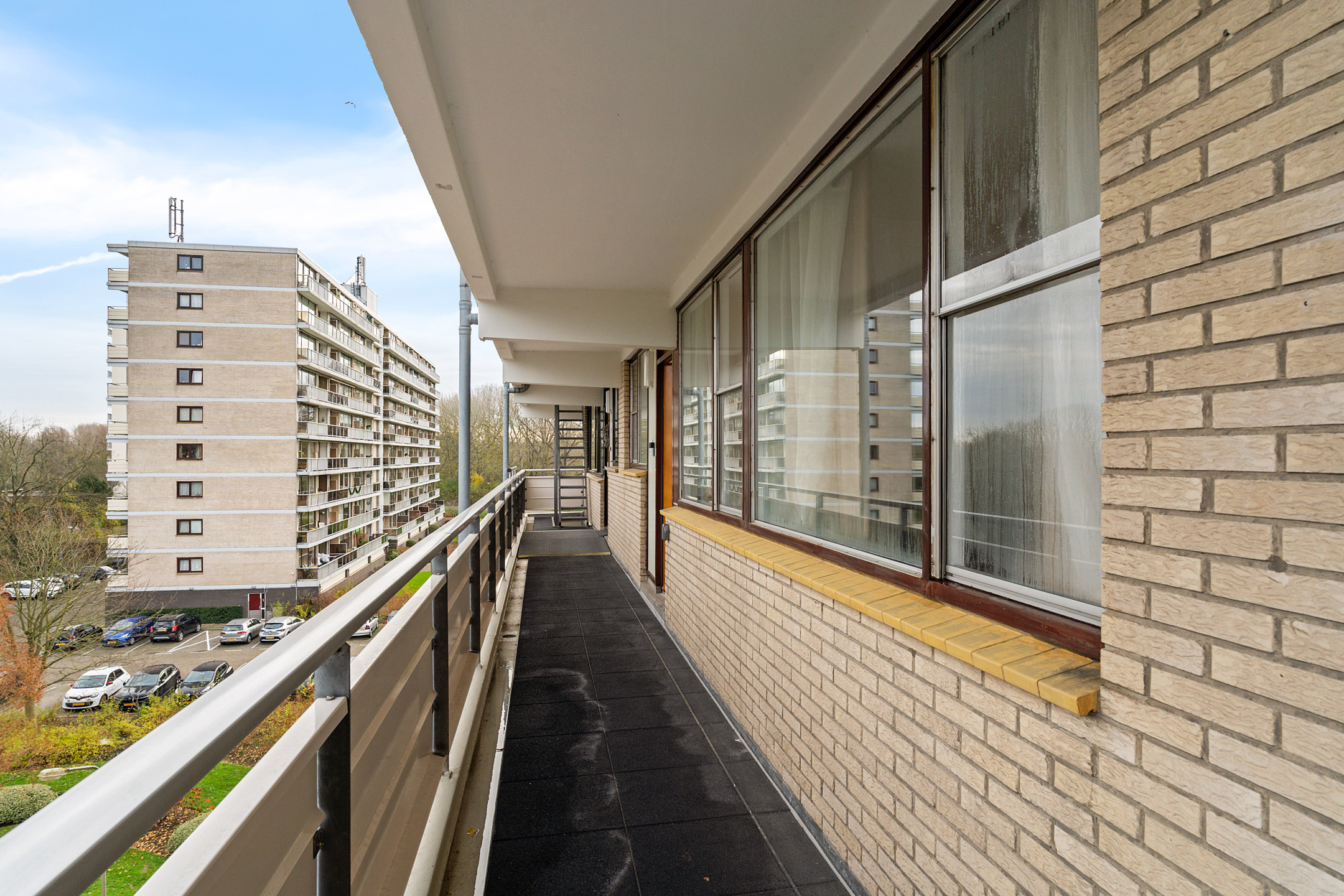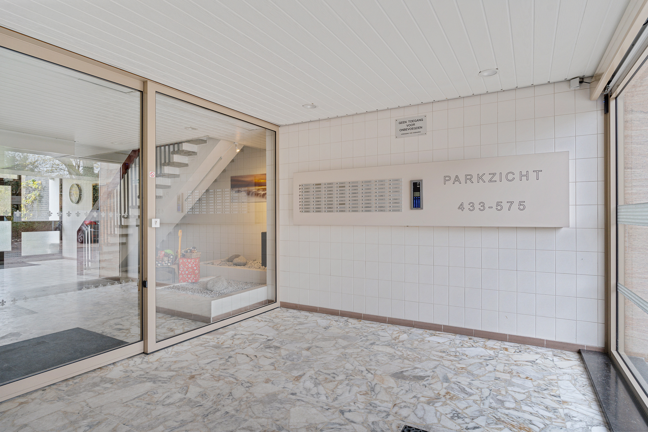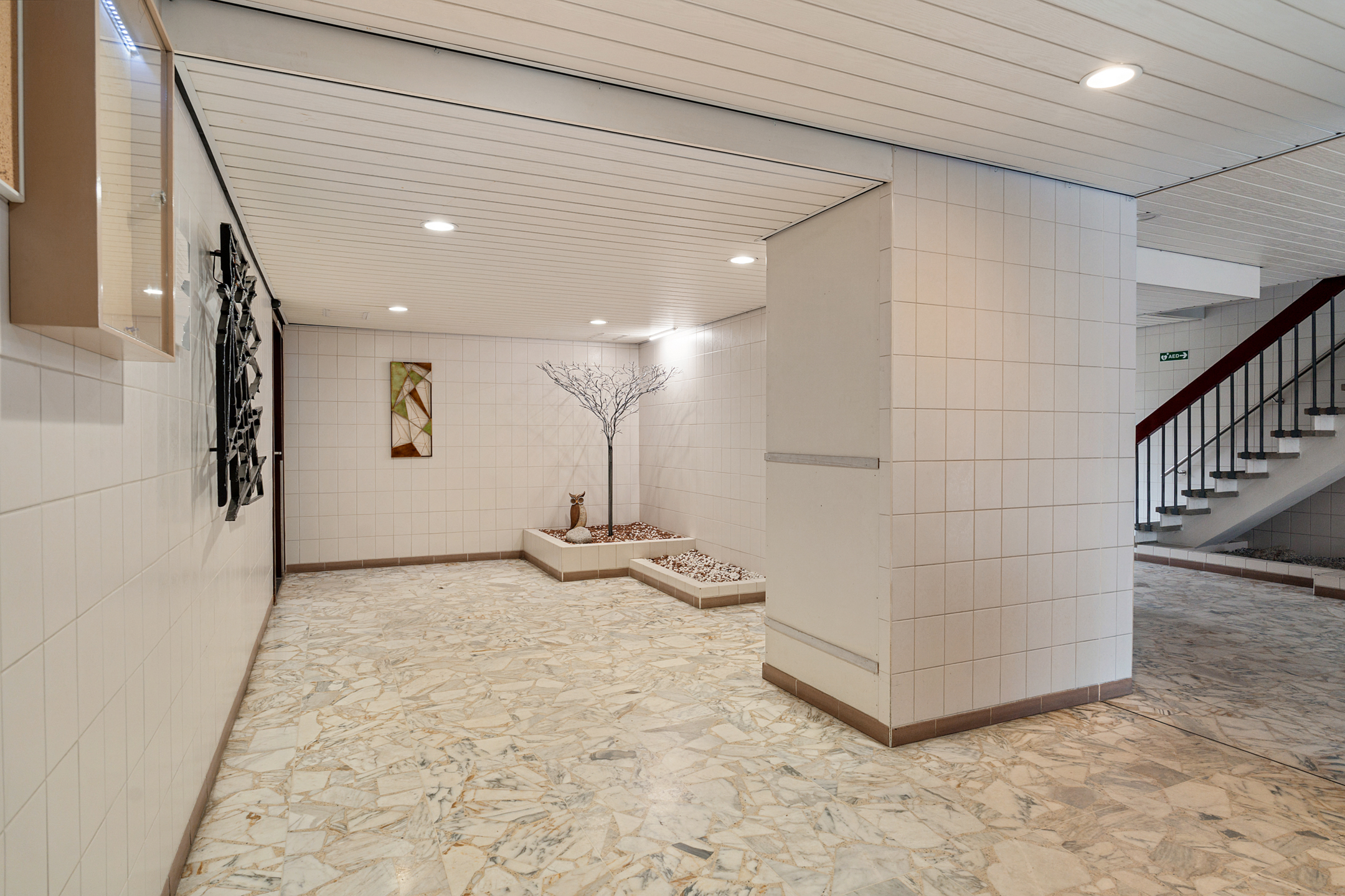 Afgesloten centrale entree met twee liften en een trappenhuis naar de galerijen, met toegang tot de berging van circa 5 m².