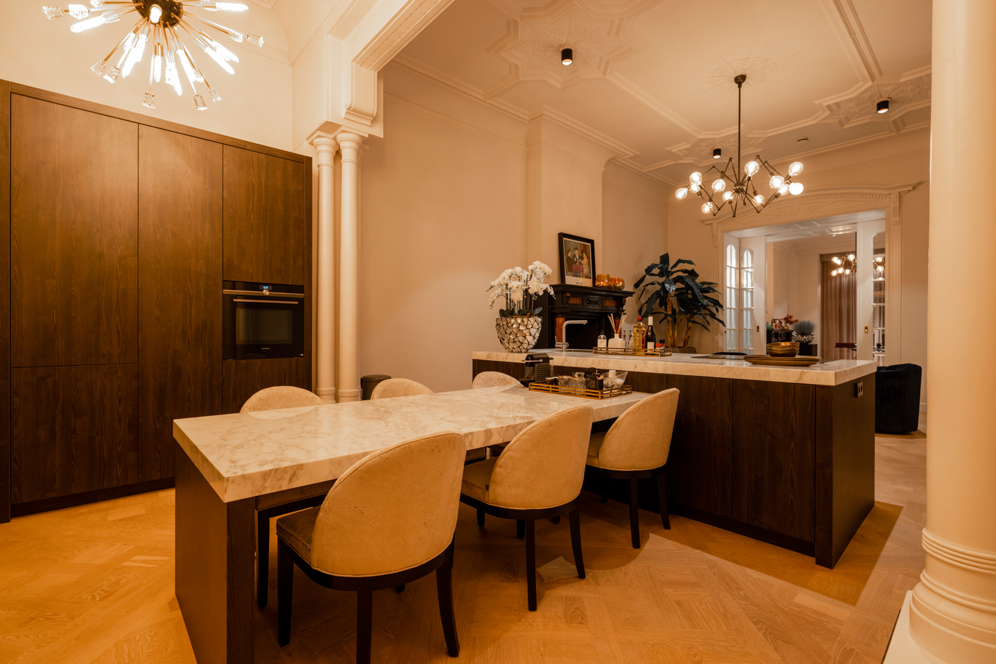 In een statig en breed pand uit begin vorige eeuw – gebouwd in de geliefde Belle Époque stijl met rode baksteen – vindt u dit uitzonderlijk luxe verbouwde appartement van maar liefst 245 m², verdeeld over twee woonlagen mét tuin. Een woning waarin hoogwaardige natuurlijke materialen, maatwerk en moderne luxe naadloos samenkomen.