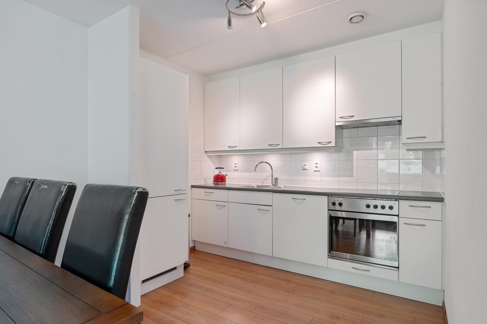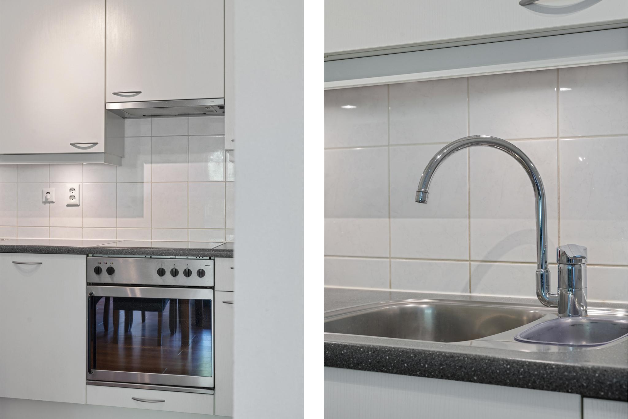 De open keuken aan de voorzijde is praktisch ingericht en compleet uitgerust met inbouwapparatuur zoals een oven, vaatwasser, elektrische kookplaat, een separate koelkast en voldoende kastruimte.
