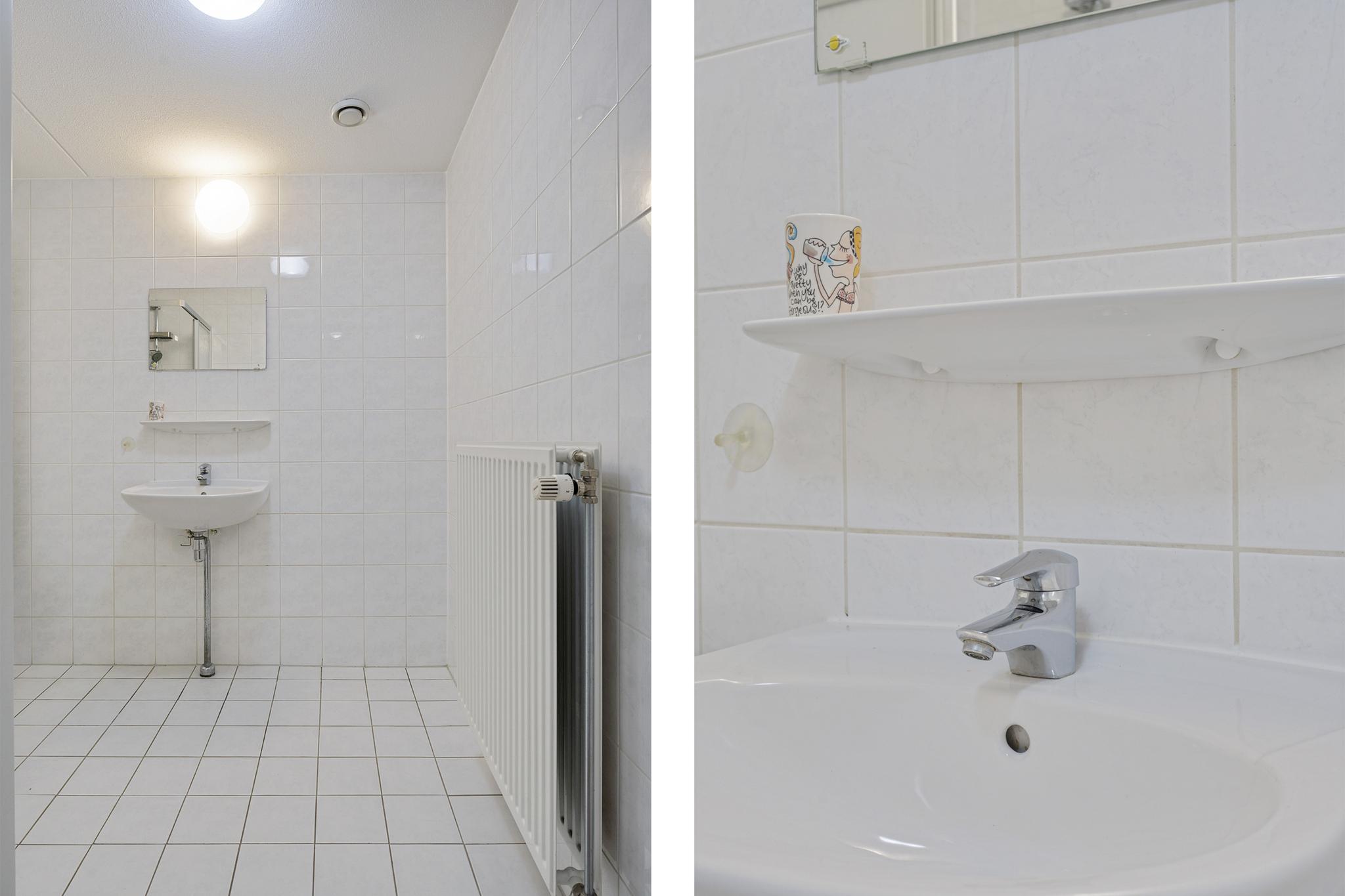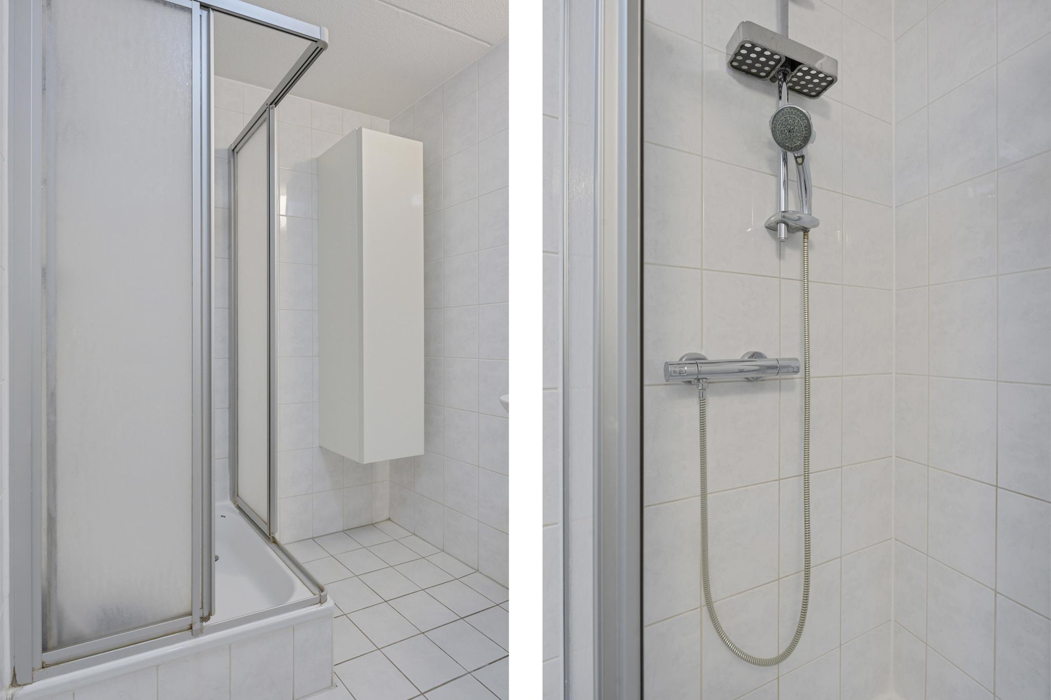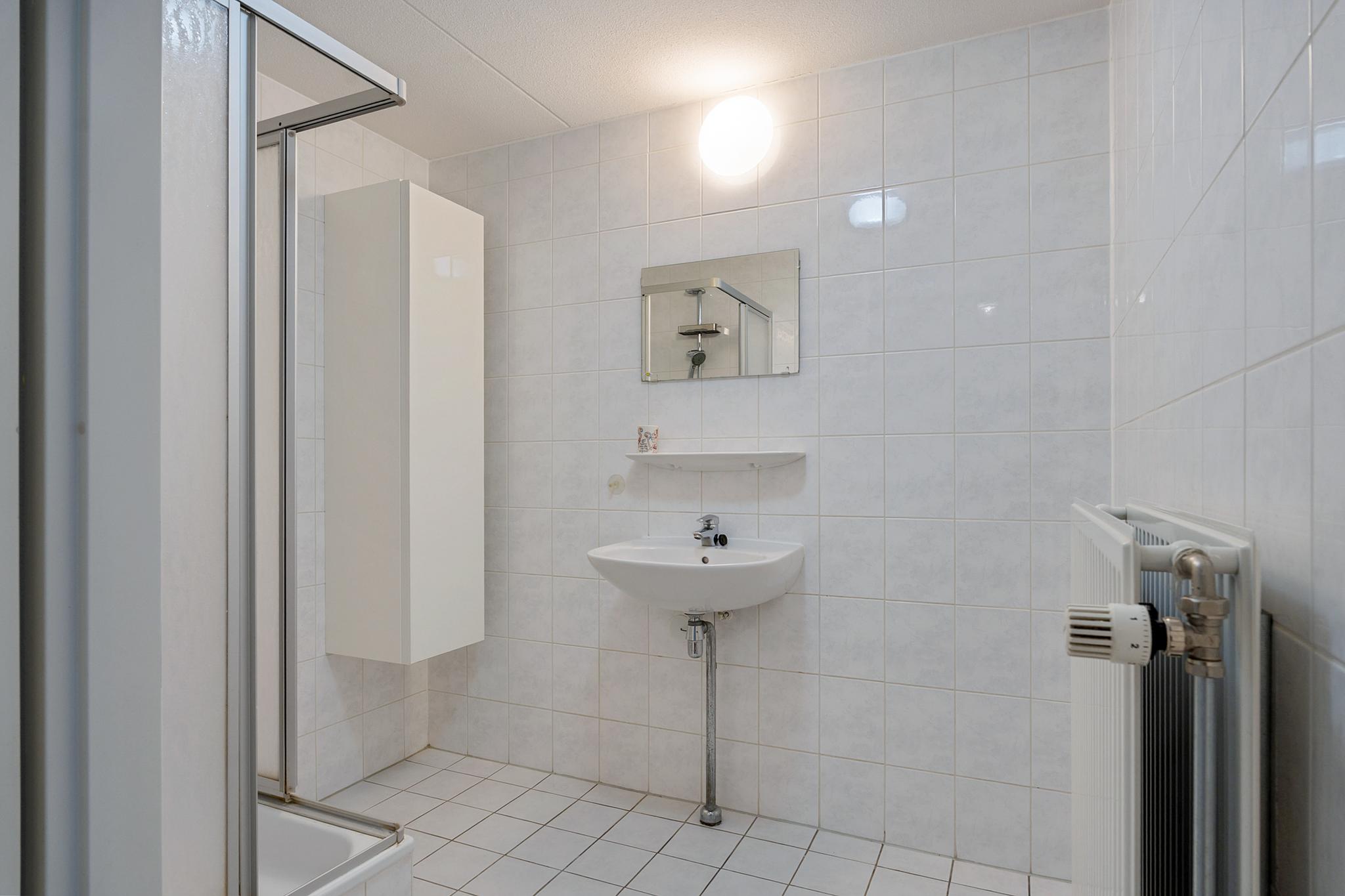 De volledig betegelde badkamer is functioneel ingedeeld met een douchecabine, wastafel en een vaste kast voor extra opbergruimte.