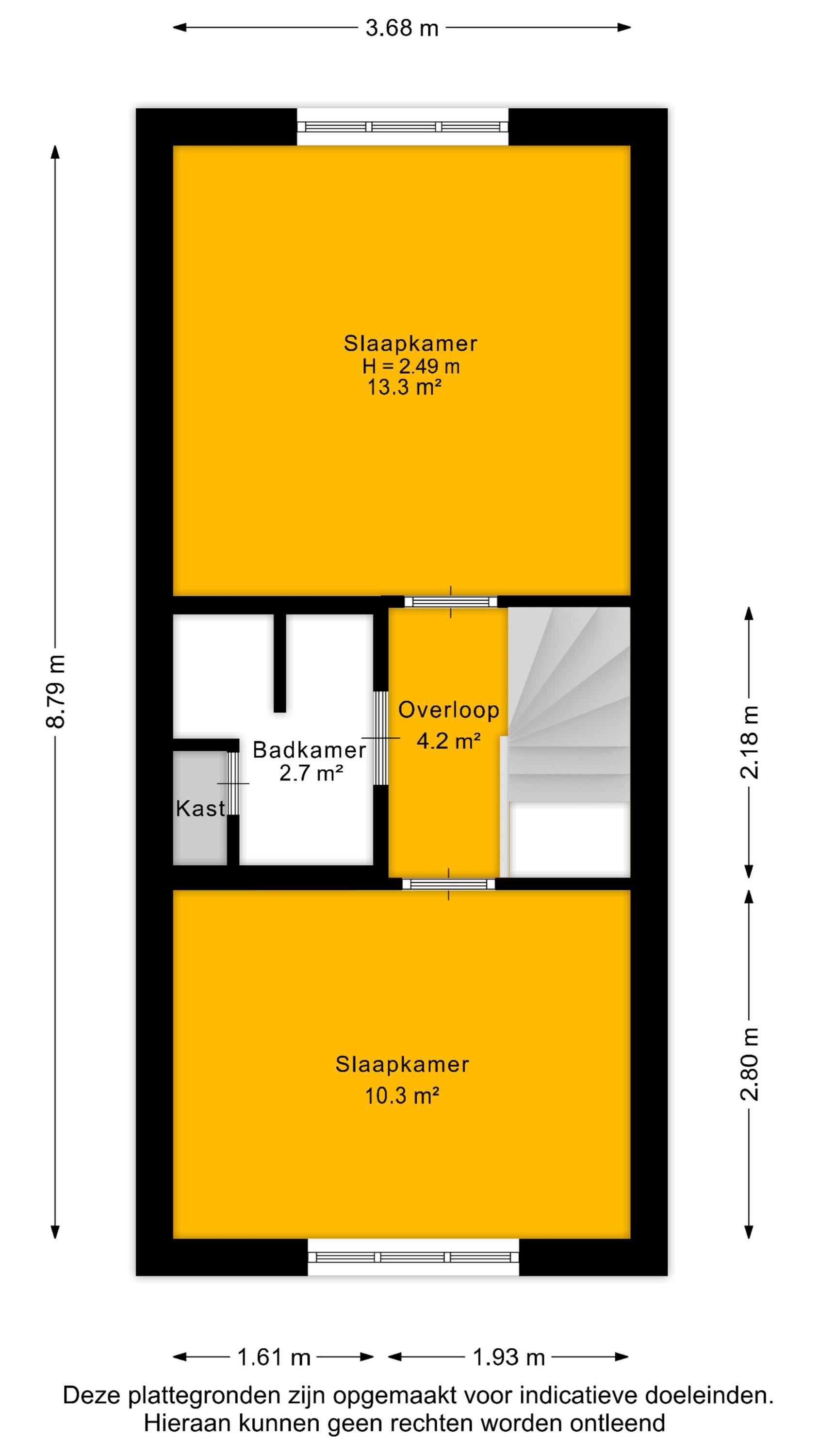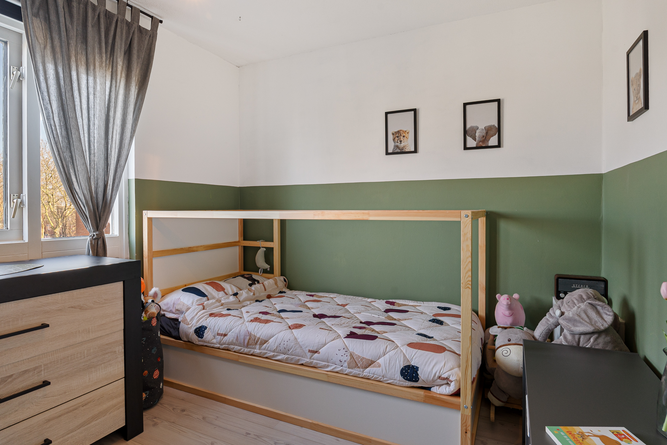 Via de trap bereikt u de slaapverdieping. De overloop geeft toegang tot twee goed bemeten slaapkamers van circa 13 m² en 10 m². De moderne badkamer is uitgerust met een inloopdouche, wastafelmeubel en opstelplaats voor de wasmachine.