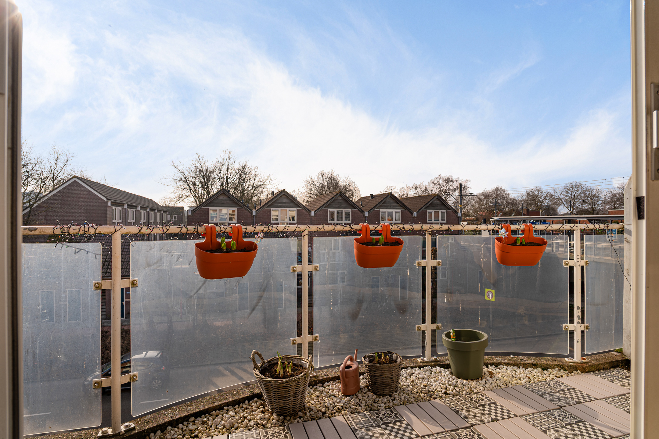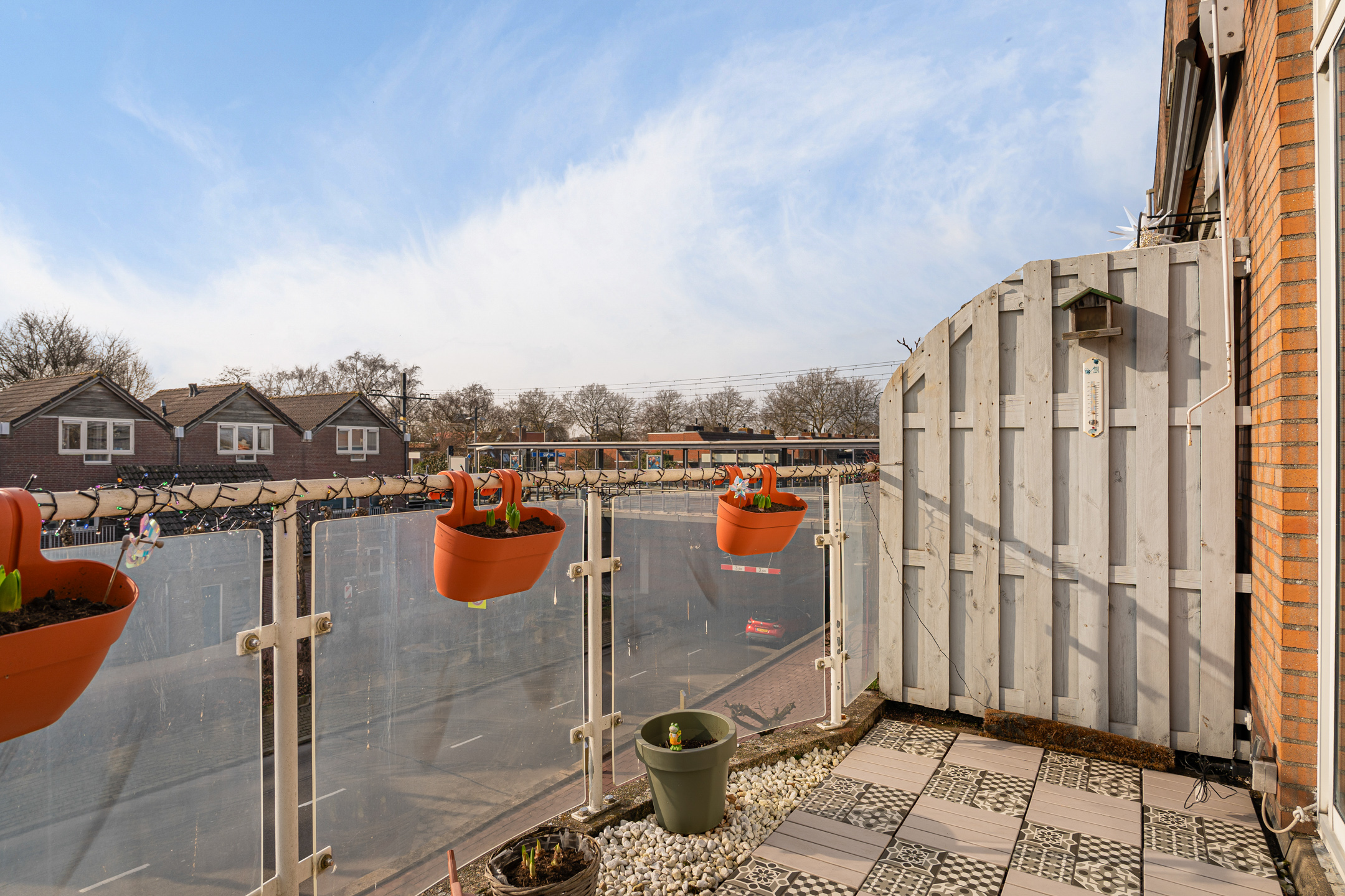 Aan de achterzijde ligt de lichte woonkamer met moderne laminaatvloer, praktische trapkast en schuifpui naar het zonnige balkon op het zuidwesten. Hier geniet u van middag- en avondzon.