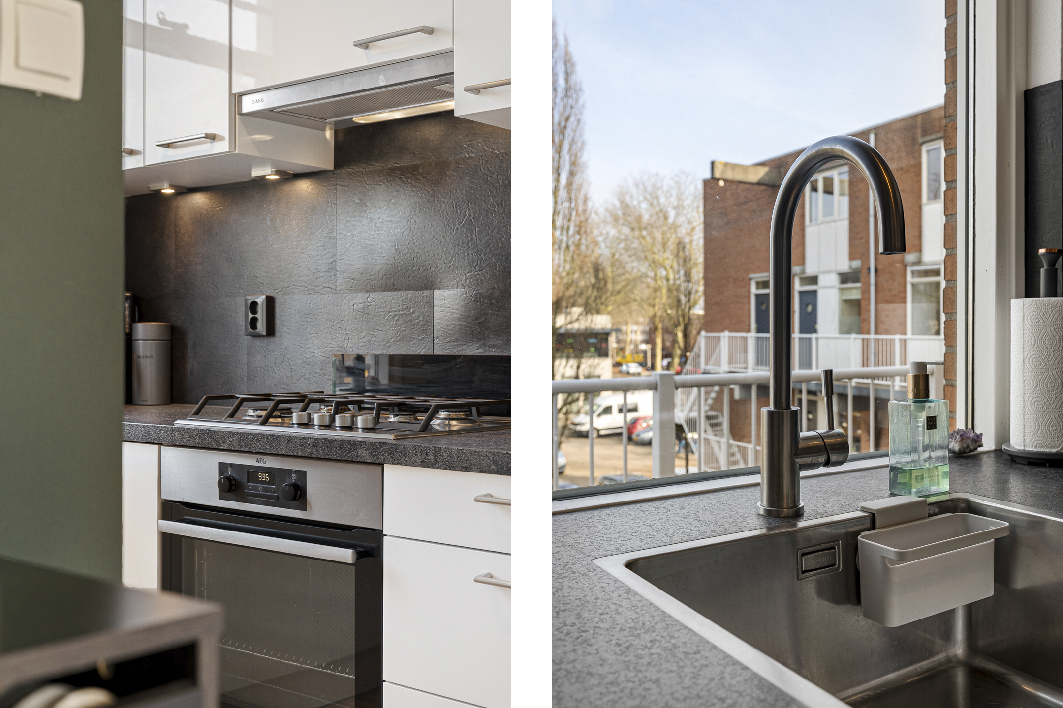 Aan de voorzijde bevindt zich de moderne keuken in hoekopstelling (2017), voorzien van diverse AEG inbouwapparatuur waaronder een vaatwasser, gasfornuis met oven, koel-/vriescombinatie en afzuigkap. De keuken biedt veel kastruimte en prettig daglicht.