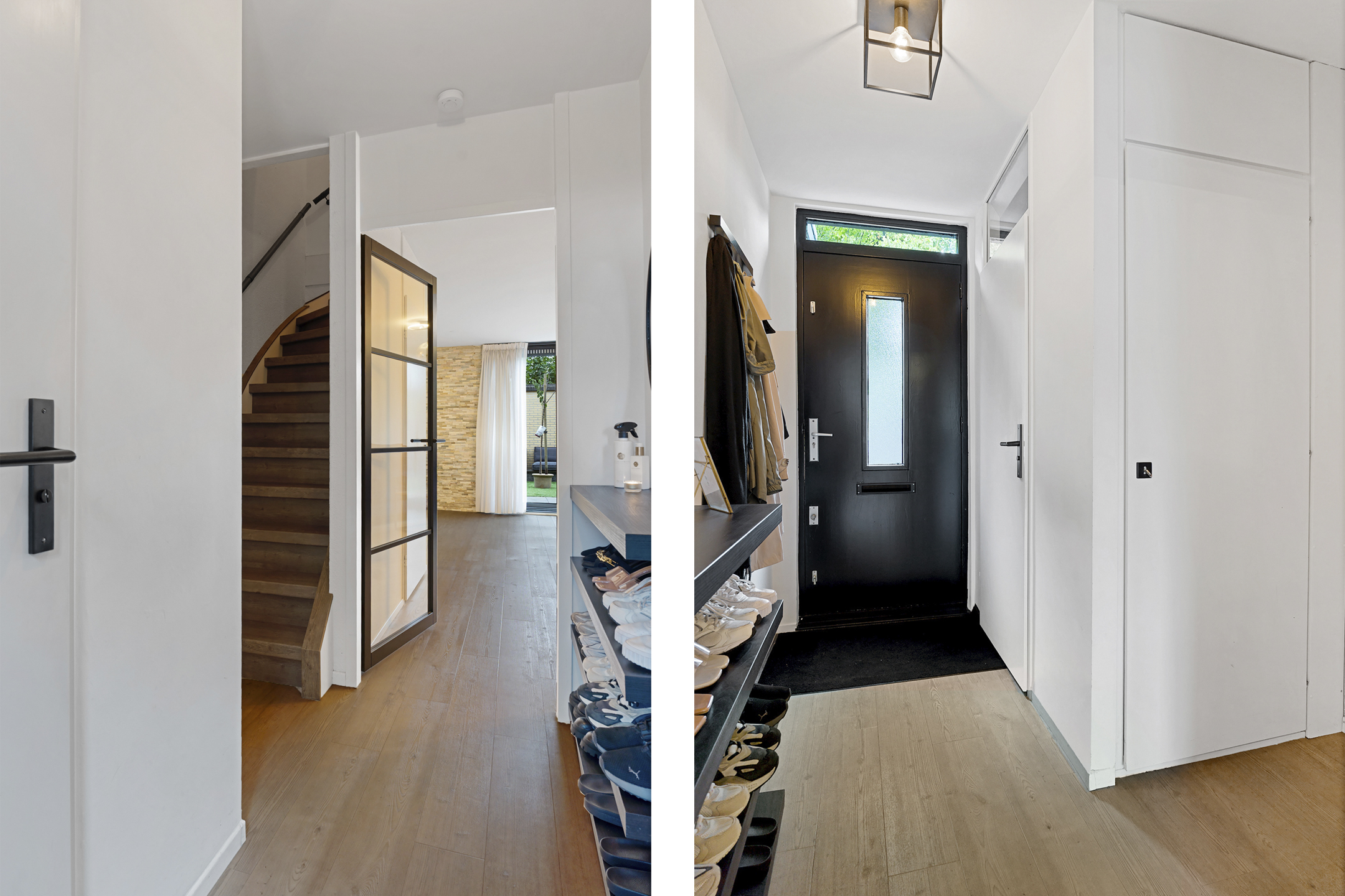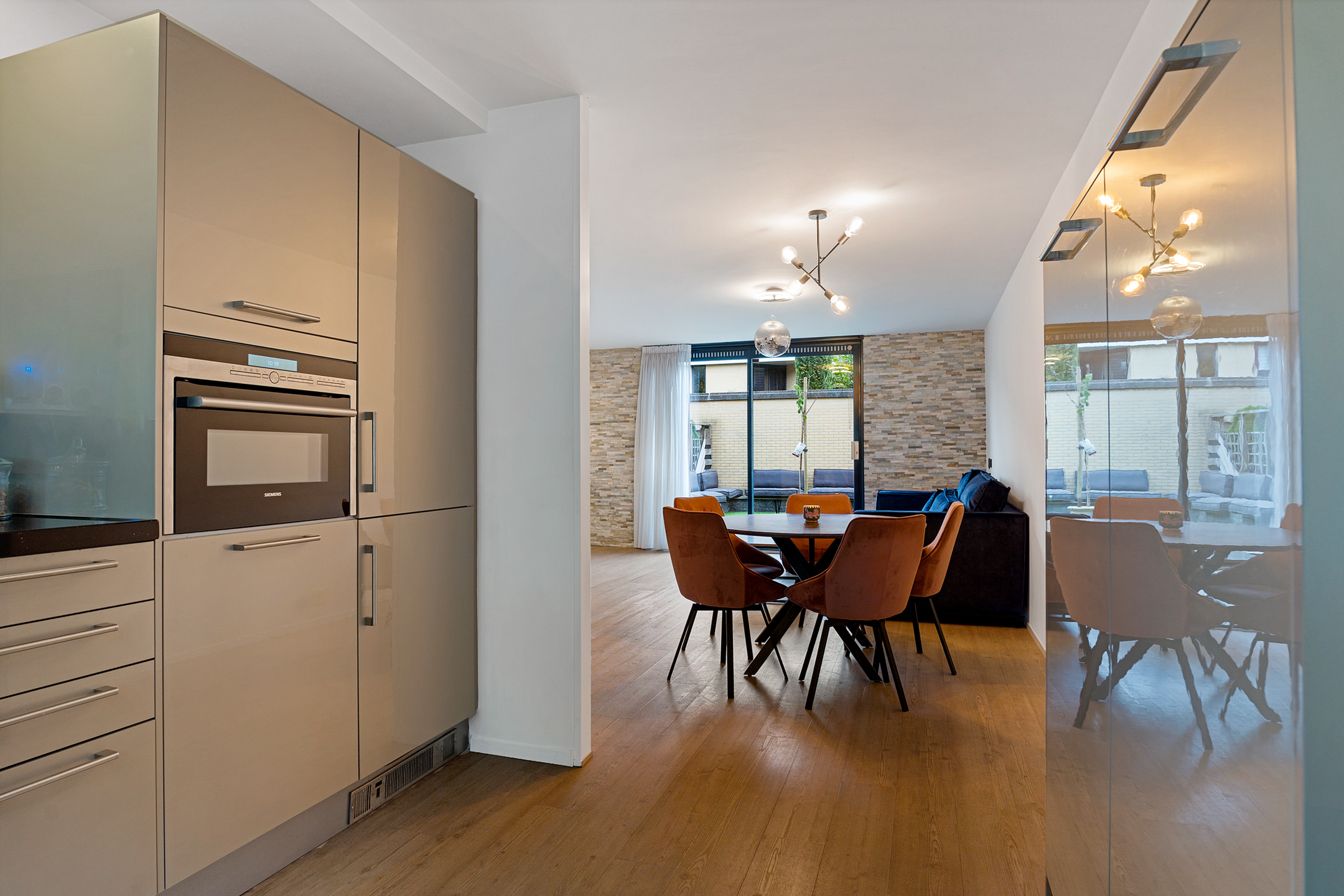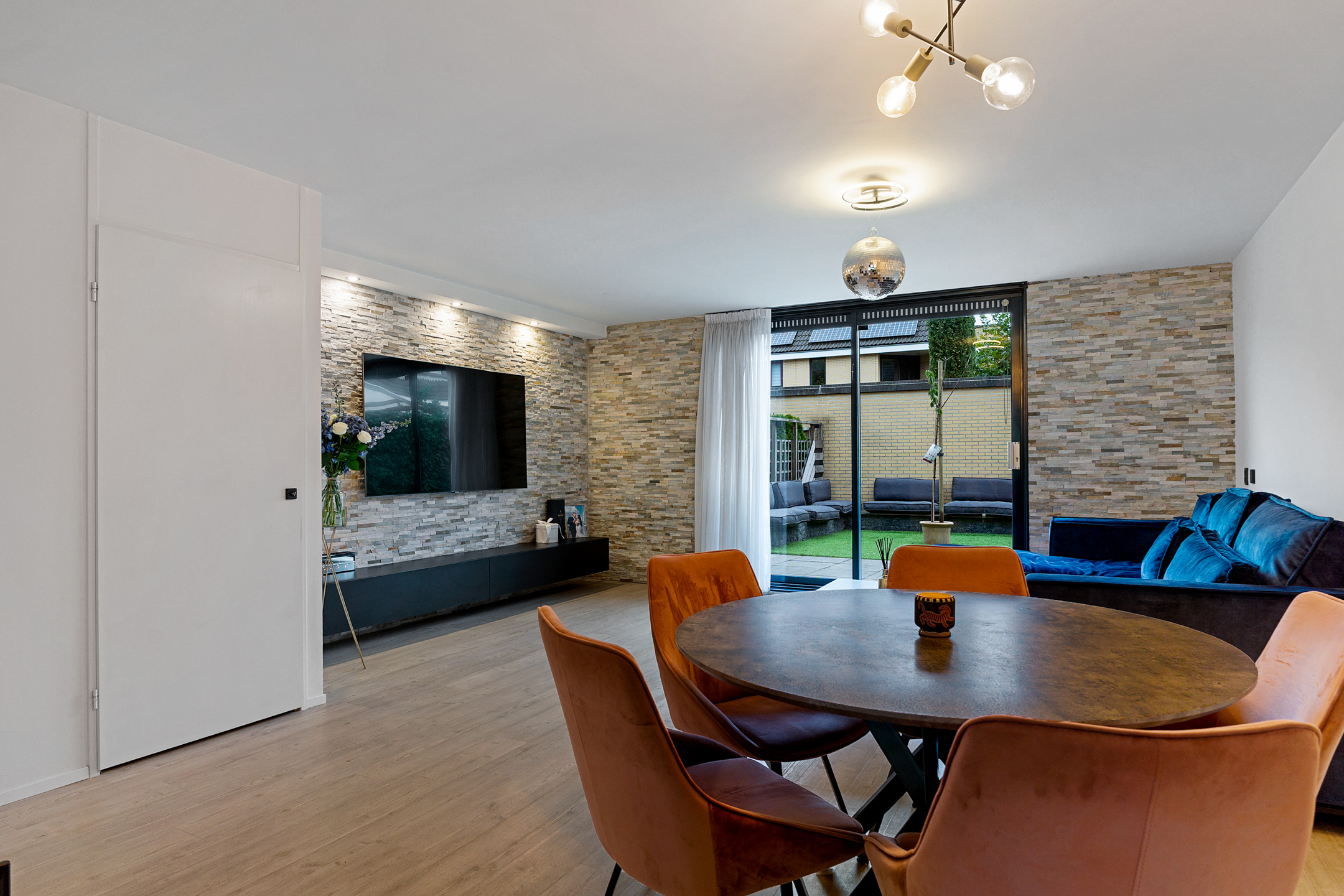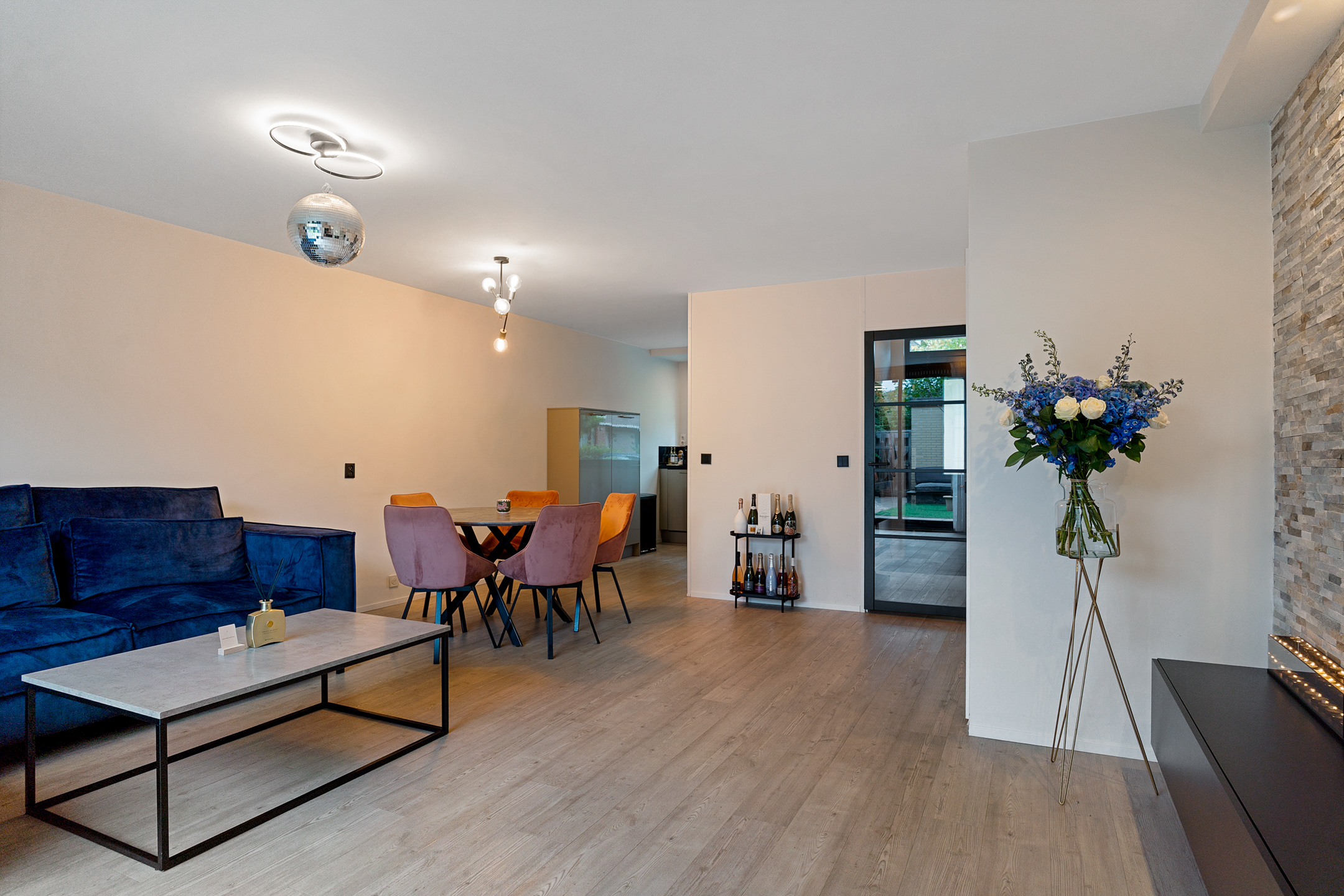 Je komt binnen in de hal met meterkast en modern toilet met fonteintje. De woonkamer is tuingericht, met pvc-vloer, vloerverwarming, trapkast, schuifpui naar de tuin en stijlvolle ledspots met smart?functie. De keuken is uitgevoerd in een hoekopstelling en is compleet met inductiekookplaat, vaatwasser, combimagnetron, koel-/vriescombinatie, close?in boiler, rvs-afzuigschouw en een steenachtig werkblad.