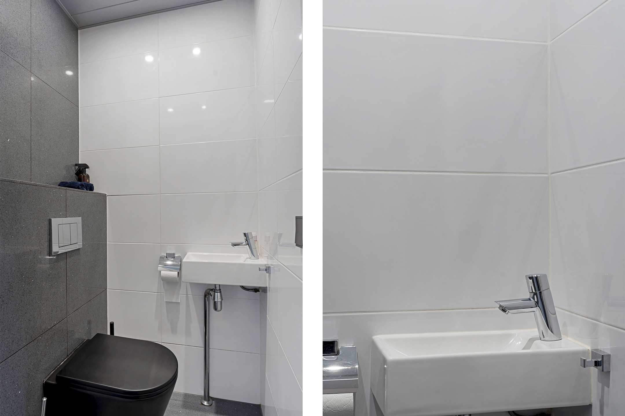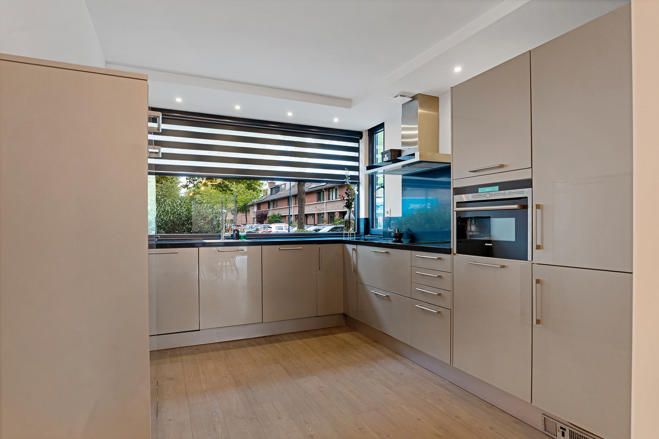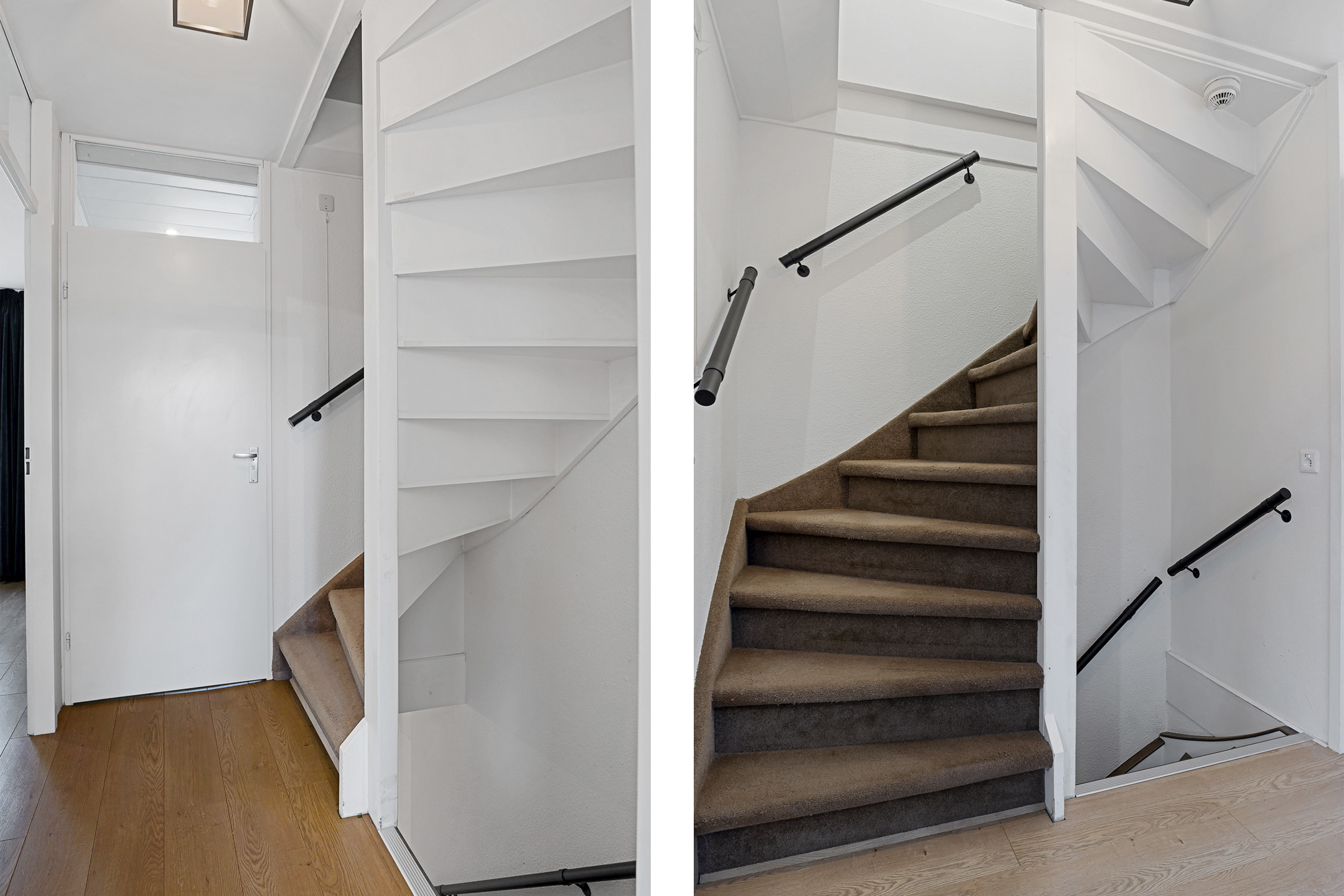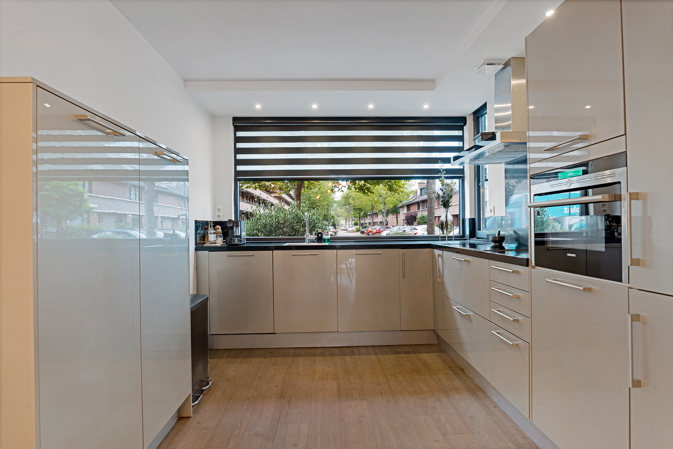 Je komt binnen in de hal met meterkast en modern toilet met fonteintje. De woonkamer is tuingericht, met pvc-vloer, vloerverwarming, trapkast, schuifpui naar de tuin en stijlvolle ledspots met smart?functie. De keuken is uitgevoerd in een hoekopstelling en is compleet met inductiekookplaat, vaatwasser, combimagnetron, koel-/vriescombinatie, close?in boiler, rvs-afzuigschouw en een steenachtig werkblad.